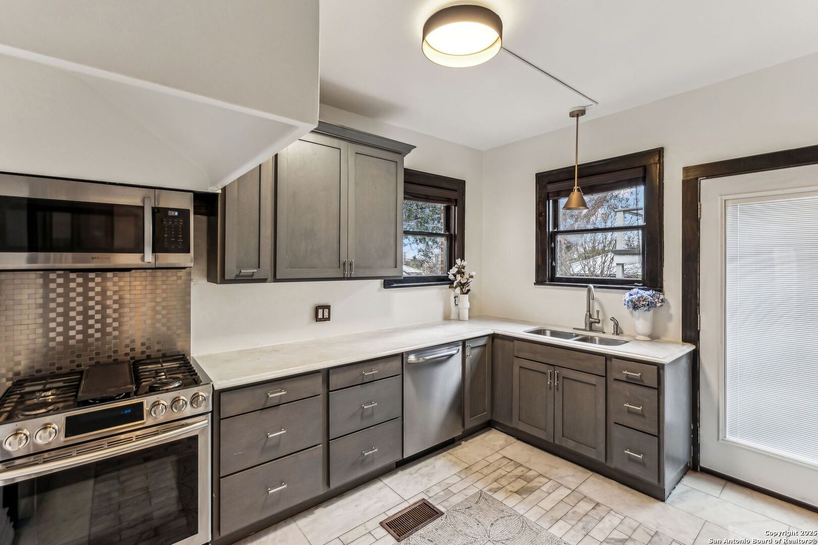 Wonderful duplex located on corner lot directly across from the San Antonio Country Club. Both upstairs and downstairs units boast sizeable living rooms and dinning rooms making for great entertaining. Downstairs unit also offers a covered patio and attached yard. The property includes a three car detached garage and dual entrances to both units, a front door and back door. Stainless steel appliances in the kitchens and washer/dryer included. All making for a fabulous opportunity!