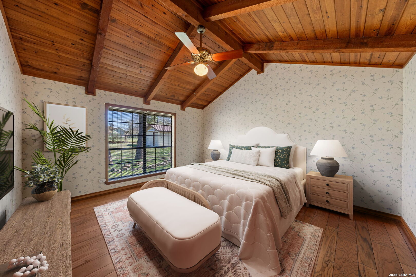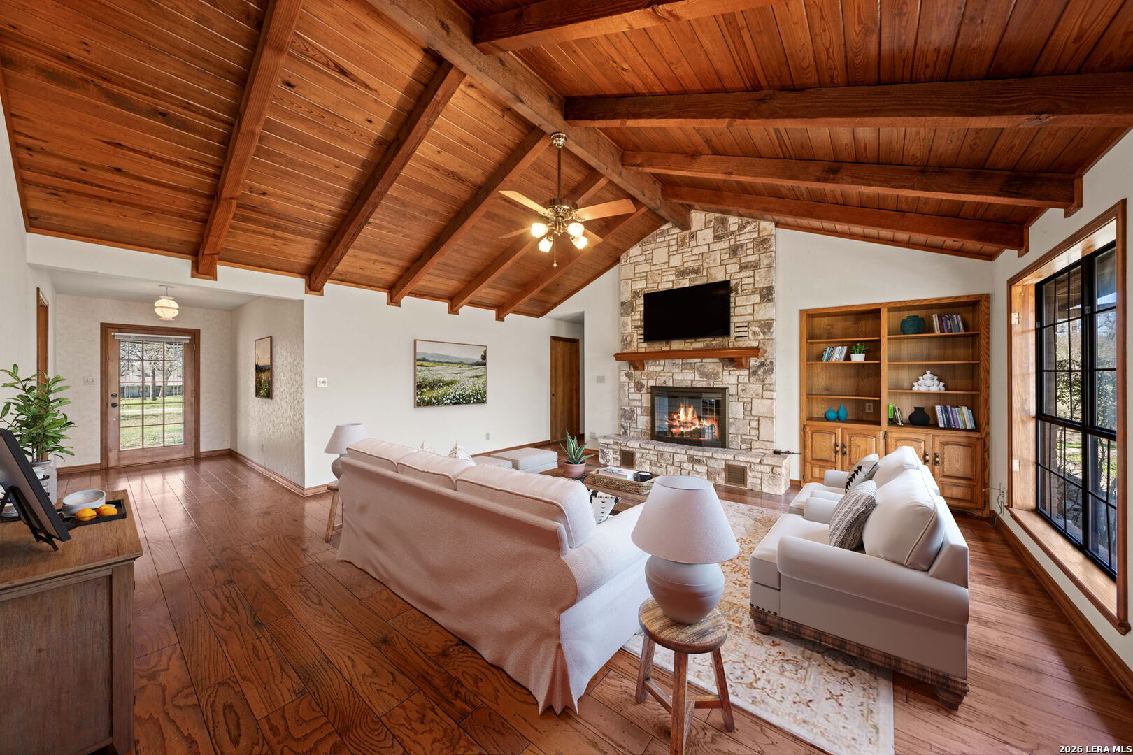 Escape to the charm of country living with this beautiful 3/2 home on nearly an acre! Step inside to warm hardwood floors and a striking vaulted wood ceiling that creates an open, inviting feel in both the living room and primary bedroom. The cozy fireplace makes the perfect centerpiece for relaxing evenings. Outside, you'll find mature trees and a peaceful, quiet neighborhood setting just minutes from Kerrville. The spacious lot offers room for RV parking, animals, and a garden ideal for those looking to enjoy a little extra space and freedom. A welcoming front porch provides the perfect spot to relax and take in the surroundings. The property also features a large workshop with endless possibilities perfect for projects, storage, or a creative space. An approximate 1,000-gallon underground water catchment system adds convenience for backyard irrigation. Endless possibilities await!