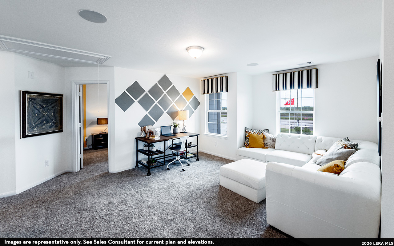 Our grandest home in the Cobalt Series, the Trinity floor plan boasts an impressive two-story floor plan that is sure to suit most any lifestyle. Upon entry, you are first greeted by the private study room that also has the option of transforming into a fifth bedroom if you would rather have the space for more guests to visit. Next, you will find the access to your convenient downstairs powder room, a walk-in utility room, as well as the entry to your two-car garage. Needing more storage for extra tools or supplies? Opt to swap your standard two-car garage for a sizable two-and-a-half-car garage! Down the hall, you will reach the heart of your home - the massive, two-story family room with soaring ceilings and consisting of plenty of natural light. Opening up to the family room is the convenient adjoined kitchen and breakfast area with access to your optional extended covered patio. Your elegant kitchen comes fully equipped with industry-leading appliances, sleek granite countertops with a ceramic tile backsplash, designer light fixtures, and the option to put in an island and extra cabinets if you desire more counterspace. With features like these, you will want to cook every meal! Completing the first floor is your secluded Master suite with your master bathroom containing the cultured marble countertops with option of dual vanities, a shower/bathtub enclosure, and a huge walk- in closet. Upgrade your bathroom space to include a master luxury bath with stand alone shower or a master super shower instead! Both options come with standard dual vanities for your convenience. Finally, up the stairs you will discover a fantastic gameroom perfect for hosting the ultimate game night, as well as the second, third, and fourth remaining bedrooms. The full secondary bathroom also lies upstairs between the second and third bedrooms. The Trinity has the perfect amount of space for the entire family. You won't compromise your comfort and functionality in the Trinity floor plan!