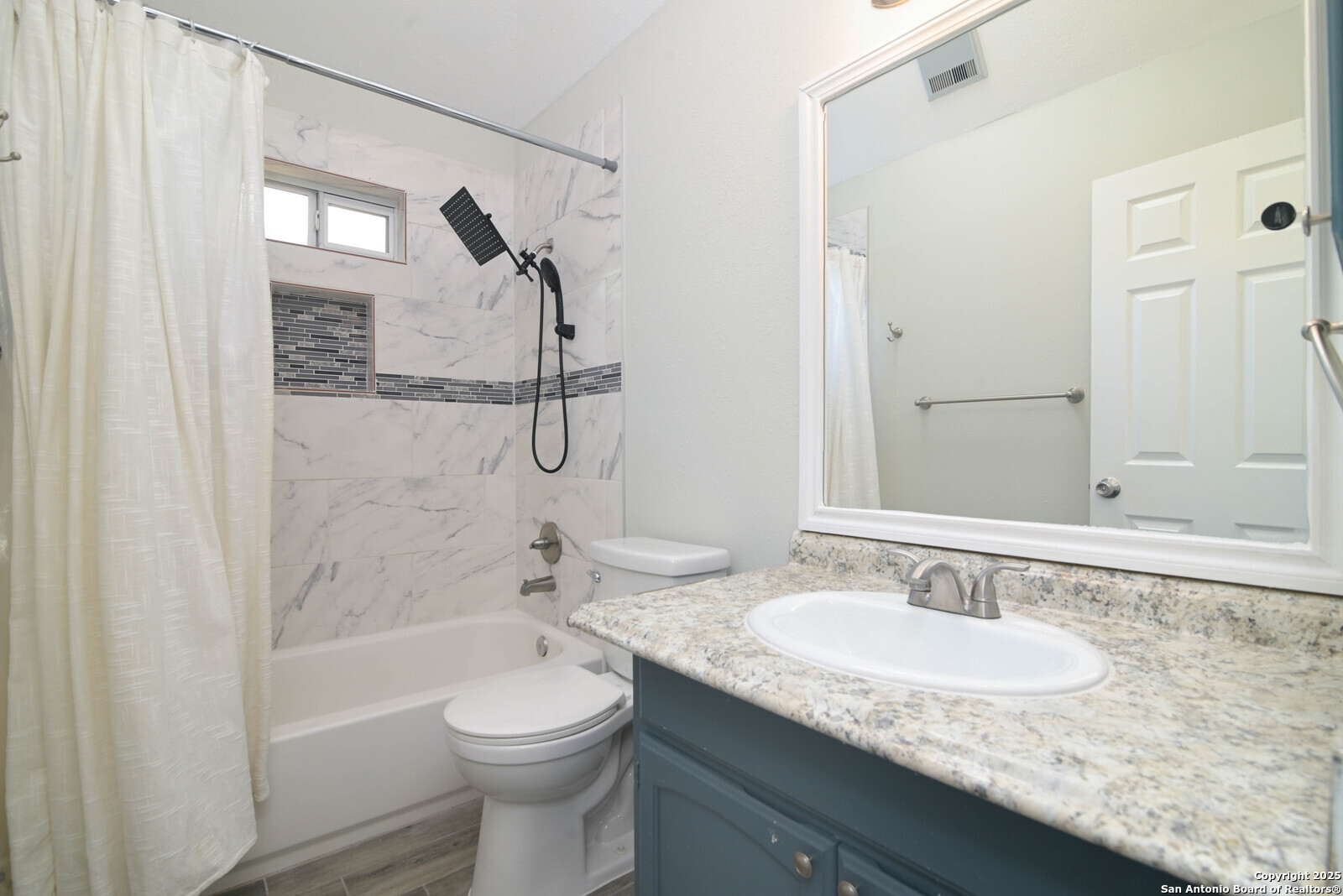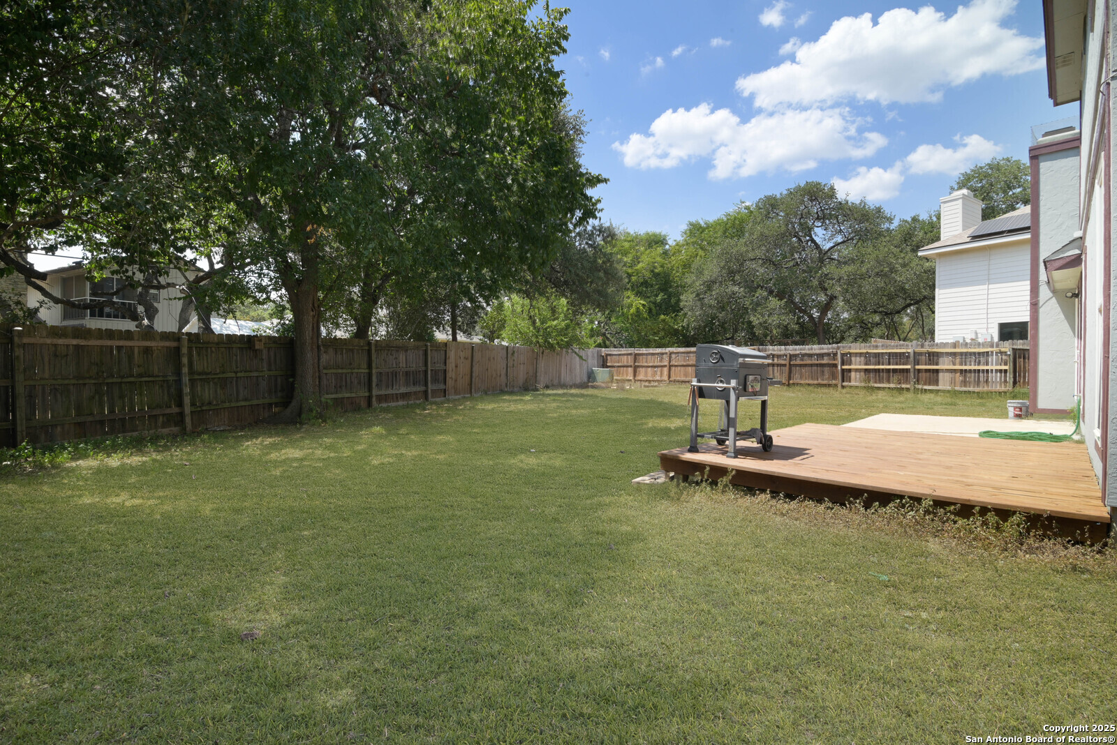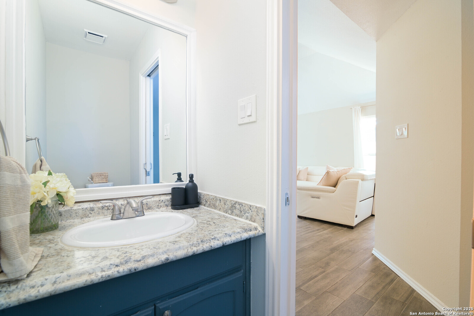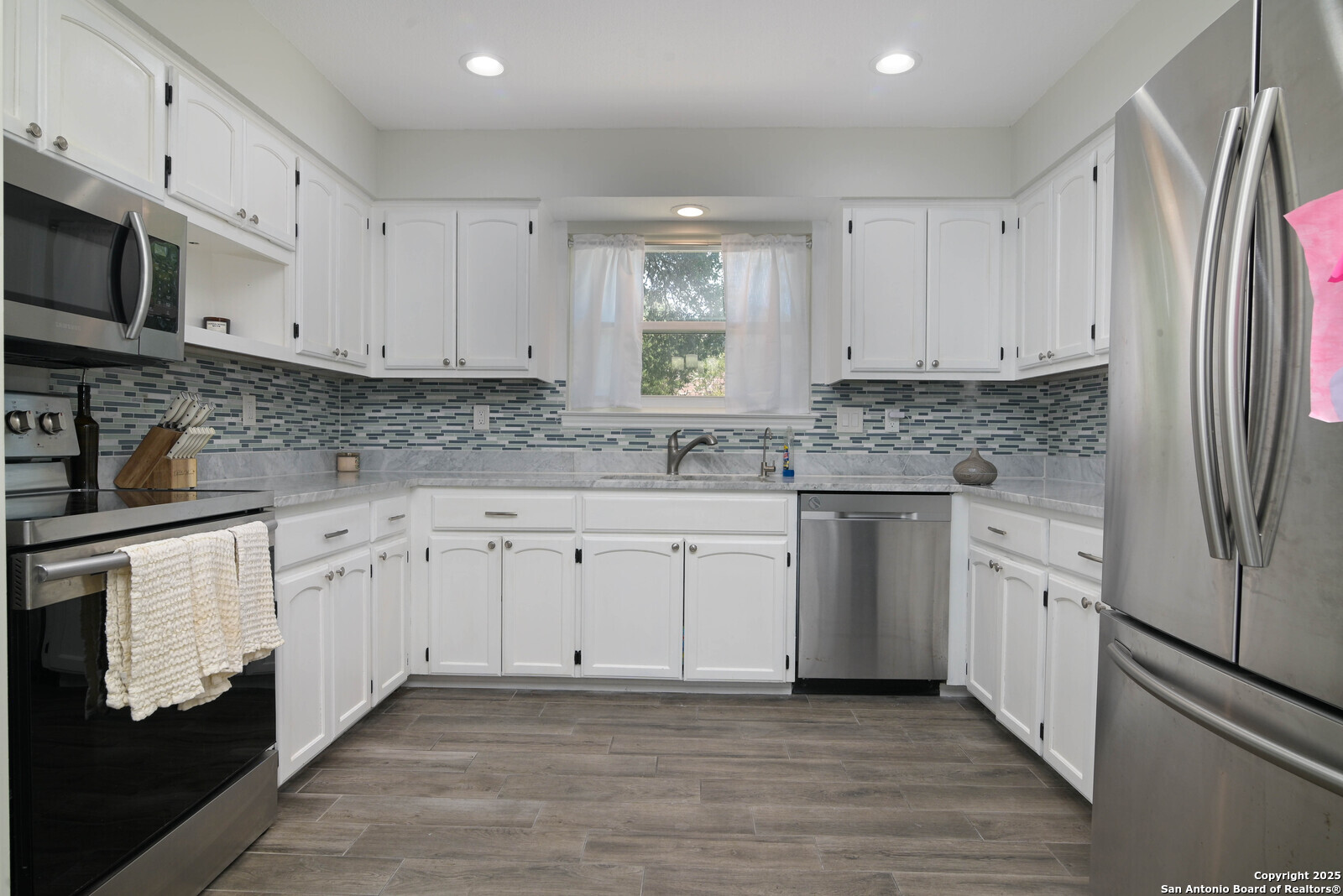 Nicely updated home in Canyon Oaks Subdivision with open design to enjoy with family and friends. Great location - easy access to 1604 and 281 but conveniently situated inside this excellent neighborhood near a cul-de-sac. This home has ample and well illuminated spaces to enjoy with family and friends with this open concept combining the living room, dinning room and kitchen. Stainless steel appliances, quartz countertops and white cabinets give a fresh and elegant look to the kitchen. Master bedroom is conveniently located in the first floor with ensuite bathroom with double vanities and walking closet. 2 more bedrooms and a bathroom are located upstairs. -NO CARPET- wood-look plank tile throughout the house. The 2 car garage was conveniently converted into 1 car garage, integrating another room to the house which can be perfectly used for home office, studio or another bedroom. Enjoy the large backyard with mature trees and wooden porch after a long day of work.