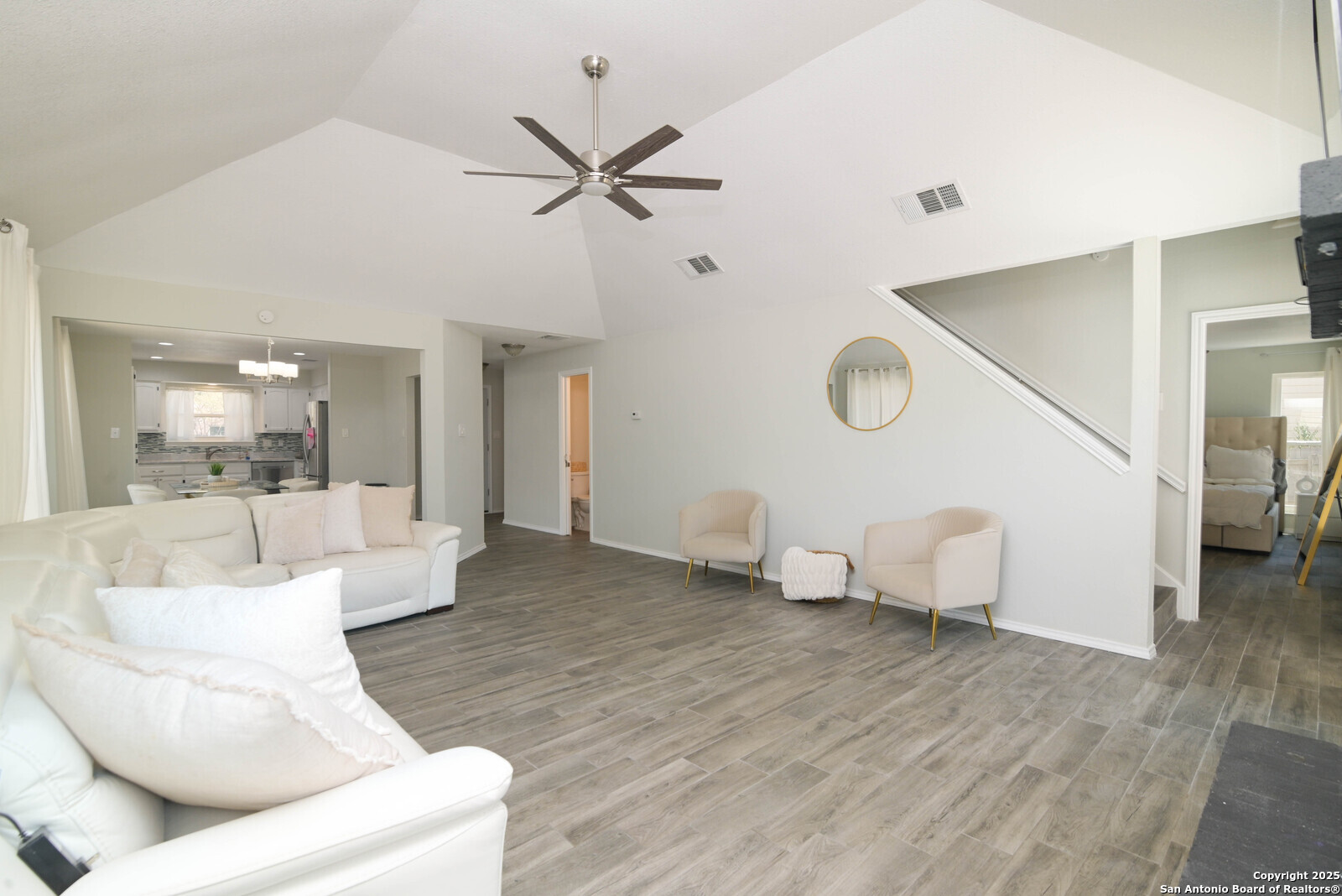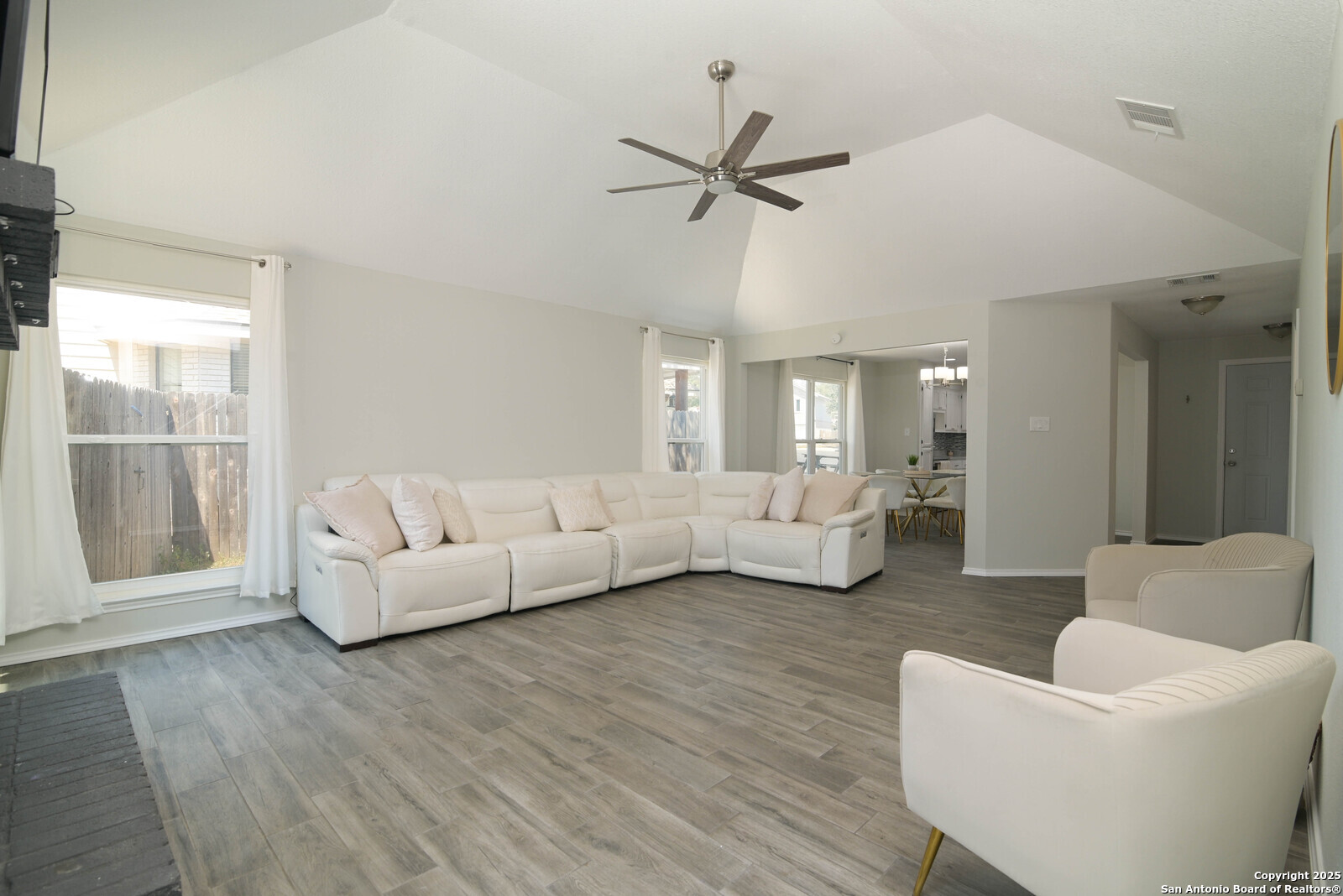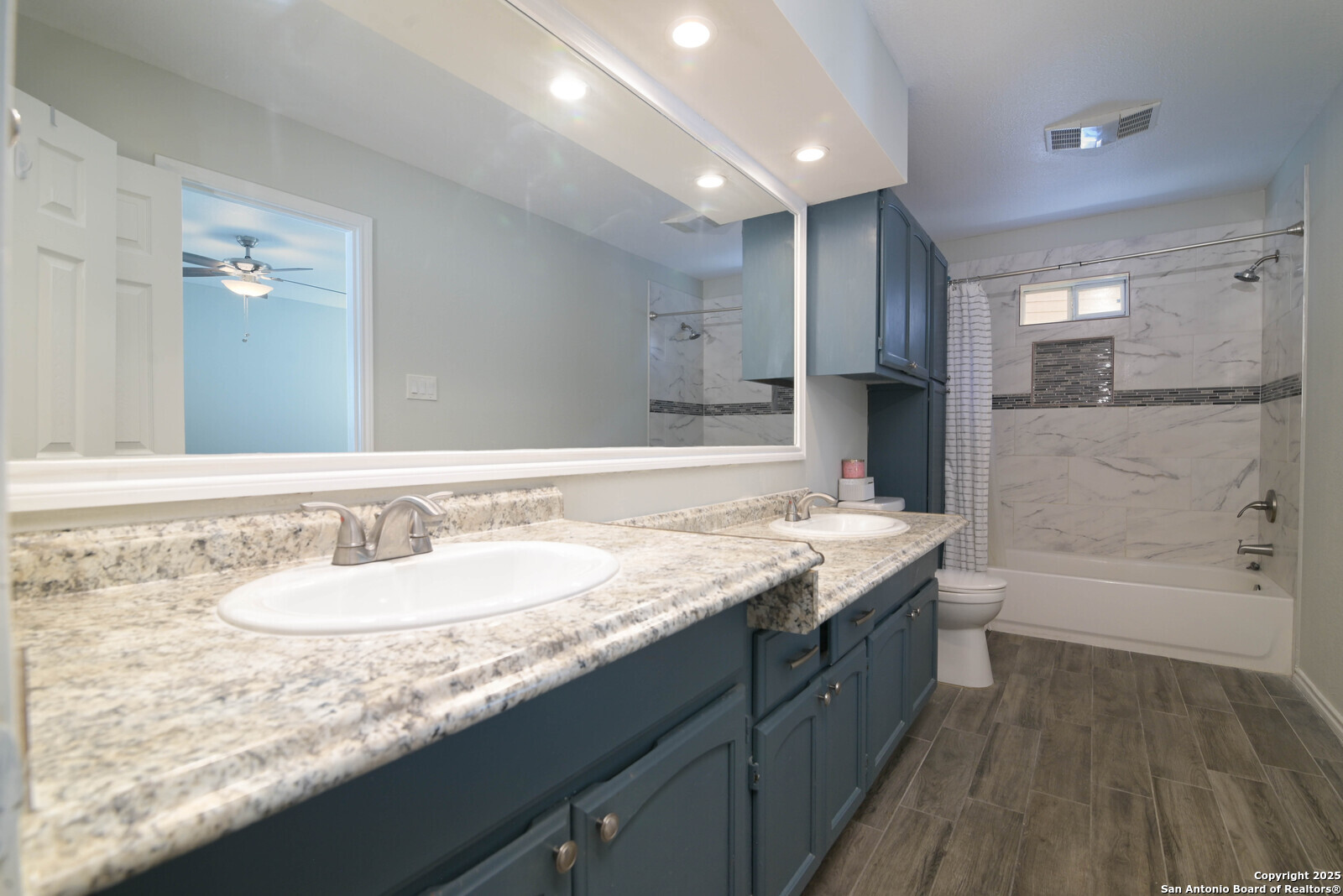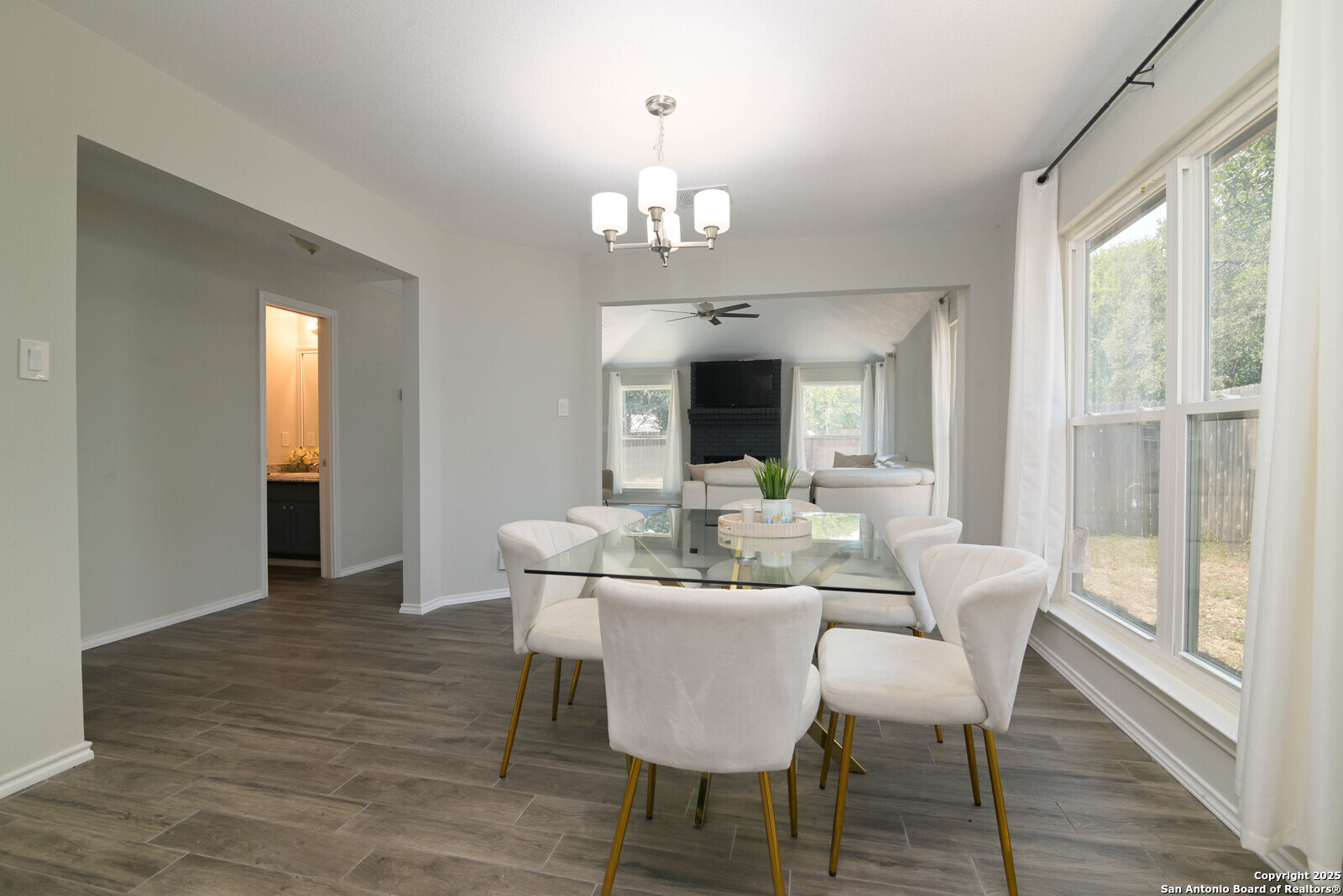 Nicely updated home in Canyon Oaks Subdivision with open design to enjoy with family and friends. Great location - easy access to 1604 and 281 but conveniently situated inside this excellent neighborhood near a cul-de-sac. This home has ample and well illuminated spaces to enjoy with family and friends with this open concept combining the living room, dinning room and kitchen. Stainless steel appliances, quartz countertops and white cabinets give a fresh and elegant look to the kitchen. Master bedroom is conveniently located in the first floor with ensuite bathroom with double vanities and walking closet. 2 more bedrooms and a bathroom are located upstairs. -NO CARPET- wood-look plank tile throughout the house. The 2 car garage was conveniently converted into 1 car garage, integrating another room to the house which can be perfectly used for home office, studio or another bedroom. Enjoy the large backyard with mature trees and wooden porch after a long day of work.
