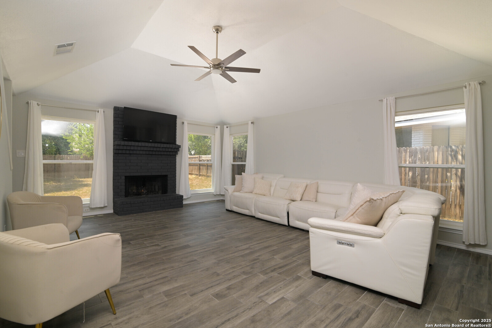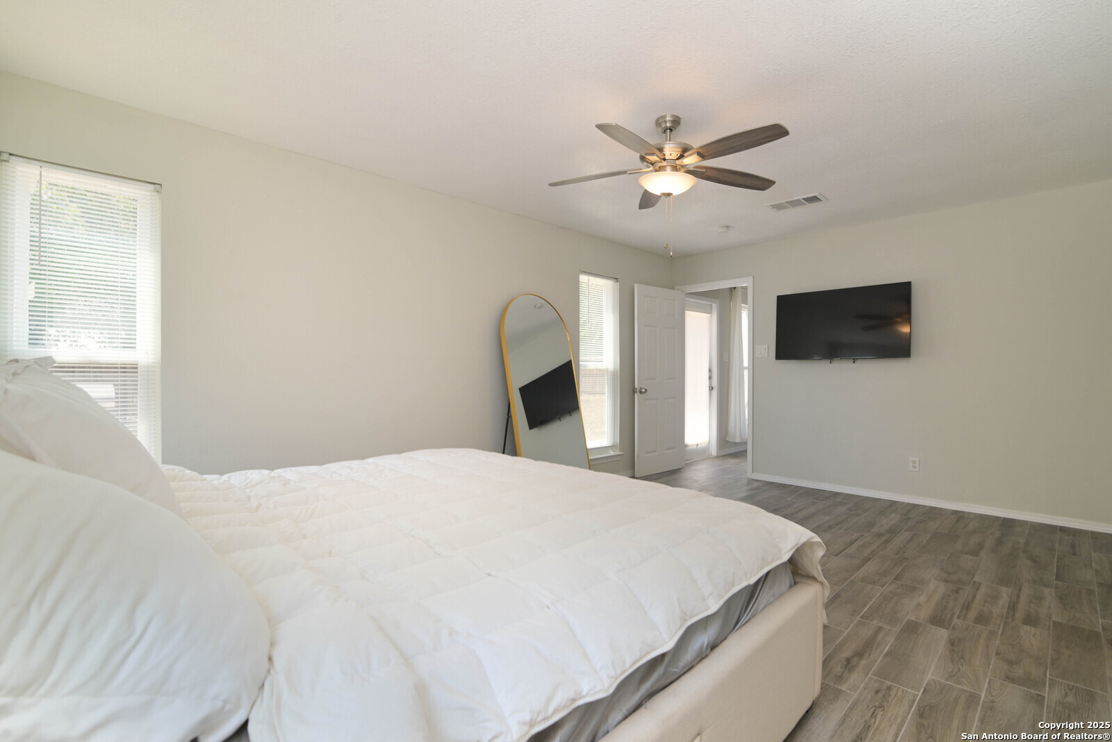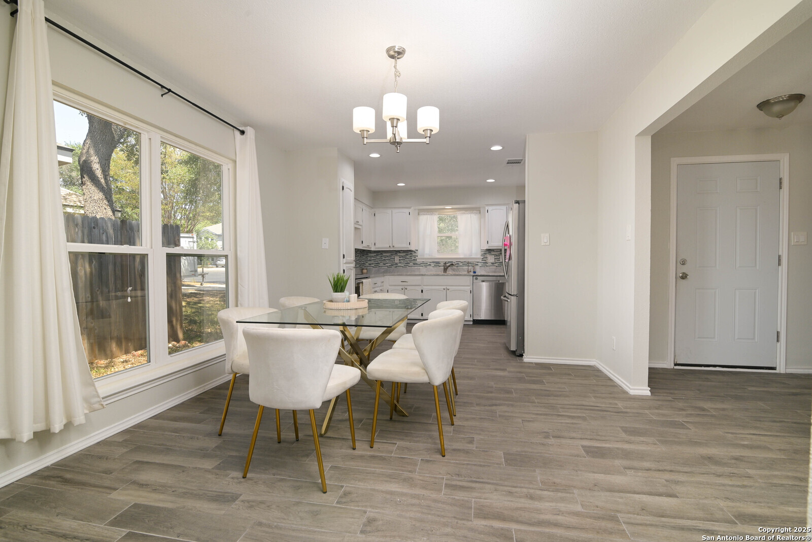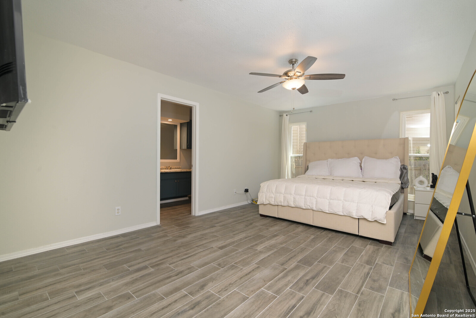 Nicely updated home in Canyon Oaks Subdivision with open design to enjoy with family and friends. Great location - easy access to 1604 and 281 but conveniently situated inside this excellent neighborhood near a cul-de-sac. This home has ample and well illuminated spaces to enjoy with family and friends with this open concept combining the living room, dinning room and kitchen. Stainless steel appliances, quartz countertops and white cabinets give a fresh and elegant look to the kitchen. Master bedroom is conveniently located in the first floor with ensuite bathroom with double vanities and walking closet. 2 more bedrooms and a bathroom are located upstairs. -NO CARPET- wood-look plank tile throughout the house. The 2 car garage was conveniently converted into 1 car garage, integrating another room to the house which can be perfectly used for home office, studio or another bedroom. Enjoy the large backyard with mature trees and wooden porch after a long day of work.
