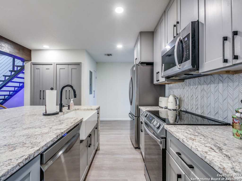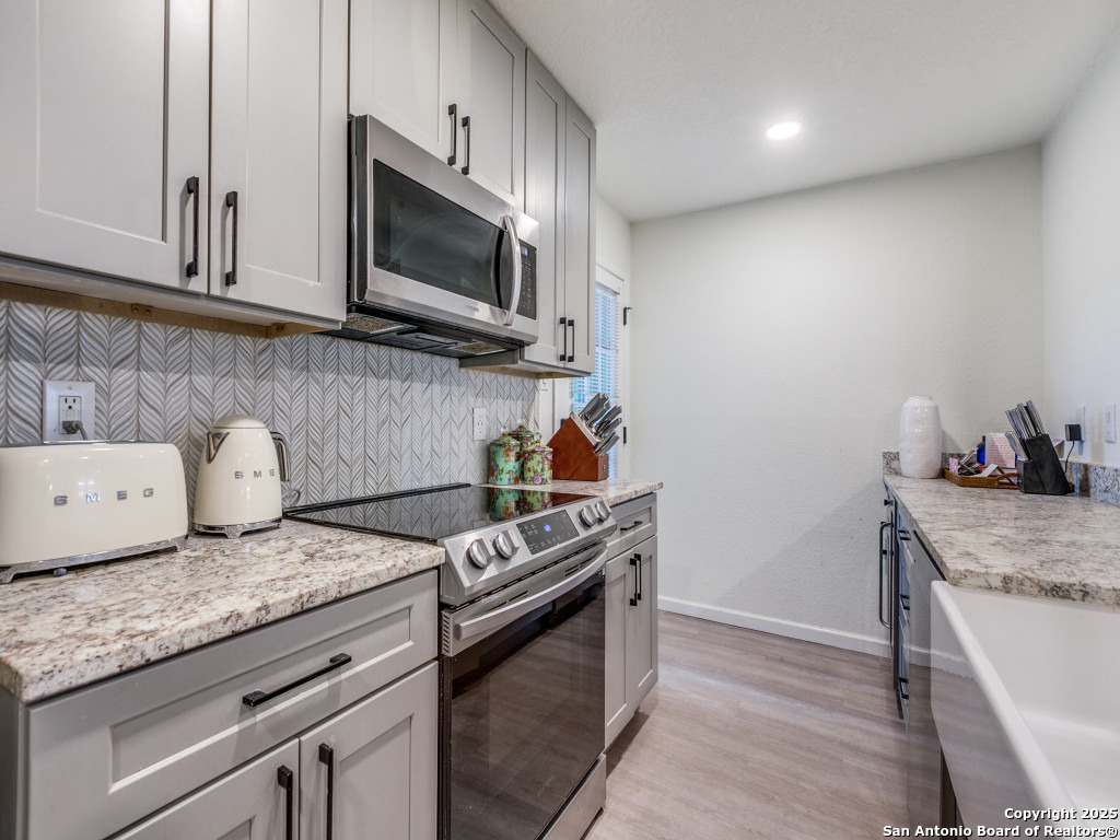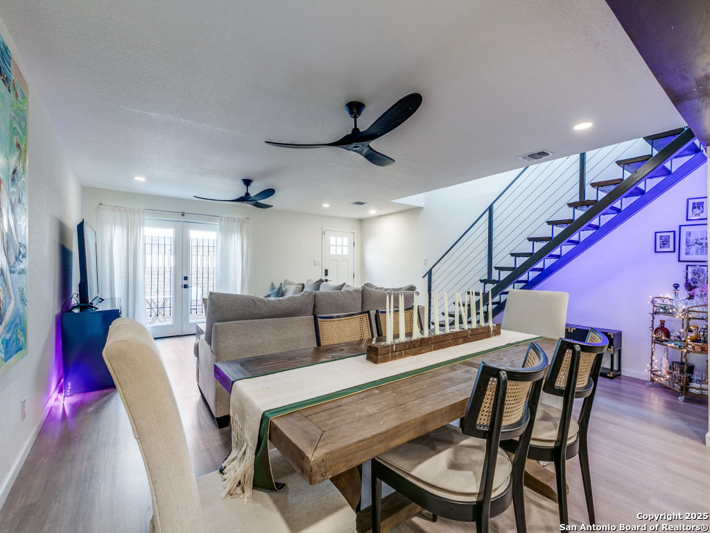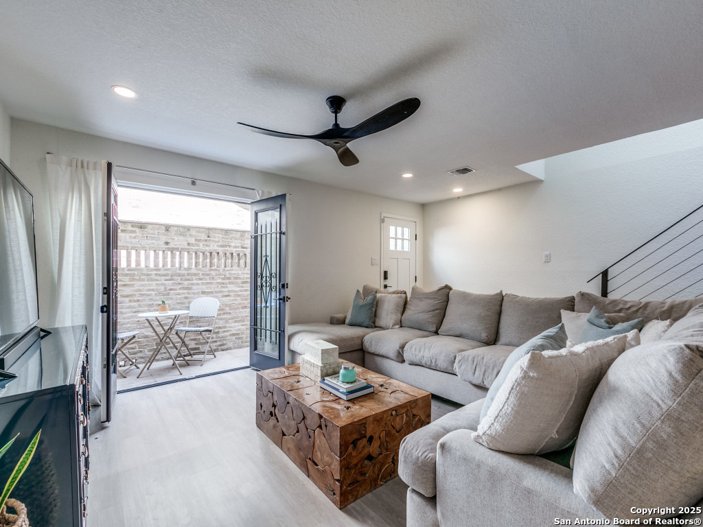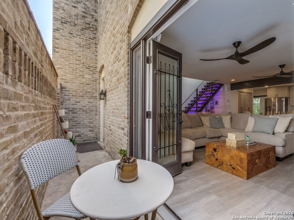 Experience modern living at its finest in this stunning townhome, a true jewel nestled in one of San Antonio's most sought after neighborhoods. Thoughtfully designed with finishes typically reserved for a much higher price point, this residence offers an exceptional blend of luxury, style, and convenience. Ideally located just steps from coffee shops, acclaimed restaurants, and Central Market, the home delivers a walkable lifestyle in a premier setting. Inside, an open concept floor plan creates a seamless flow between the living, dining, and kitchen areas, perfect for both everyday living and entertaining. The living room opens to a charming private outdoor area, creating an inviting extension of the home and the perfect setting for morning coffee or relaxed evenings. The chef's kitchen is a standout, featuring granite countertops, a striking waterfall island with additional storage, stainless steel appliances, soft close cabinetry, a farmhouse sink, and a built-in wine fridge. Floating stairs, illuminated by a skylight, lead to the second level where you'll find a spacious primary suite with a generous walk-in closet and spa inspired en-suite bath, along with a secondary bedroom and full bathroom. A well appointed half bath on the main level adds convenience for guests. Located within a gated community offering secure parking and dedicated bicycle storage, this home is just minutes from downtown and the very best of San Antonio living.
