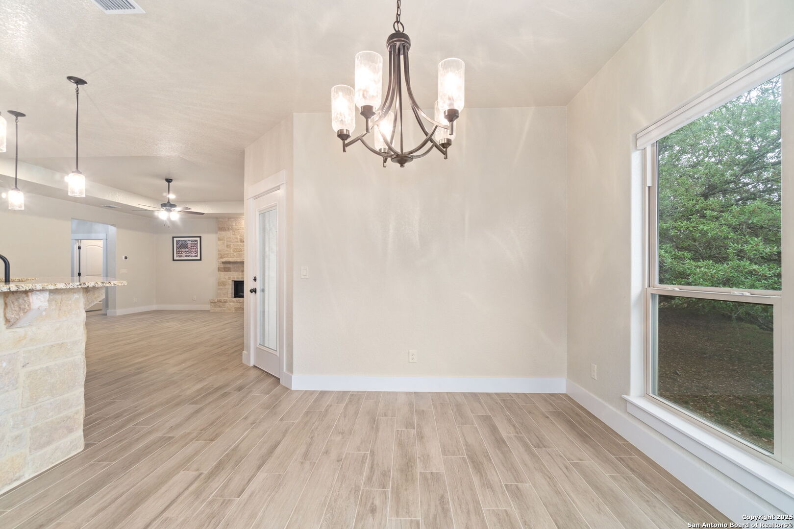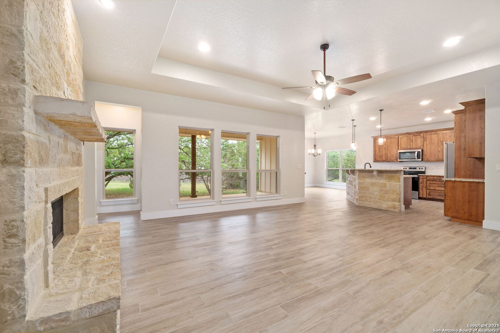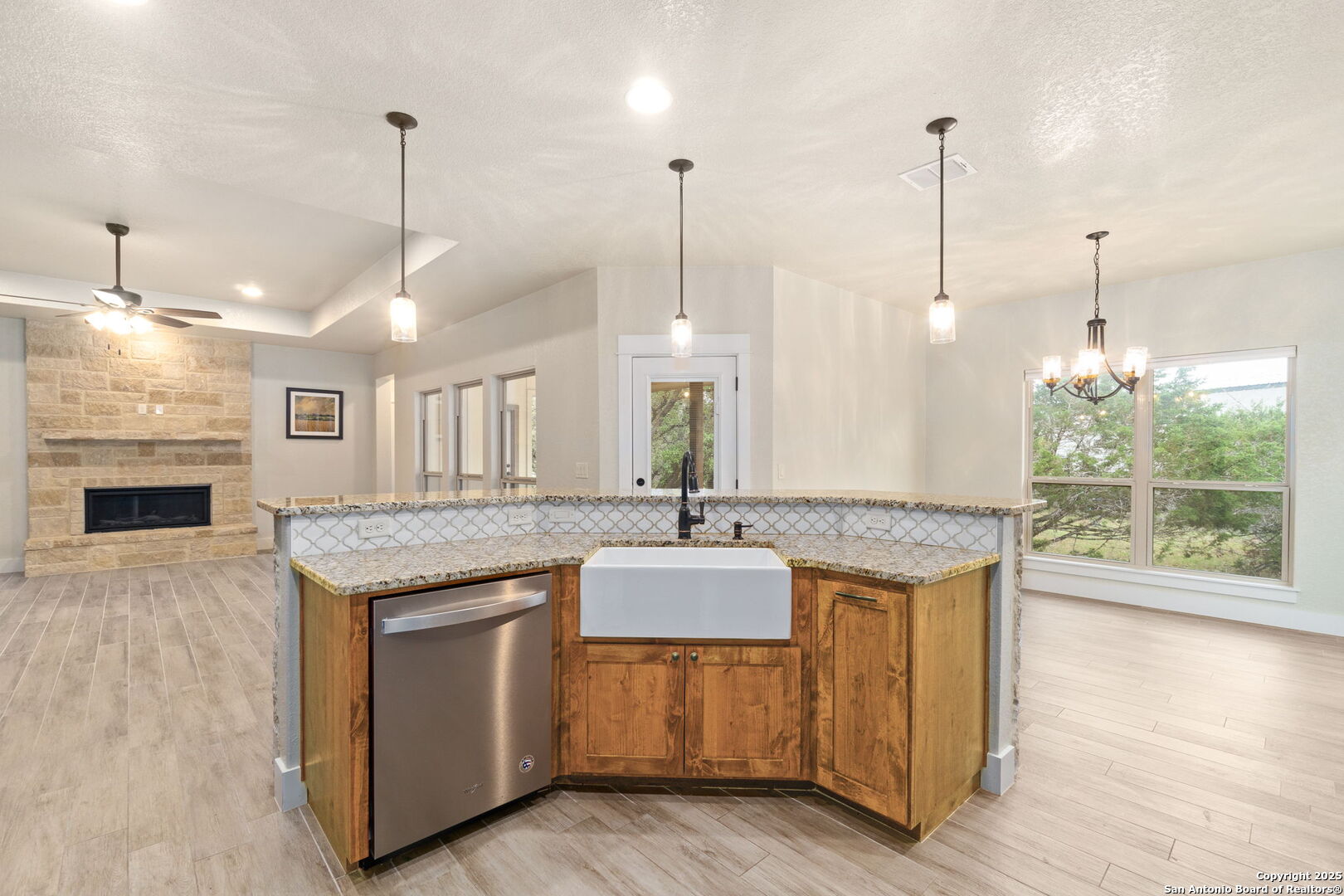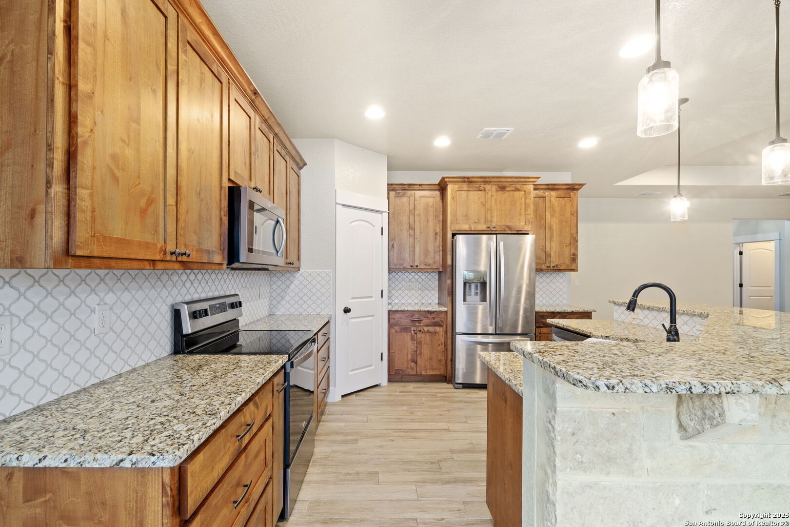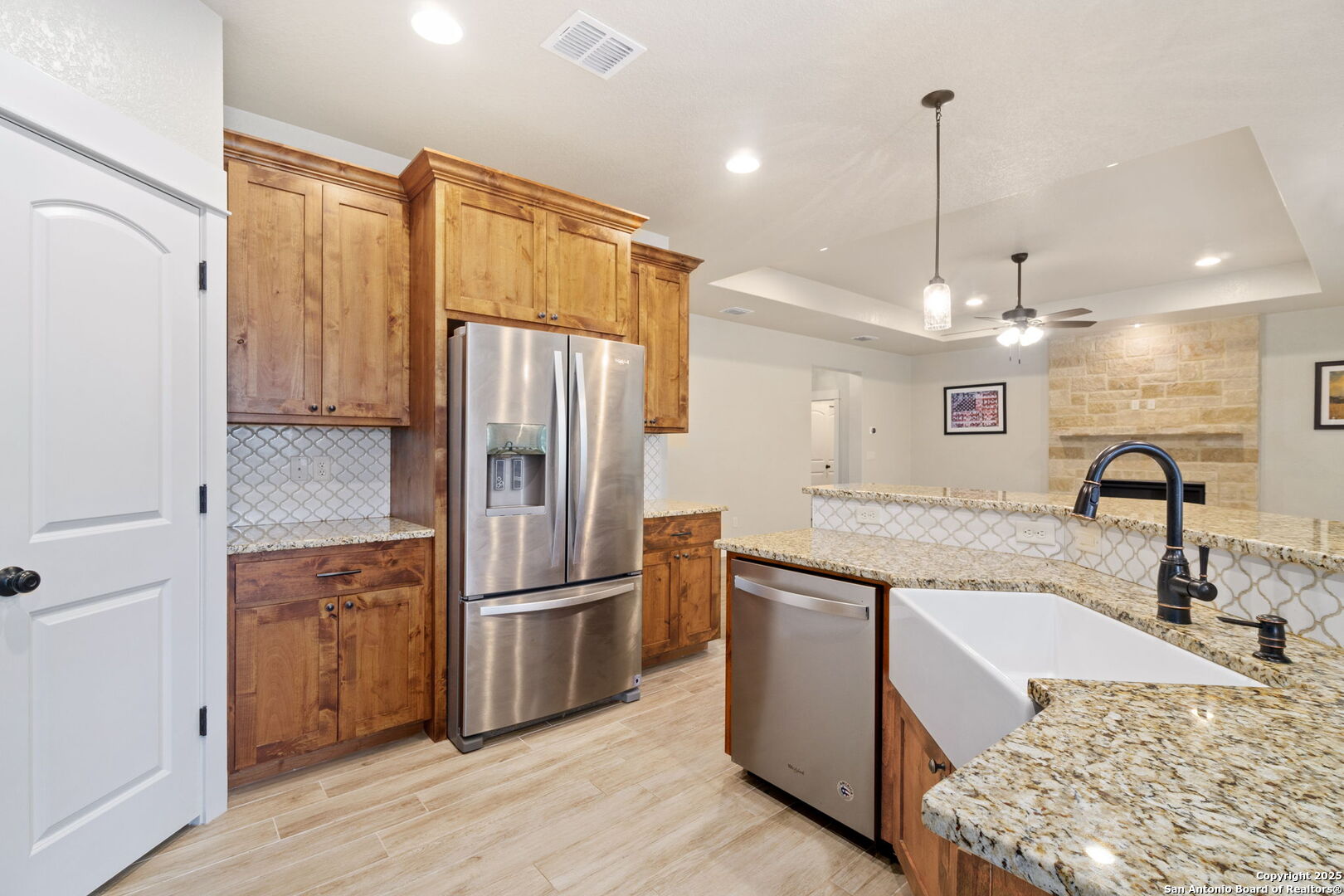 Welcome to refined living in this exquisitely crafted custom home, built in 2020 with impeccable attention to detail and high-end finishes throughout. This stunning 3 bedroom, 2 bathroom residence offers a sophisticated blend of style and comfort, featuring a desirable split floor plan and premium upgrades at every turn. Step into the chef-inspired kitchen adorned with sleek stainless steel appliances, custom cabinetry, and elegant granite countertops - perfectly designed for entertaining or everyday luxury. The expansive open-concept living space is anchored by a striking fireplace, with beautiful tile flooring flowing seamlessly throughout the home. The primary suite is a private sanctuary, boasting a massive walk-in closet and a spa-like en-suite bath that exudes serenity and sophistication. Two additional bedrooms provide spacious accommodations for family or guests, each with access to a tastefully appointed second bath. Step outside to your own private backyard oasis, fully fenced and featuring a custom firepit - ideal for cozy evenings under the stars. A 2-car garage offers ample space for vehicles and storage. From top to bottom, this home defines modern luxury with timeless appeal. Don't miss the opportunity to experience elevated living in a truly exceptional property.