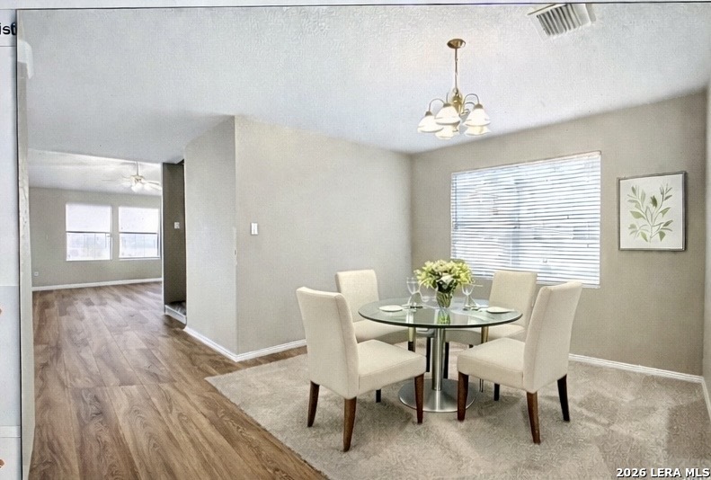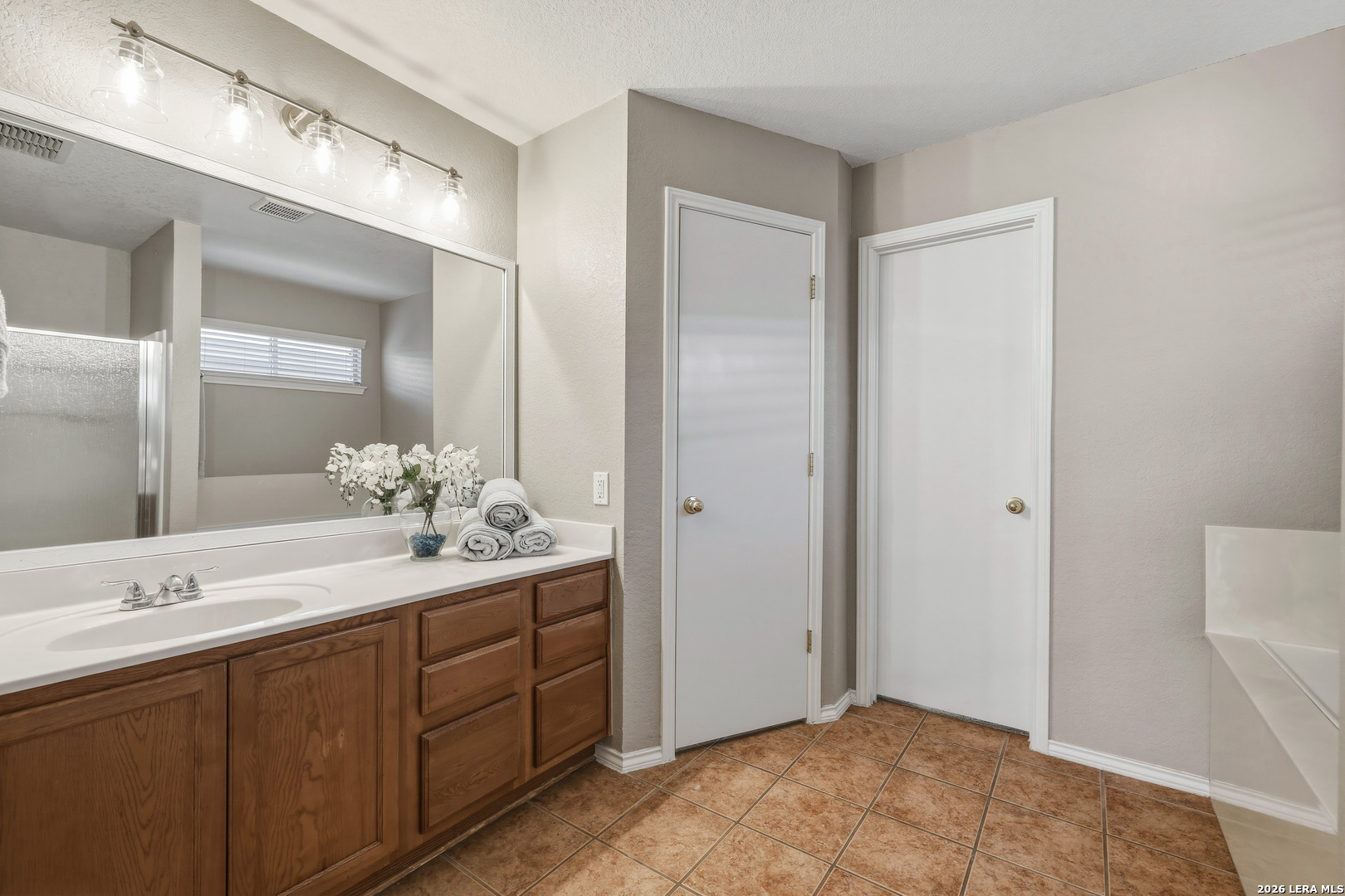 Beautiful 5 bedroom 2.5 bath 2 story home with a down stairs primary suite + a home office. This home is in Rolling Meadows right across from Rolling Oaks Mall off of Nacogdoches and Loop 1604. Just minutes from Randolph Air Force Base & Joint Base Fort Sam Houston. This home features a great room layout. Main living, kitchen & eating area all open to a large back yard with a greenbelt behind the property. The backyard has a covered patio perfect for relaxing or entertaining. The downstairs primary suite has an oversize jetted tub and separate shower with a large walk in closet. Interior highlights include new flooring, fresh interior paint, new stainless steal stove, fireplace in the living area, 3 eating areas (formal dining room, casual dining area & breakfast bar), 3 large bedrooms upstairs. The 5th bedroom is a Flex Room it can be used as a media room, a second home office or a bedroom (seller will buy a wardrobe with a full price offer). Upstairs game room is huge. This is a great location close to major employers, shopping & dining