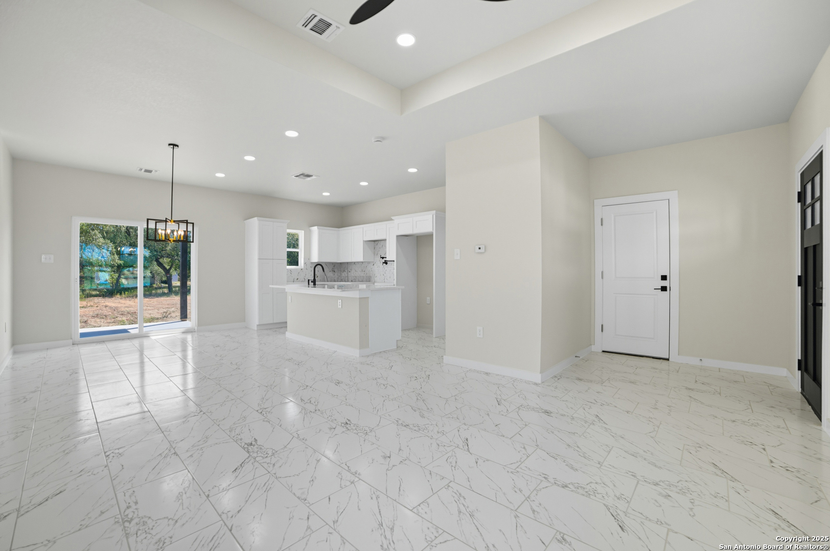 Brand-new single-story home on a spacious half-acre lot in Atascosa, blending modern design with everyday comfort. Features include a stone exterior, bold trim, brand-new lawn, and stone-raised garden bed for standout curb appeal. Inside, enjoy 9-ft ceilings, marble tile floors, and an open layout with a tray ceiling and fan. The kitchen offers quartz countertops, stainless steel appliances, subway marble backsplash, black hardware, and a pot filler faucet. The primary suite includes warm lighting, a designer fan, and a luxurious en-suite with a walk-in shower. Two additional bedrooms feature stylish lighting and roomy closets. Relax on the covered patio overlooking your half-acre lot-perfect for entertaining or adding a pool. Includes a two-car garage with opener, double-pane windows, and central HVAC for year-round comfort.