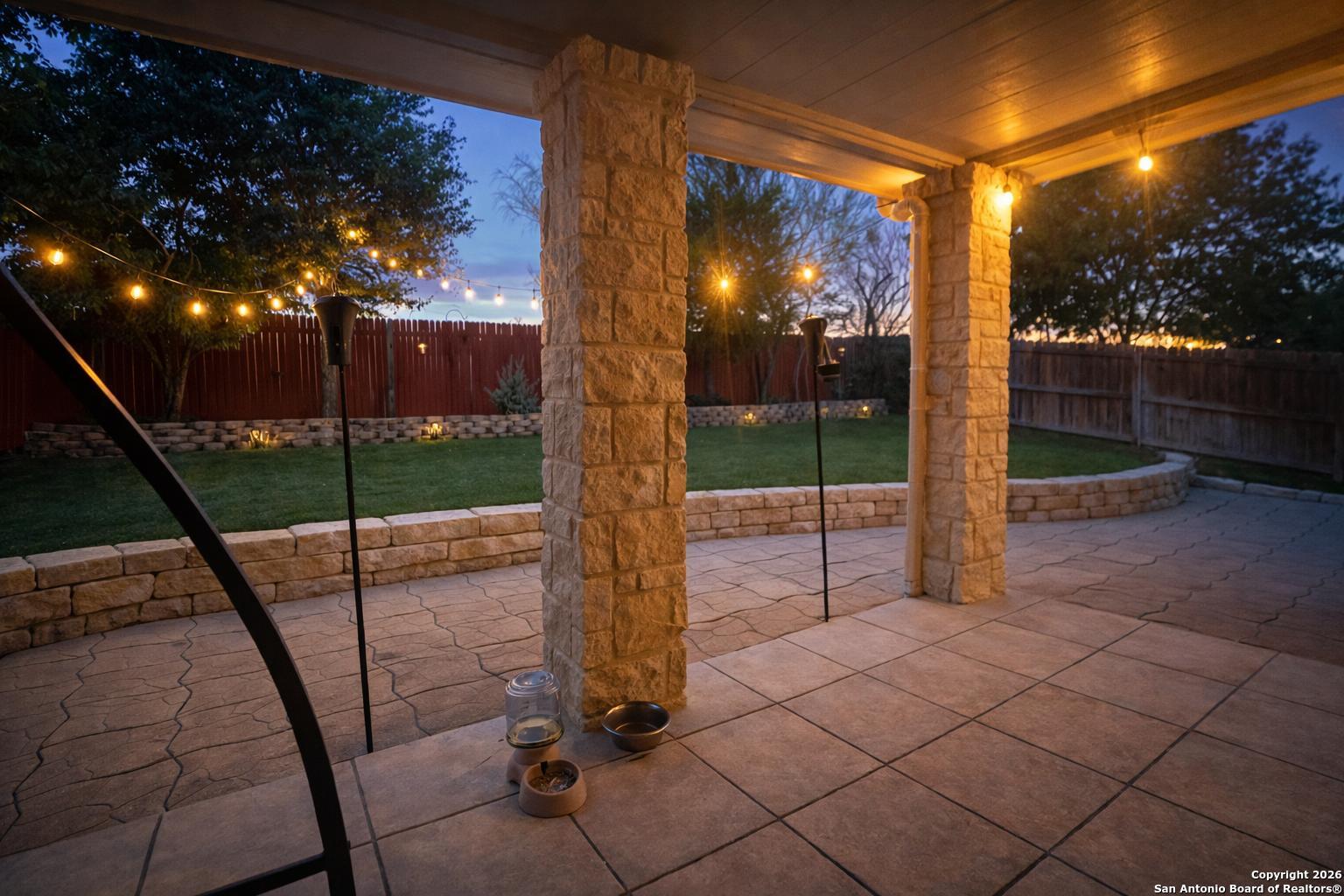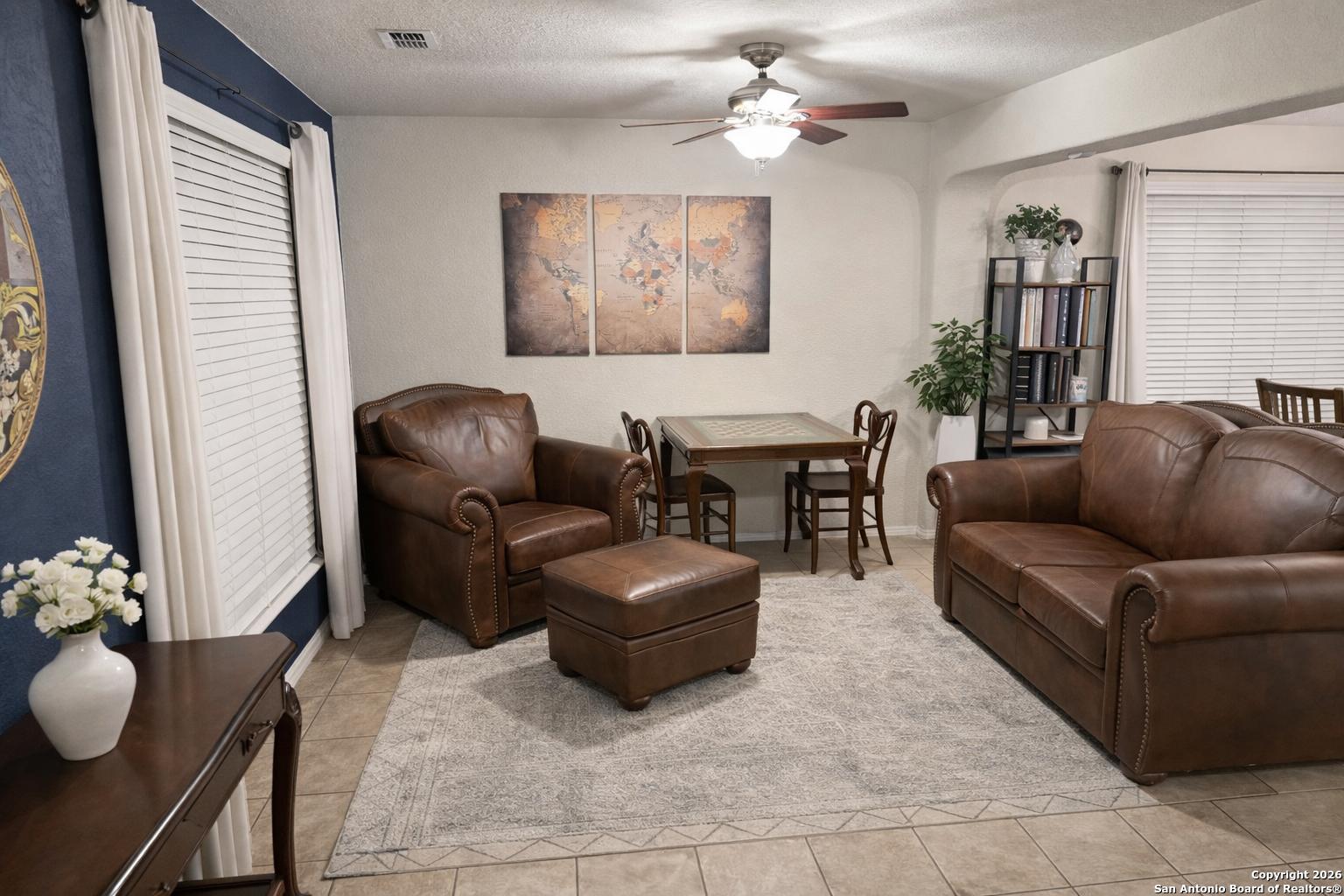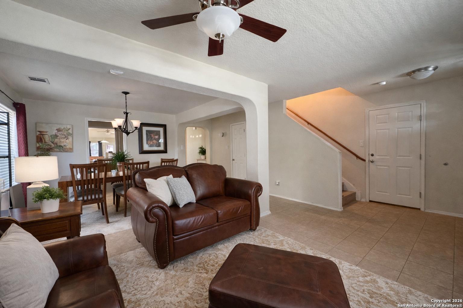 Welcome to this beautifully updated 4-bedroom home ideally located just minutes from Loop 1604, I-35, The Forum, and Randolph AFB. From the moment you arrive, the curb appeal stands out with an extended driveway, manicured landscaping, and a tiled front porch that invites you inside. The interior offers a bright, open-concept layout with no carpet-tile flooring throughout, making the home both stylish and low-maintenance. The fully remodeled bathrooms add a modern touch, while recent big-ticket upgrades provide peace of mind, including a new HVAC system (inside and outside units replaced in 2024) and a premium roof with new fascia boards and gutters. Step outside to enjoy the enhanced backyard patio featuring decorative stone pillars, perfect for relaxing or entertaining. The yard is thoughtfully landscaped and equipped with a full irrigation system conveniently controlled from your phone, with sidewalks that wrap around the entire home. Best of all, the property backs to a greenbelt, offering added privacy and a serene setting. Truly move-in ready, this home combines location, upgrades, and lifestyle-don't miss your opportunity to make it yours.