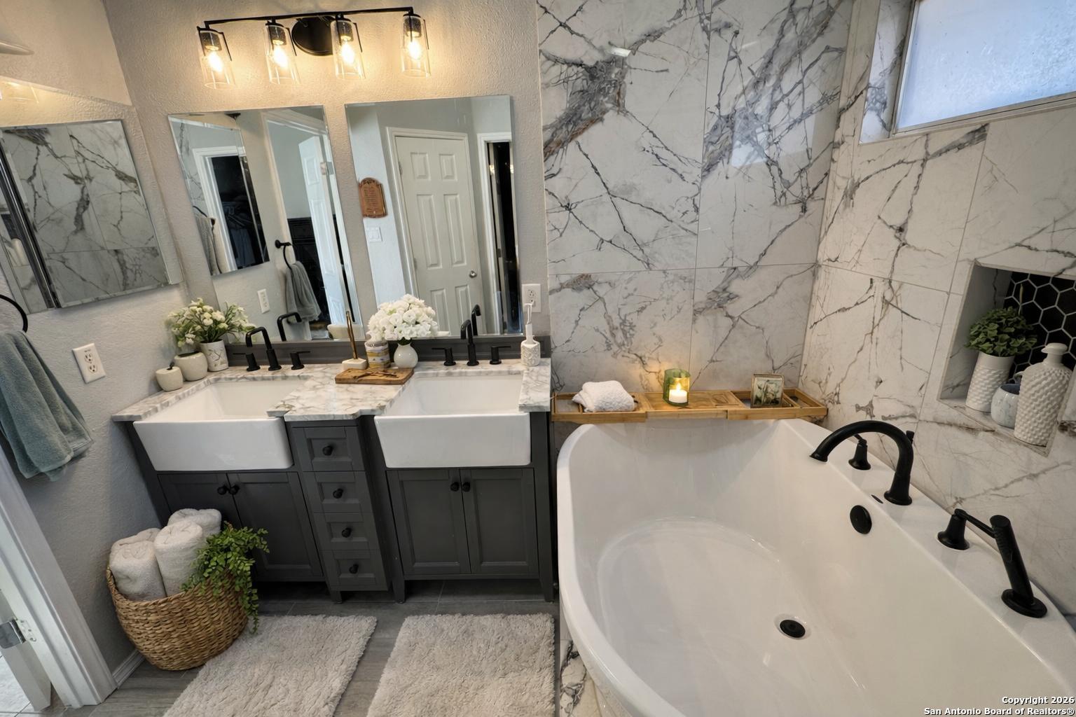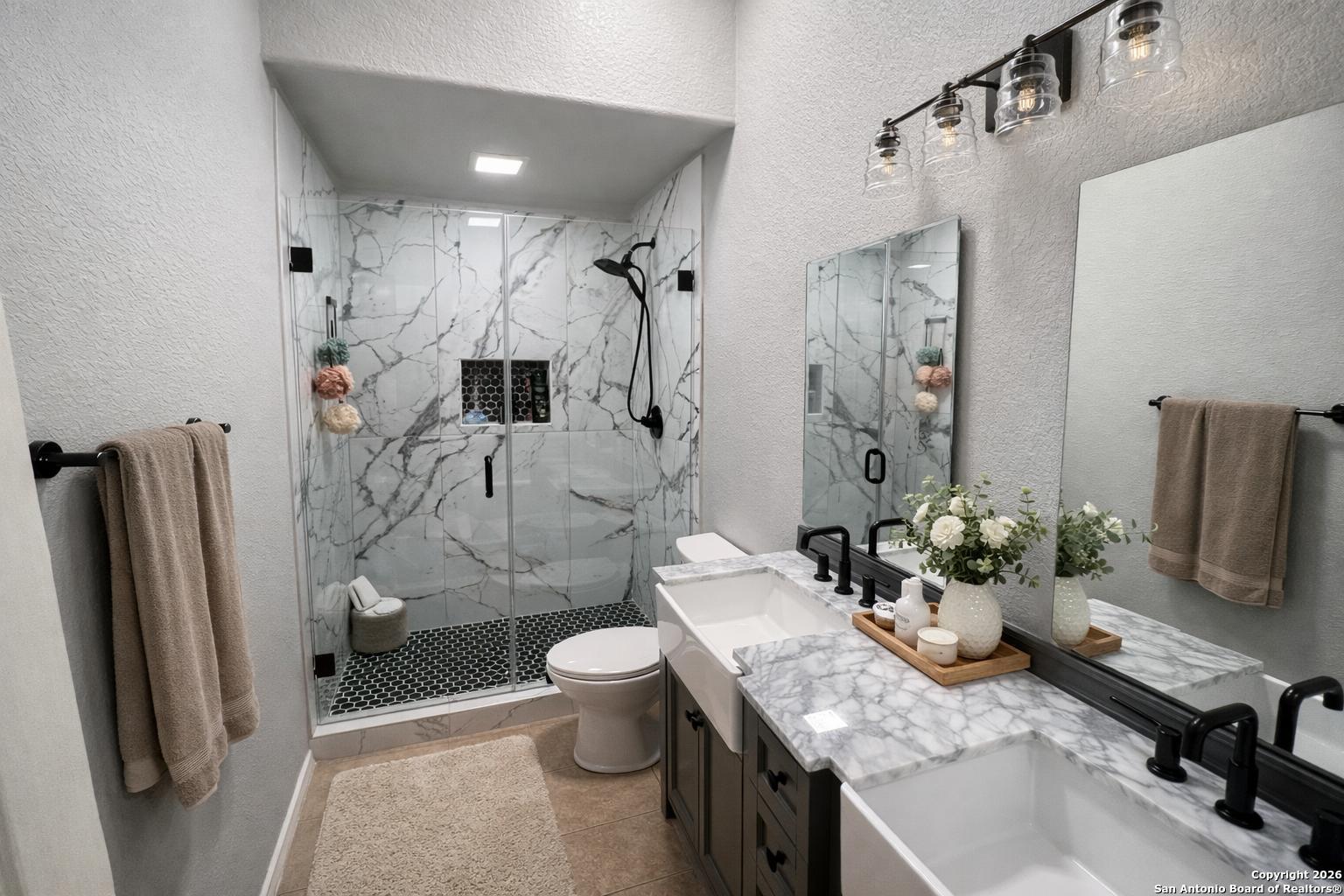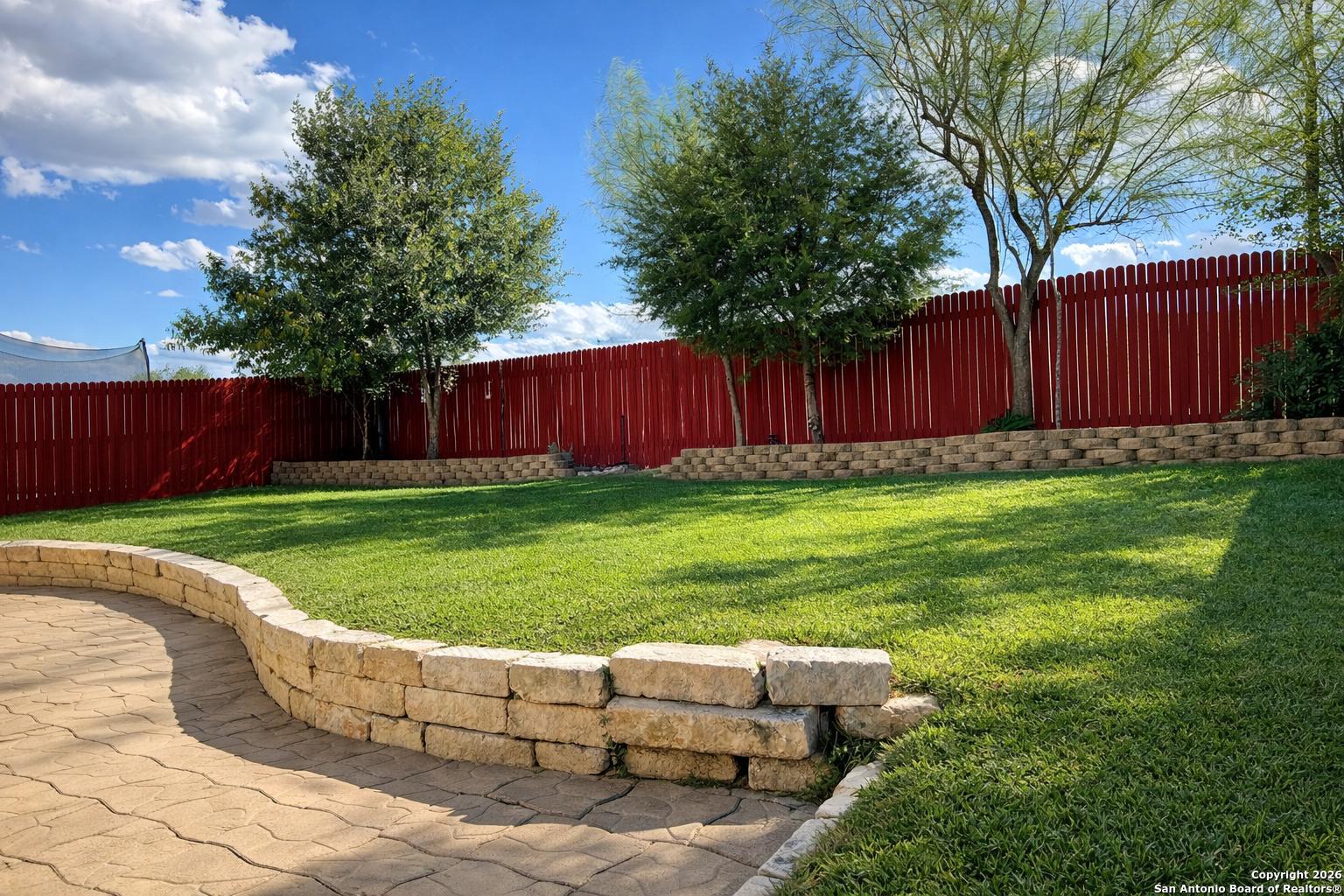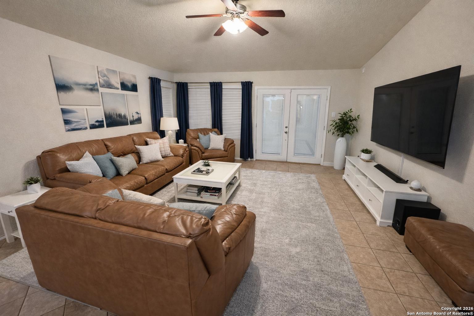 Welcome to this beautifully updated 4-bedroom home ideally located just minutes from Loop 1604, I-35, The Forum, and Randolph AFB. From the moment you arrive, the curb appeal stands out with an extended driveway, manicured landscaping, and a tiled front porch that invites you inside. The interior offers a bright, open-concept layout with no carpet-tile flooring throughout, making the home both stylish and low-maintenance. The fully remodeled bathrooms add a modern touch, while recent big-ticket upgrades provide peace of mind, including a new HVAC system (inside and outside units replaced in 2024) and a premium roof with new fascia boards and gutters. Step outside to enjoy the enhanced backyard patio featuring decorative stone pillars, perfect for relaxing or entertaining. The yard is thoughtfully landscaped and equipped with a full irrigation system conveniently controlled from your phone, with sidewalks that wrap around the entire home. Best of all, the property backs to a greenbelt, offering added privacy and a serene setting. Truly move-in ready, this home combines location, upgrades, and lifestyle-don't miss your opportunity to make it yours.
