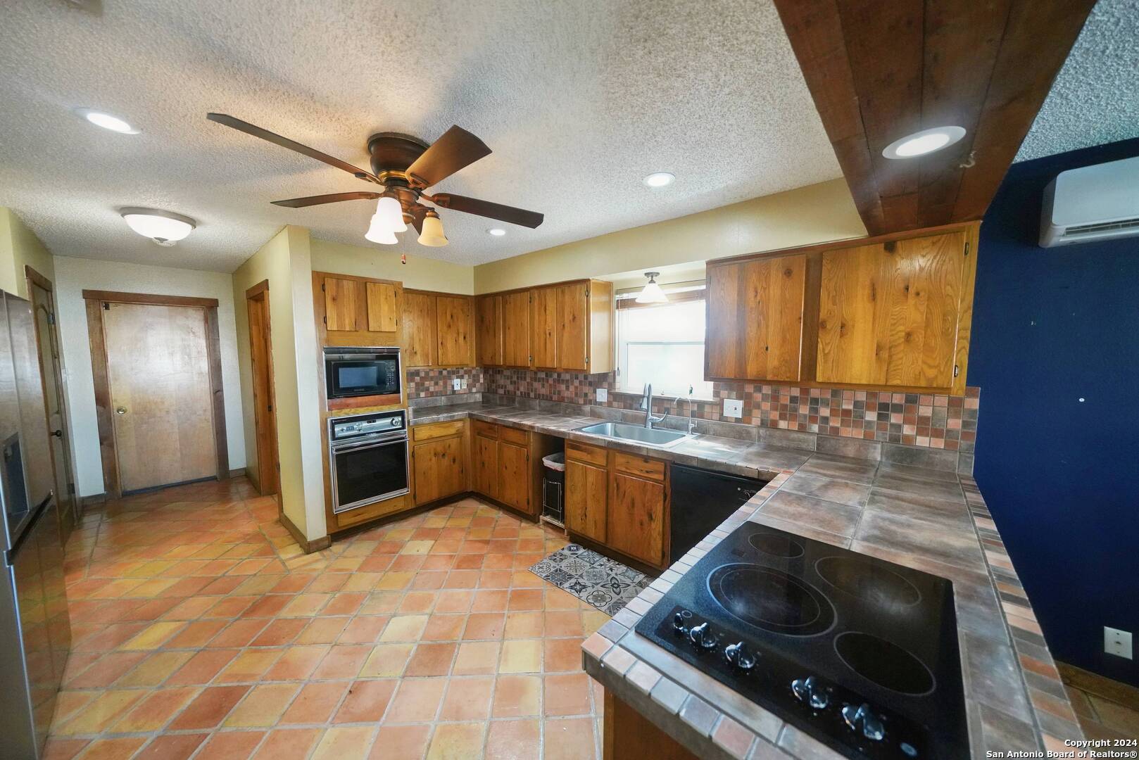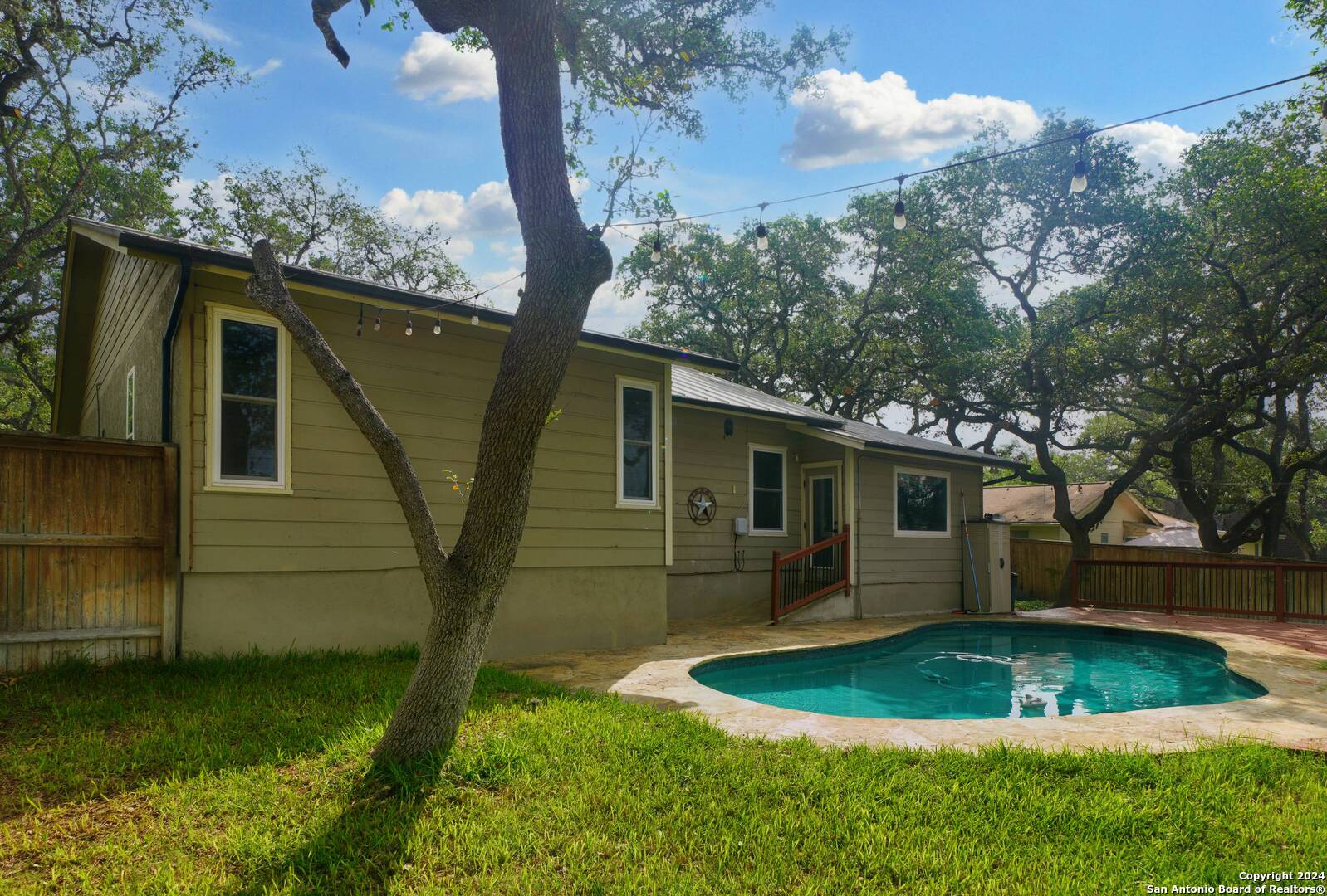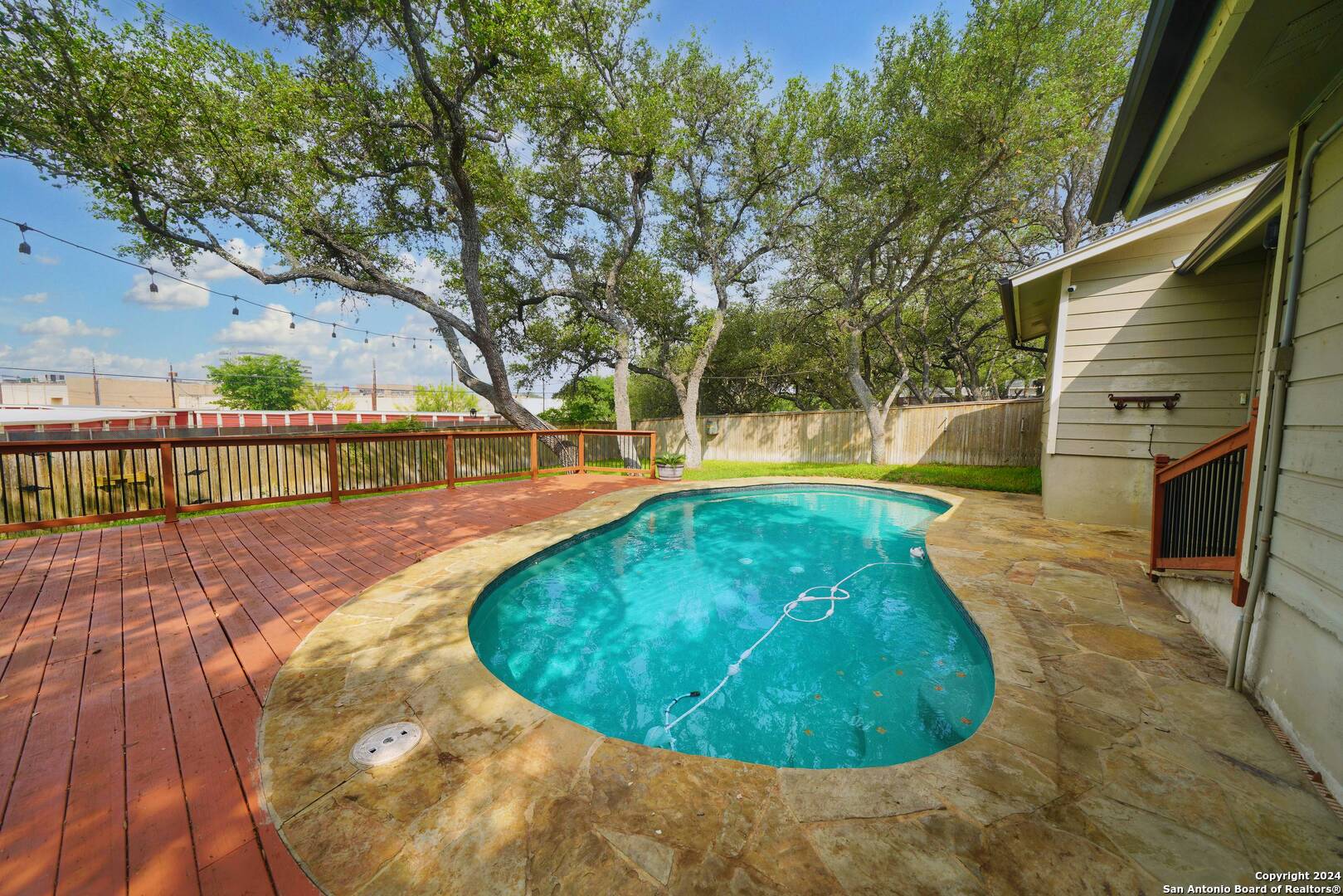 This charming three-bedroom, two-bathroom home in the sought-after Kentwood Manor subdivision is now on the market, featuring an inviting in-ground pool. Nestled on a generous quarter-acre lot adorned with mature trees, this home offers an inviting, oversized entryway leading into a spacious family room bathed in natural light, highlighted by beautifully refinished saltillo tiles that run throughout the home. The large kitchen adjacent to the family room includes tiled countertops, a tiled backsplash, and comes equipped with a stainless steel refrigerator, enhancing convenience. Nearby, a cozy breakfast area provides the perfect spot for quick meals or enjoying morning coffee. The master suite boasts a full en-suite bathroom with a single vanity and a large walk-in shower adorned with intricate tile work that adds a touch of festive flair. The second bathroom, equipped with a sizable walk-in shower, is conveniently located between the two additional bedrooms, each featuring ceiling fans. Outside, the property's standout feature is the delightful in-ground pool and expansive wood deck, ideal for entertaining and weekend barbecues. Pool maintenance and security monitoring are provided by the property owner, adding extra peace of mind. Situated just off Highway 281 with easy access to Loop 1604, this home is close to a plethora of shopping, dining, and entertainment options. This property is a must-see and sure to impress.