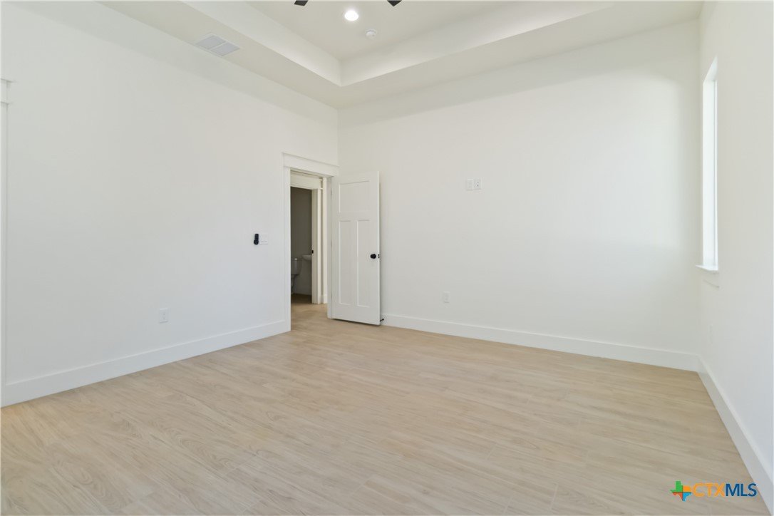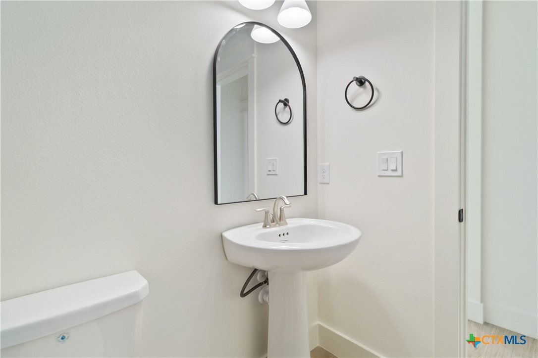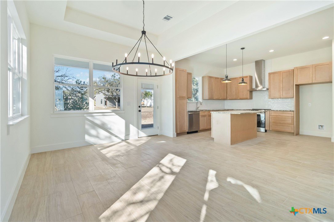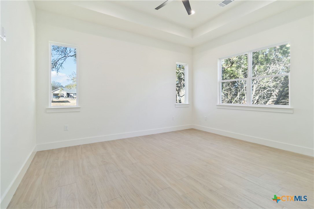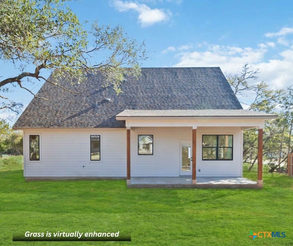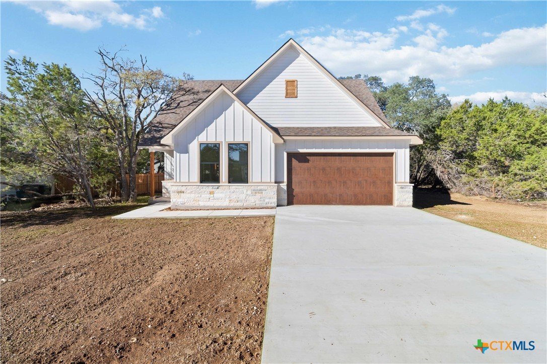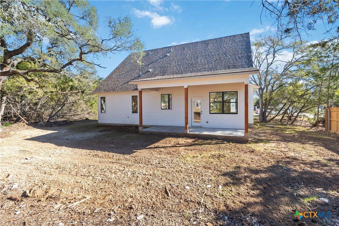 Exceptional lot. Finished construction. Compelling value—this modern farmhouse sits on an oversized 0.275-acre cul-de-sac street lot surrounded by mature oak trees. With a little over 2,000 sqft, you have 3 bedrooms, 2.5 baths, and a dedicated office with cathedral ceilings—a rare find at this price point. Striking curb appeal features an elevated roofline, stone-accented exterior, and covered front porch. Inside, the open-concept layout delivers clean, modern finishes with leathered granite countertops, soft pine cabinetry, and a statement chandelier anchoring the dining space. The main-level primary suite includes dual vanities, a frameless walk-in shower with bench and custom tile, private water closet, and a walk-in closet with custom shelving. Upstairs, two spacious secondary bedrooms are privately positioned with a full bath between them. Enjoy Hill Country living from the deep covered back patio overlooking a level yard with views of mature oaks. Added functionality includes a garage side door for easy yard access and a water softener loop. Located in Wimberley, with quick access to San Marcos, Dripping Springs, Canyon Lake, and Austin—approximately 25 minutes away. Close-out inventory. Exceptional lot. Reduced price. Schedule your private showing today.