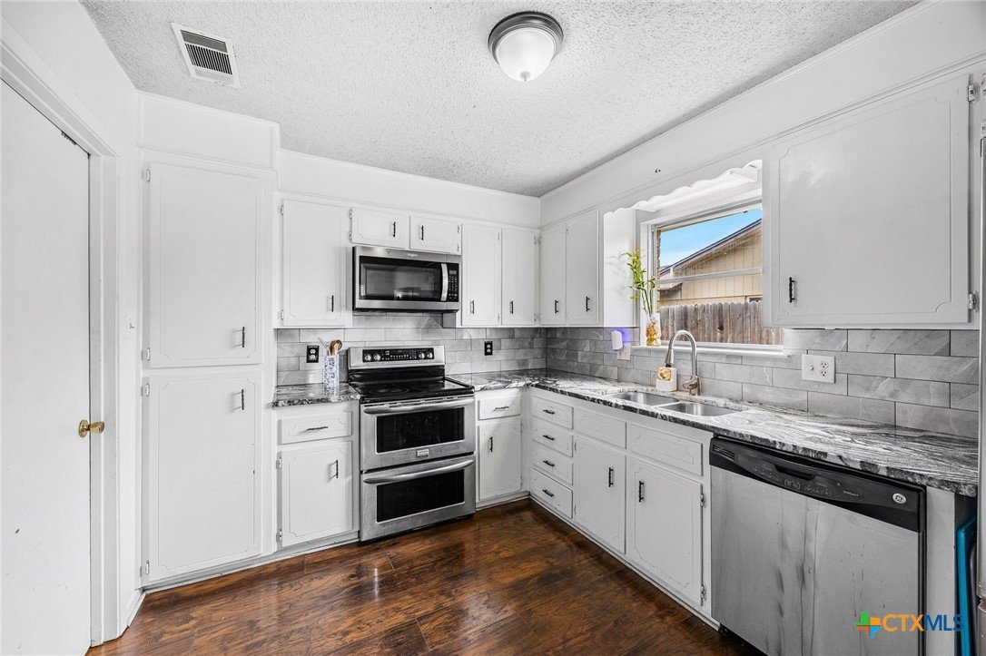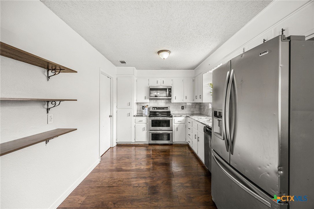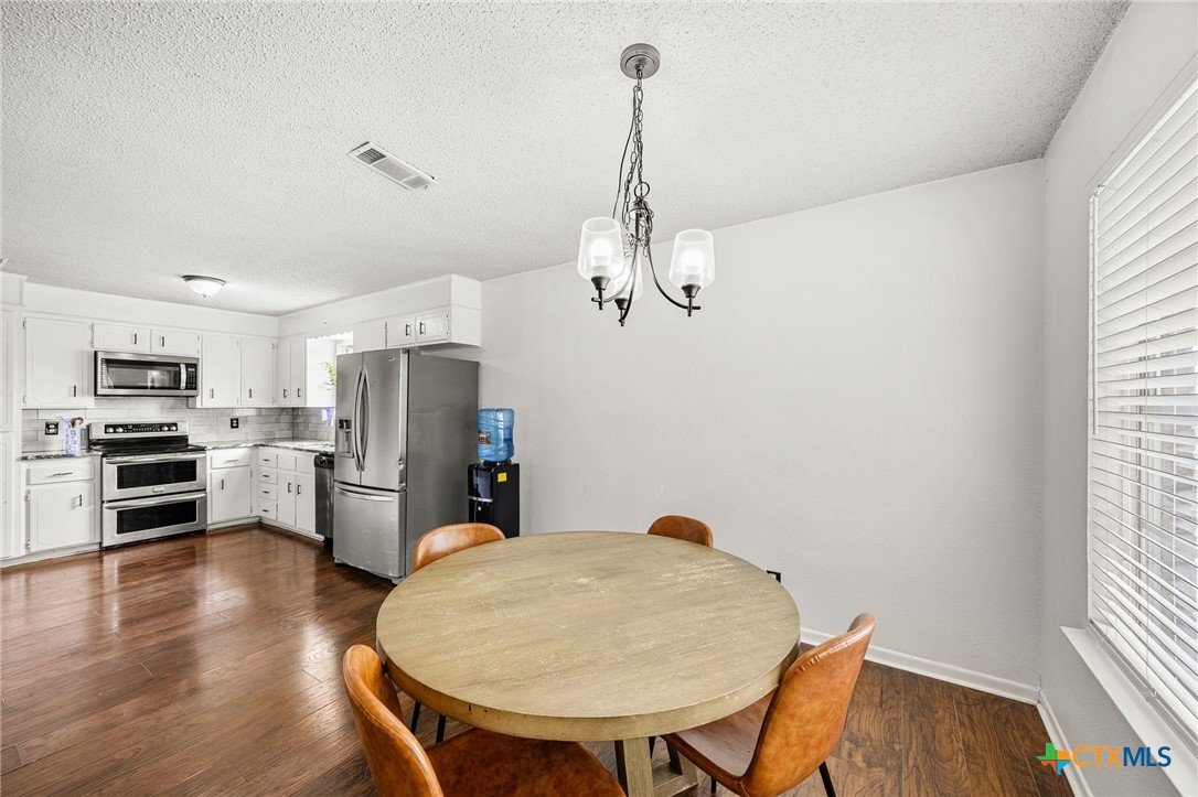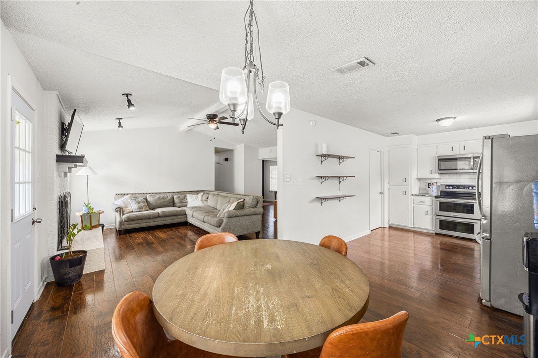 Welcome to this well-maintained home in the desirable Leon Heights subdivision in Killeen. This 3-bedroom, 2-bathroom property offers a comfortable single-story layout with 1,499 square feet of living space, designed to feel both functional and inviting. The home was updated in 2020, with improvements including flooring, paint, appliances, and bathrooms, giving it a clean and modern feel throughout. The spacious living area features high ceilings and a cozy fireplace, while the kitchen offers an eat-in dining space, ample cabinetry, and a layout that opens to the main living area, ideal for both everyday living and entertaining. The primary suite provides a relaxing retreat with an en-suite bathroom, while the additional bedrooms offer flexibility for guests, family, or a home office. A dedicated laundry room inside the home adds convenience, along with a two-car garage for parking and storage. Step outside to enjoy a covered patio and a fully fenced backyard, perfect for outdoor gatherings or quiet evenings at home. Situated on a generously sized lot, this property offers both privacy and room to enjoy. With its thoughtful updates, functional layout, and convenient location near schools, shopping, and major roadways, this home is a great opportunity for buyers looking for comfort and value in Killeen.