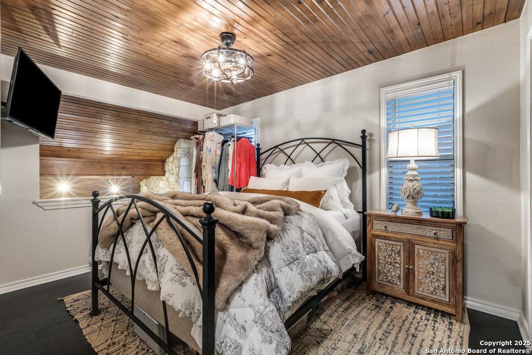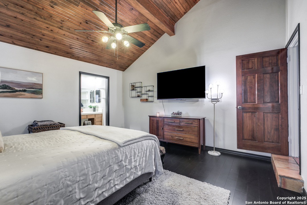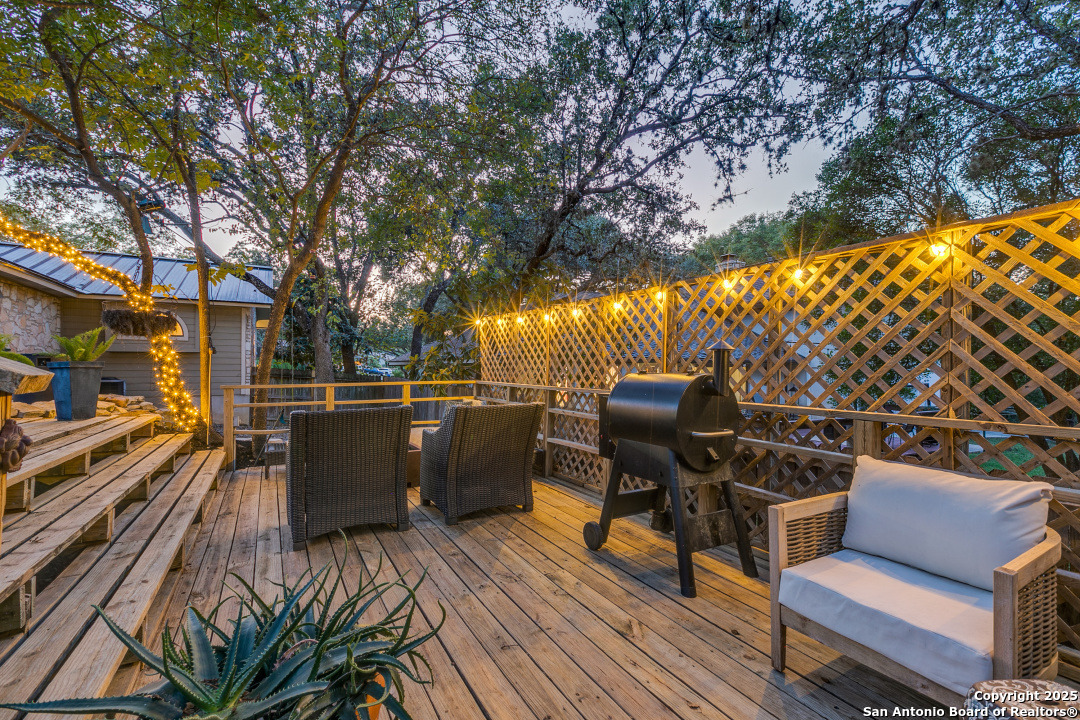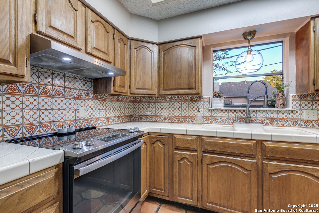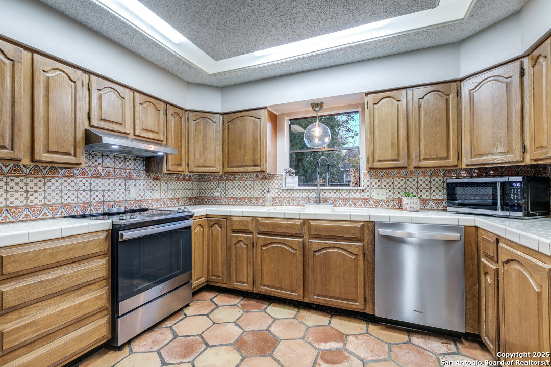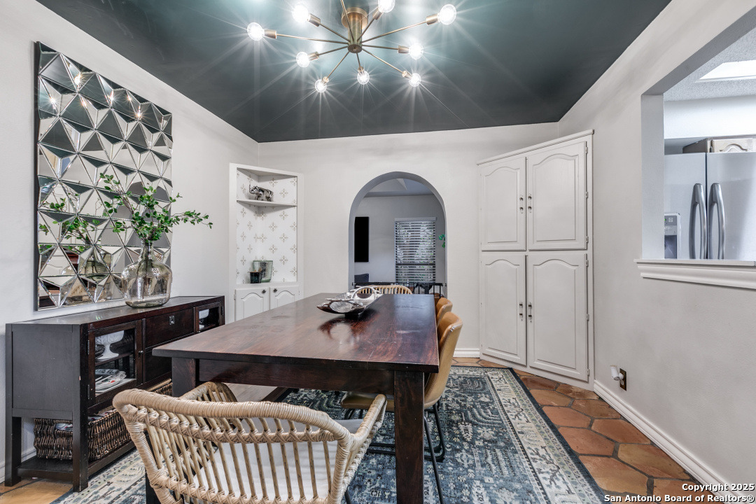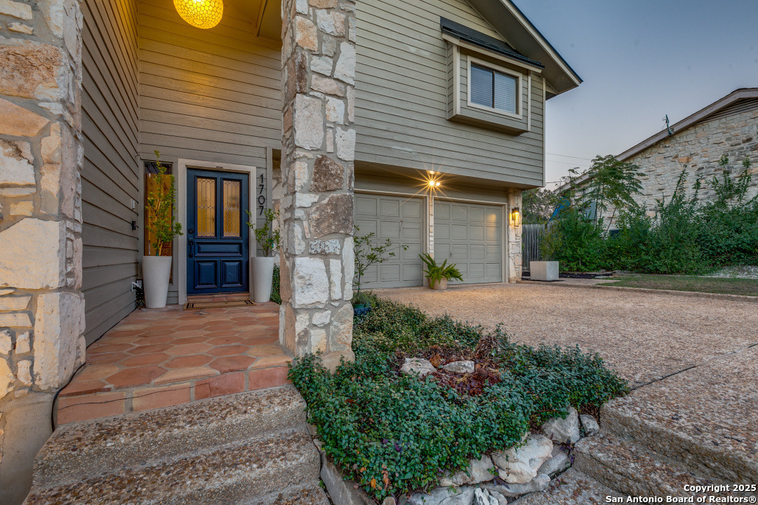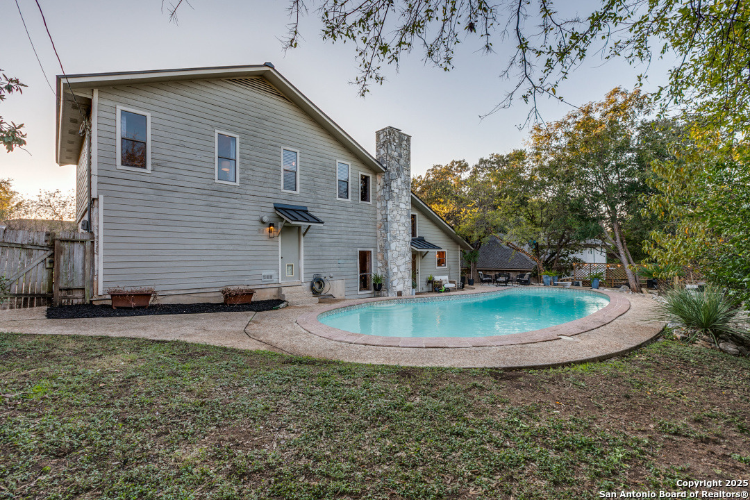 Beautifully appointed split level with mid-century aesthetic and close proximity to McAllister Park. Unique floor levels offer a sense of openness with a flexible layout of distinct spaces. Neutral paint palette compliments vintage "hex" Saltillo tile with glazed Spanish tile accents, stained tongue and groove ceilings, clerestory windows, arched openings and custom built-in cabinetry. Kitchen has stained cabinetry with tile counters, decorative splash, stainless appliances, and connection to large living area with wet bar and stone fireplace. Primary bedroom with en-suite has decorator color palette and sense of privacy. Second floor supports two additional bedrooms and a flex space that can function as an office, exercise room, playroom, bedroom, etc. The exterior is outfitted with a stone facade and an attractive metal roof, and the backyard oasis with in-ground pool supports ample entertaining space with patios, oversized wood deck area, and recent landscaping overhaul.