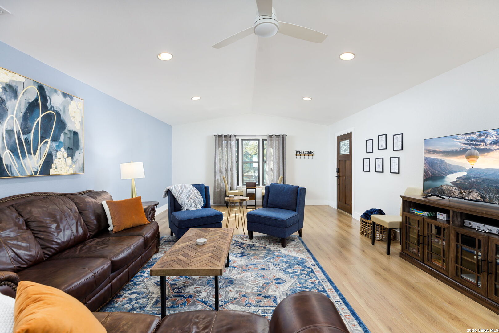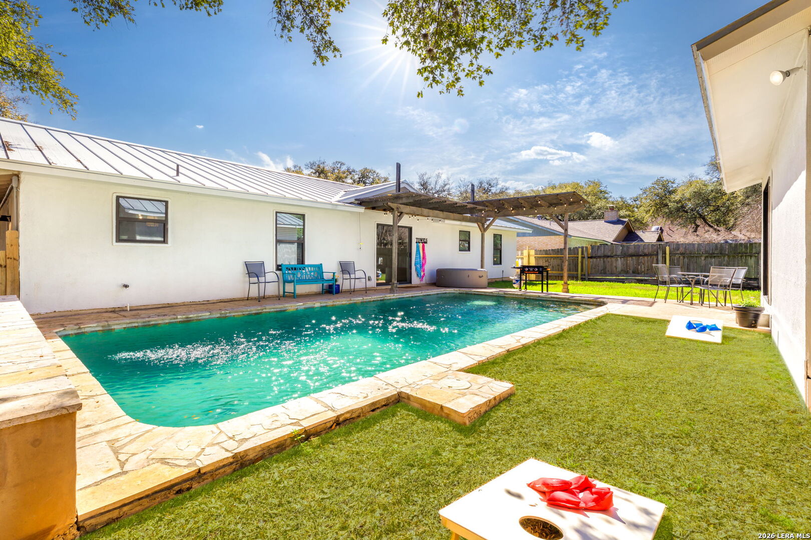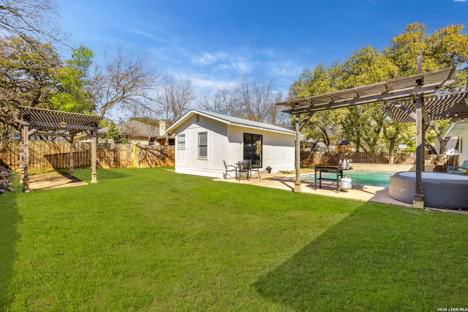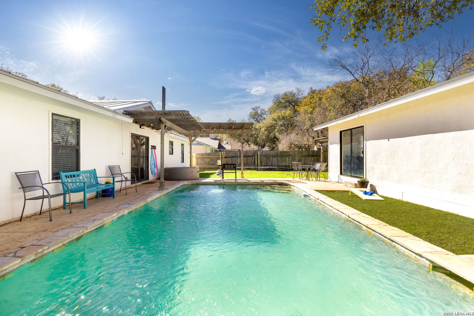 Stunning, fully renovated home currently operating as an income-producing short-term rental in the desirable Oakhaven Heights area with convenient access to 281 and 1604. Situated on a mature, tree-covered lot on a quiet street with no HOA. This 4-bedroom, 2-bath home features an open-concept layout with high ceilings and a spacious living area that flows seamlessly into an oversized dining space, offering views of the backyard and in-ground pool. The updated kitchen includes modern finishes and ample cabinetry. All bedrooms are generously sized. The backyard is designed for both relaxation and entertaining, featuring a covered pergola, in-ground pool, and a detached pool house that can function as a game room, guest space, or flex area. Ideal as a primary residence, second home, or turnkey investment property.