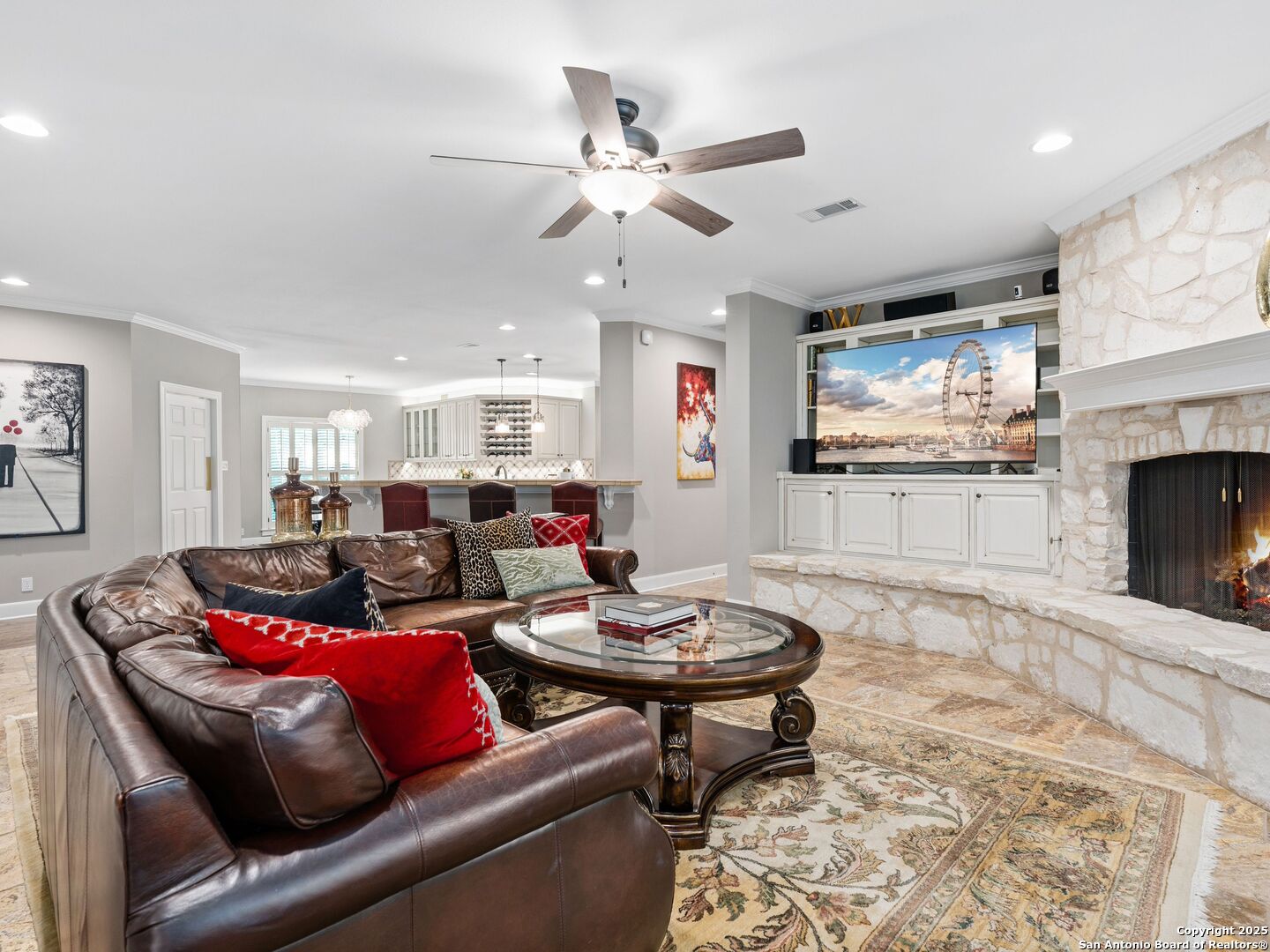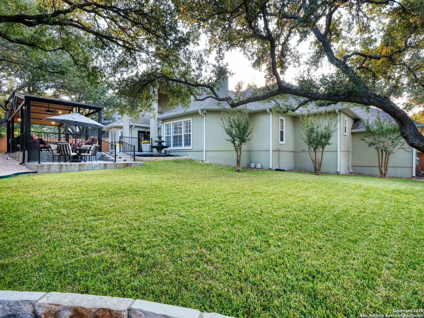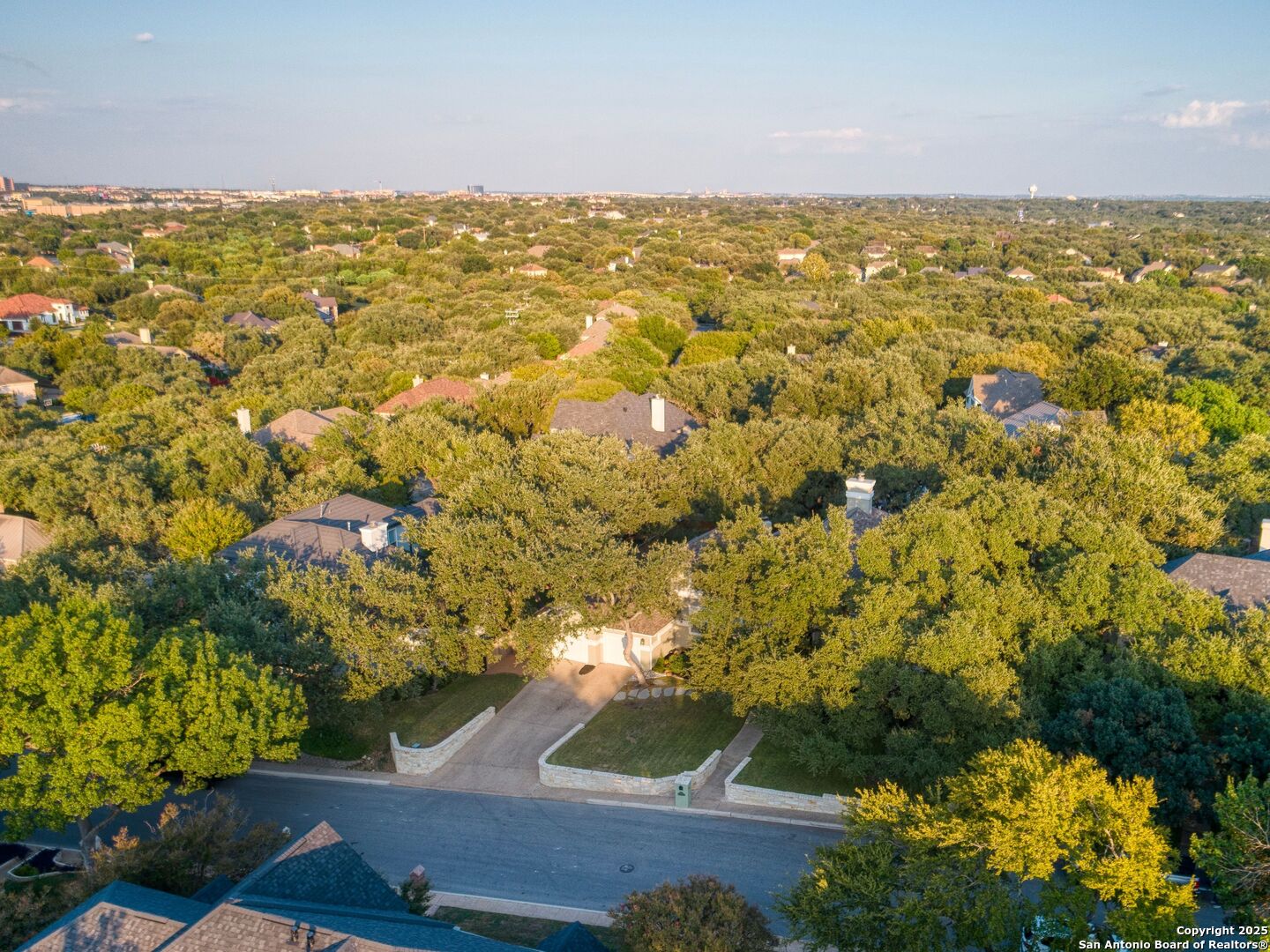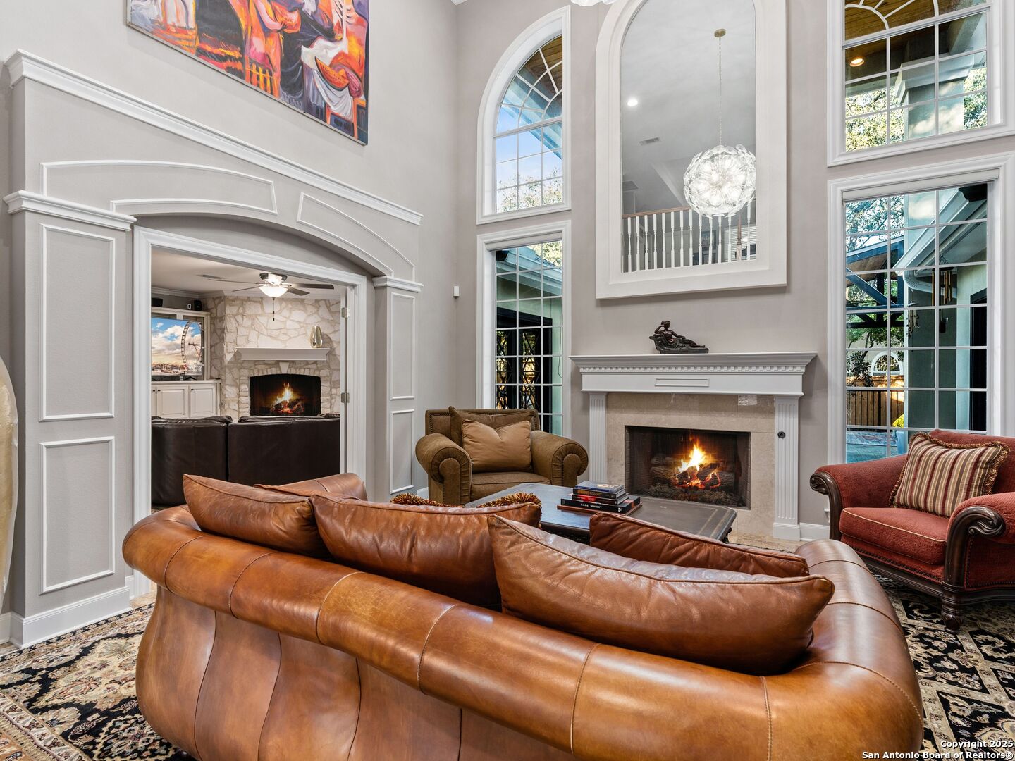 FANTASTIC FLOOR PLAN - PRIMARY SUITE + GUEST SUITE DOWN! Nestled among majestic mature oaks in the coveted Park at Deerfield, this custom Steve Heflin home offers over 4,000 sq. ft. of elegant living with an open, light-filled layout and timeless finishes. A welcoming covered stucco entry and new custom metal doors lead into soaring ceilings, rich hardwood floors, tumbled travertine, plantation shutters, and abundant natural light. The formal living room is truly breathtaking, while the family room with stone fireplace provides a cozy and inviting space overlooking the backyard. The chef's kitchen features custom cabinetry, extensive counter space, wine niche, breakfast bar, and under/over cabinet lighting-perfect for entertaining. A formal dining room is ideal for holiday gatherings. The spacious primary suite offers bay window seating, outdoor access, and a luxurious bath with dual vanities and custom closet. A highly sought-after downstairs guest suite with full bath adds versatility for multi-generational living. Upstairs features a large game room with built-in entertainment center, Jack-and-Jill bedrooms, and a fifth bedroom with private bath-plenty of room for everyone. Step outside to the new oversized covered patio with sitting area and outdoor grill. Enjoy the large backyard with room to play, entertain, or relax in total privacy. Rare opportunity to own a custom home in Park at Deerfield!