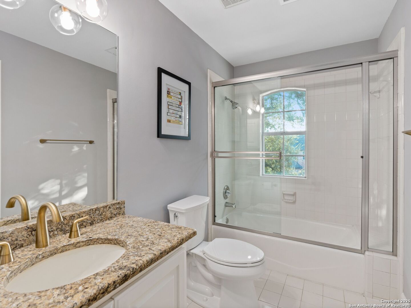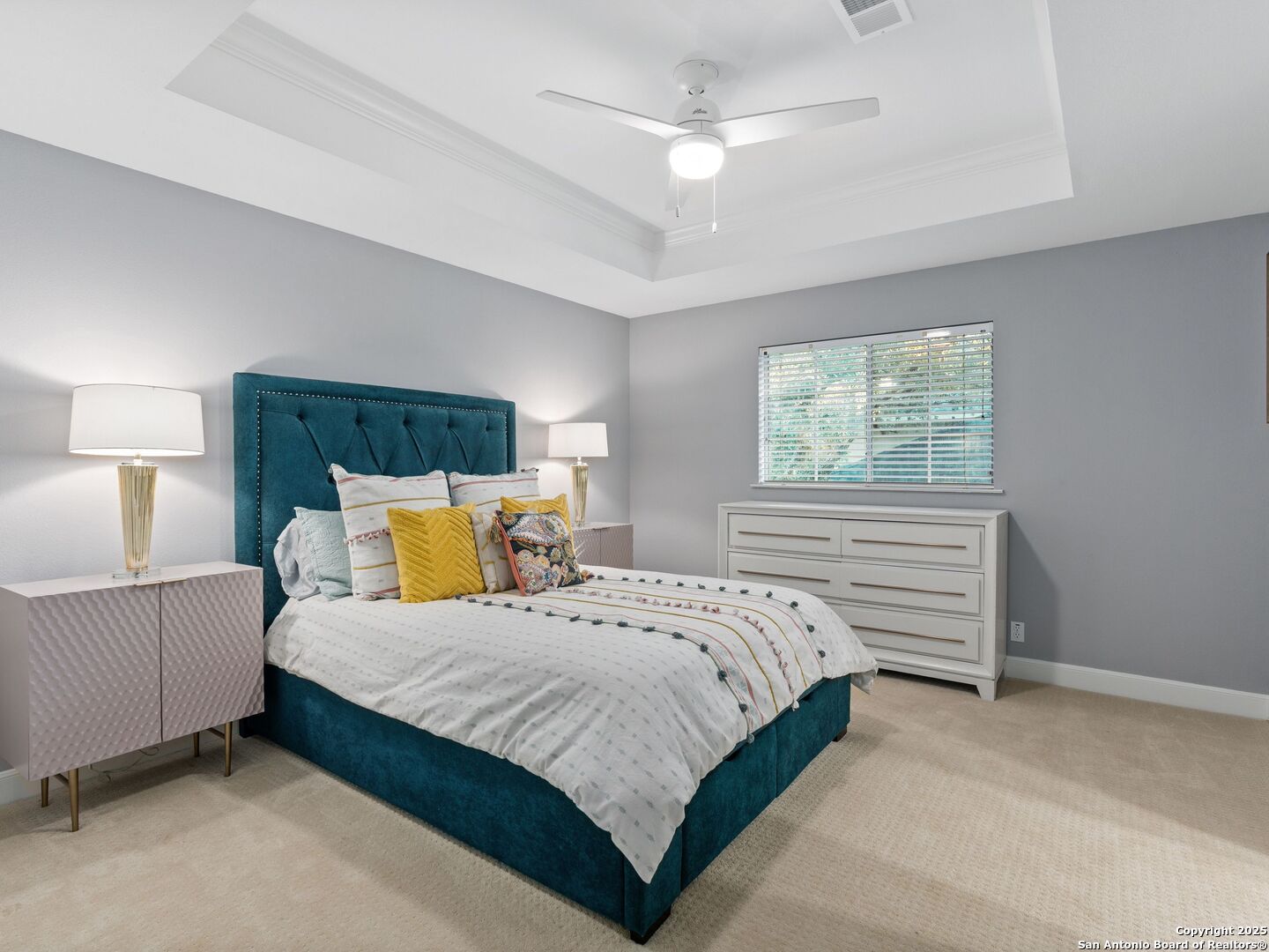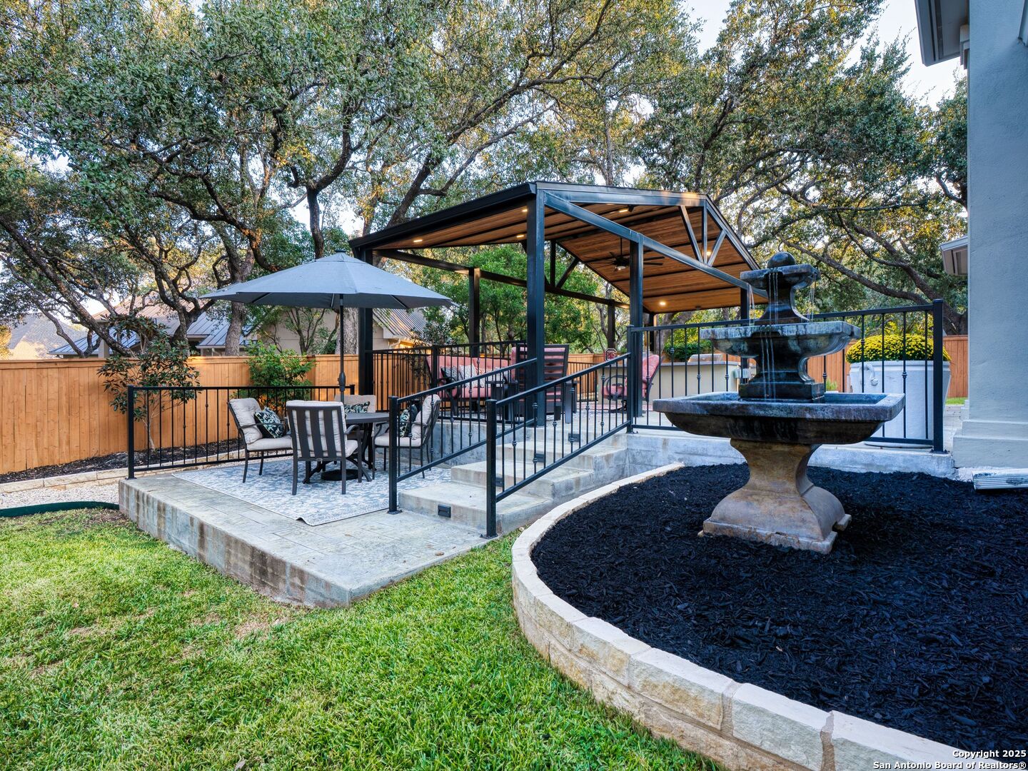 FANTASTIC FLOOR PLAN - PRIMARY SUITE + GUEST SUITE DOWN! Nestled among majestic mature oaks in the coveted Park at Deerfield, this custom Steve Heflin home offers over 4,000 sq. ft. of elegant living with an open, light-filled layout and timeless finishes. A welcoming covered stucco entry and new custom metal doors lead into soaring ceilings, rich hardwood floors, tumbled travertine, plantation shutters, and abundant natural light. The formal living room is truly breathtaking, while the family room with stone fireplace provides a cozy and inviting space overlooking the backyard. The chef's kitchen features custom cabinetry, extensive counter space, wine niche, breakfast bar, and under/over cabinet lighting-perfect for entertaining. A formal dining room is ideal for holiday gatherings. The spacious primary suite offers bay window seating, outdoor access, and a luxurious bath with dual vanities and custom closet. A highly sought-after downstairs guest suite with full bath adds versatility for multi-generational living. Upstairs features a large game room with built-in entertainment center, Jack-and-Jill bedrooms, and a fifth bedroom with private bath-plenty of room for everyone. Step outside to the new oversized covered patio with sitting area and outdoor grill. Enjoy the large backyard with room to play, entertain, or relax in total privacy. Rare opportunity to own a custom home in Park at Deerfield!