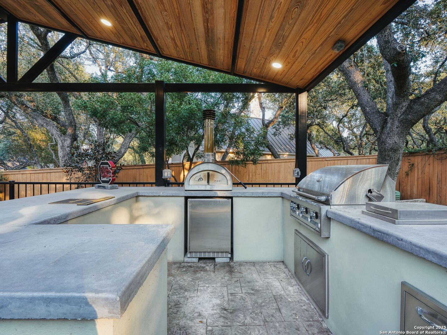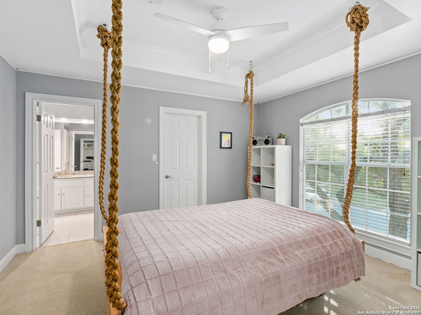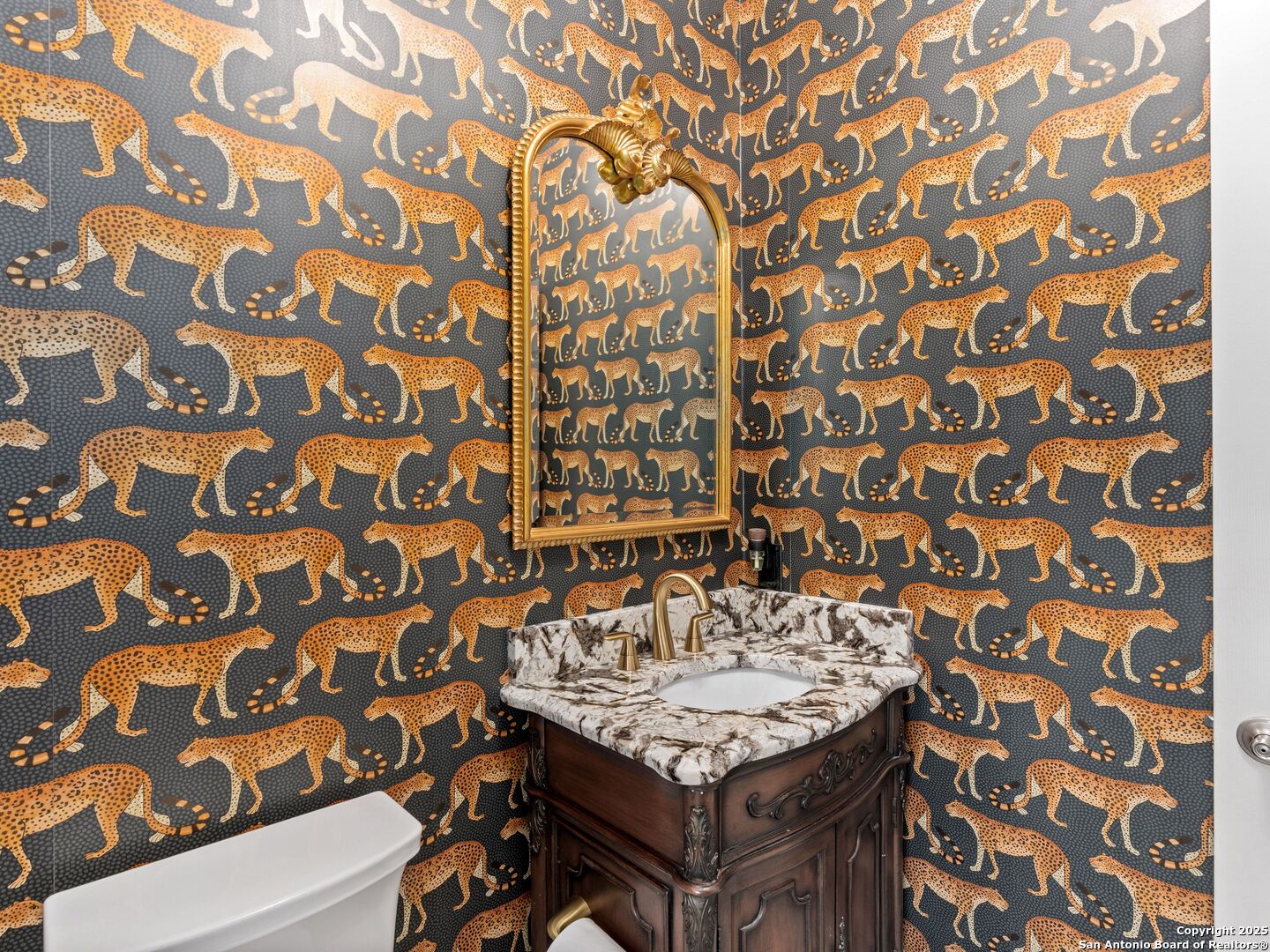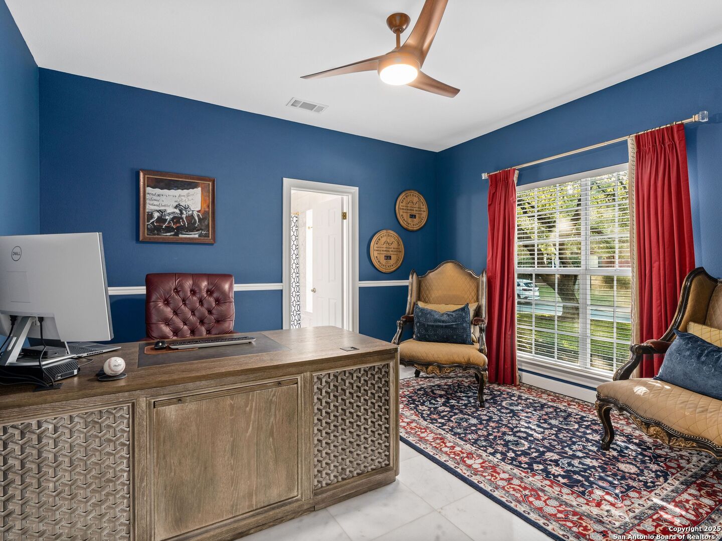 FANTASTIC FLOOR PLAN - PRIMARY SUITE + GUEST SUITE DOWN! Nestled among majestic mature oaks in the coveted Park at Deerfield, this custom Steve Heflin home offers over 4,000 sq. ft. of elegant living with an open, light-filled layout and timeless finishes. A welcoming covered stucco entry and new custom metal doors lead into soaring ceilings, rich hardwood floors, tumbled travertine, plantation shutters, and abundant natural light. The formal living room is truly breathtaking, while the family room with stone fireplace provides a cozy and inviting space overlooking the backyard. The chef's kitchen features custom cabinetry, extensive counter space, wine niche, breakfast bar, and under/over cabinet lighting-perfect for entertaining. A formal dining room is ideal for holiday gatherings. The spacious primary suite offers bay window seating, outdoor access, and a luxurious bath with dual vanities and custom closet. A highly sought-after downstairs guest suite with full bath adds versatility for multi-generational living. Upstairs features a large game room with built-in entertainment center, Jack-and-Jill bedrooms, and a fifth bedroom with private bath-plenty of room for everyone. Step outside to the new oversized covered patio with sitting area and outdoor grill. Enjoy the large backyard with room to play, entertain, or relax in total privacy. Rare opportunity to own a custom home in Park at Deerfield!