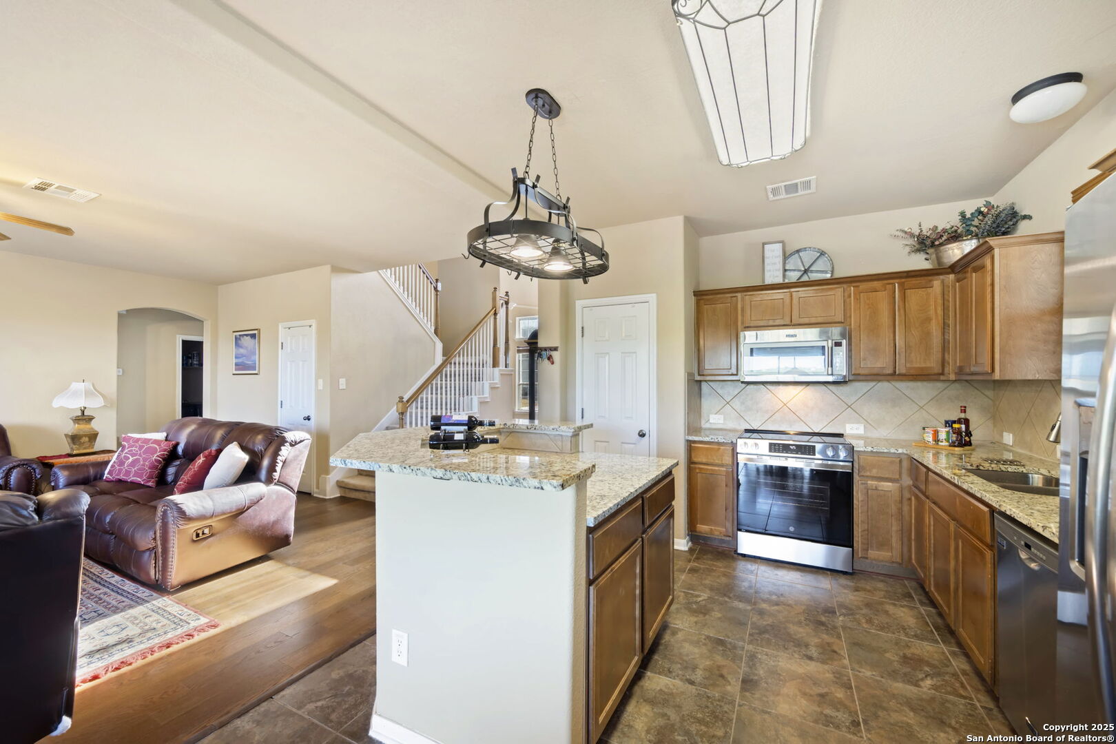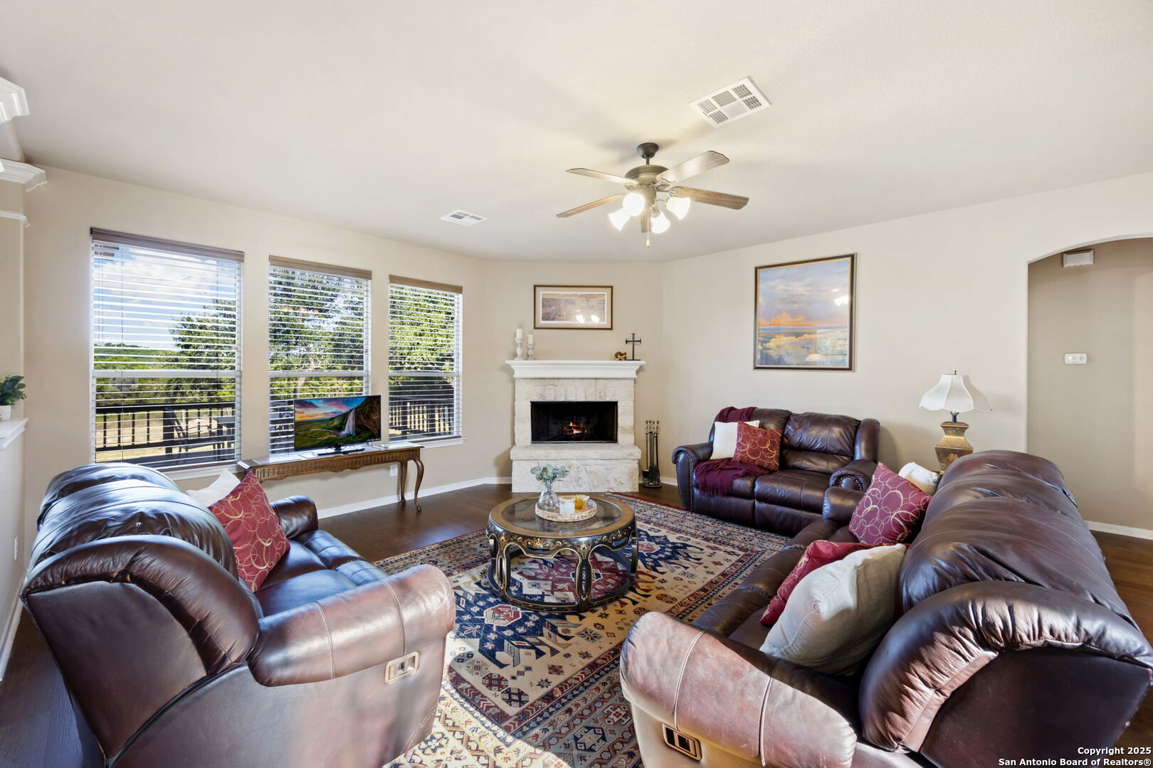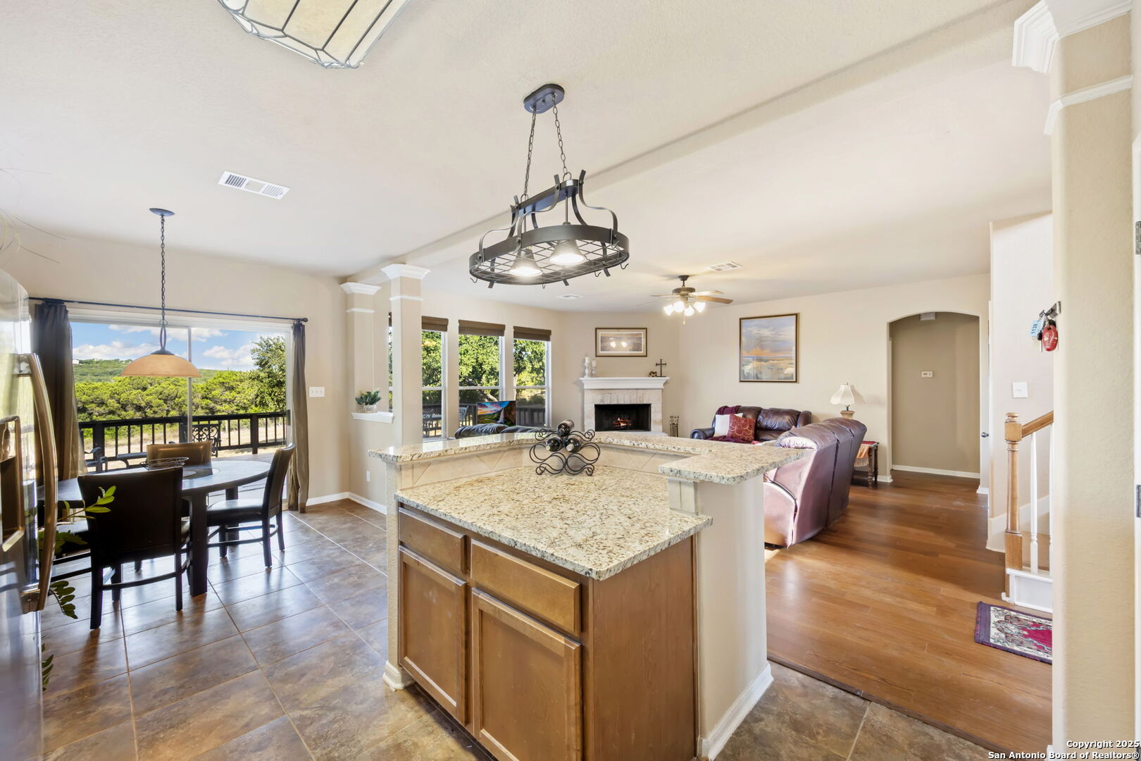 Nestled just outside the bedroom community of Helotes, this stunning home sits on slightly over an acre lot. Privacy abounds and is the perfect setting to add another garage or workshop, pool or more. There is an additional lot for sale next door too if you wanted to expand. City close, but complete country feel. The home has been inspected and repairs made, making it ready for the next owner. The charming stone front elevation and cozy front porch welcome you into an inviting entryway with a two-story ceiling. To the left, discover a formal dining room graced with a beautiful rustic chandelier, while to the right, a formal living room offers a perfect space for relaxing or visiting with guests. The main living room, located at the back of the floorplan, features a striking stone corner fireplace and a wall of windows that bathe the room in natural light, offering picturesque views of the outdoors. The open-concept kitchen boasts updated granite countertops, a diagonal tile backsplash, and stainless-steel appliances, including a smooth cooktop and built-in microwave. Adjacent to the kitchen, the well-lit yet cozy breakfast nook provides direct access to the large balcony, perfect for morning coffee or evening relaxation. Downstairs, the primary bedroom offers a private retreat with an ensuite bathroom, complete with a double vanity, whirlpool tub, and separate shower. A convenient half bath and laundry room are also located on the main floor. Upstairs, a versatile game room loft showcases outstanding hill country views, while the office area can easily serve as a third living room or a fifth bedroom. This home also includes two secondary bathrooms, ensuring ample space for all. Recent updates by the seller include the roof and deck. You will appreciate the storage shed that provides additional space for your belongings. With no HOA fees, this property offers both privacy and freedom. Experience the best of hill country living in this exceptional home while being close to shopping and restaurants!