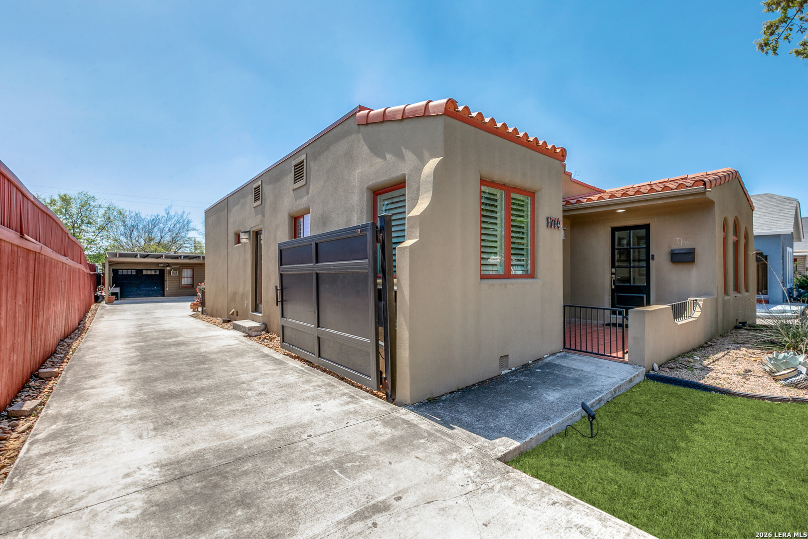 Welcome to 1714 W Summit Ave, a beautifully maintained rental home offering comfort, style, and exceptional outdoor living in the heart of San Antonio! This 2-bedroom, 2-bath residence features high ceilings, wood flooring throughout, and a thoughtfully designed layout with both a spacious living area and a separate dining room. The kitchen is well-appointed with custom cabinetry, custom countertops, and includes a refrigerator, dishwasher, and microwave, along with a cozy eat-in kitchen space. The primary suite offers a walk-in closet and a beautifully finished bathroom, while both bedrooms provide direct access to a private backyard deck, creating a seamless indoor-outdoor living experience. Custom details throughout the home include window shutters, upgraded lighting, a chandelier, and a charming faux fireplace that adds character to the living space. Step outside to a true backyard retreat featuring an in-ground heated pool, hot tub, and waterfall, all surrounded by an 8-foot privacy fence with a metal gate for added security. Additional highlights include garage storage and a separate garage apartment with a full bathroom, offering flexible use for guests, workspace, or additional living needs. Located just minutes from downtown San Antonio with easy access to major highways, this home combines convenience with a private, resort-style setting. Available for lease at $2,500 per month!
