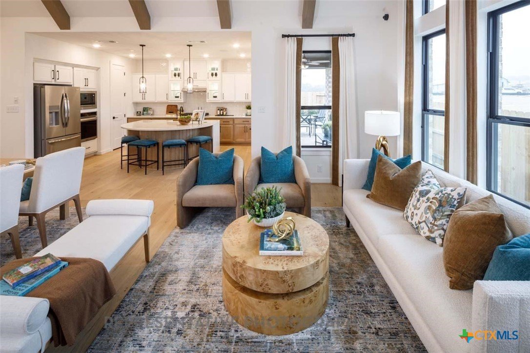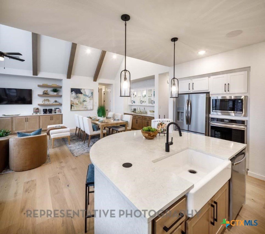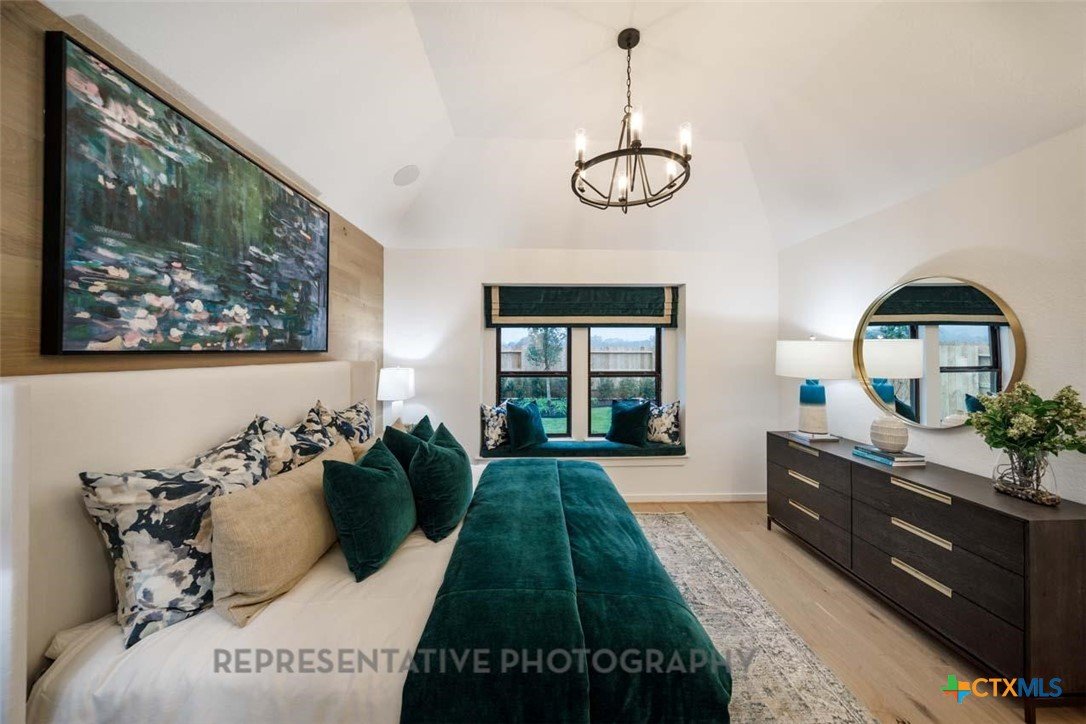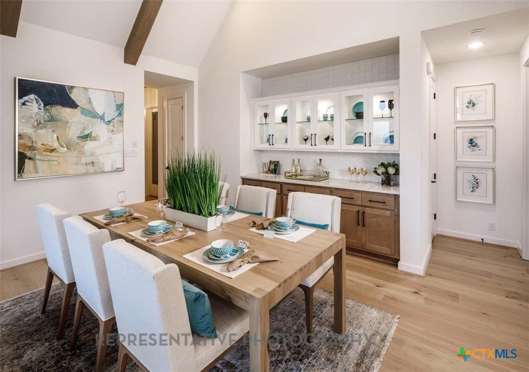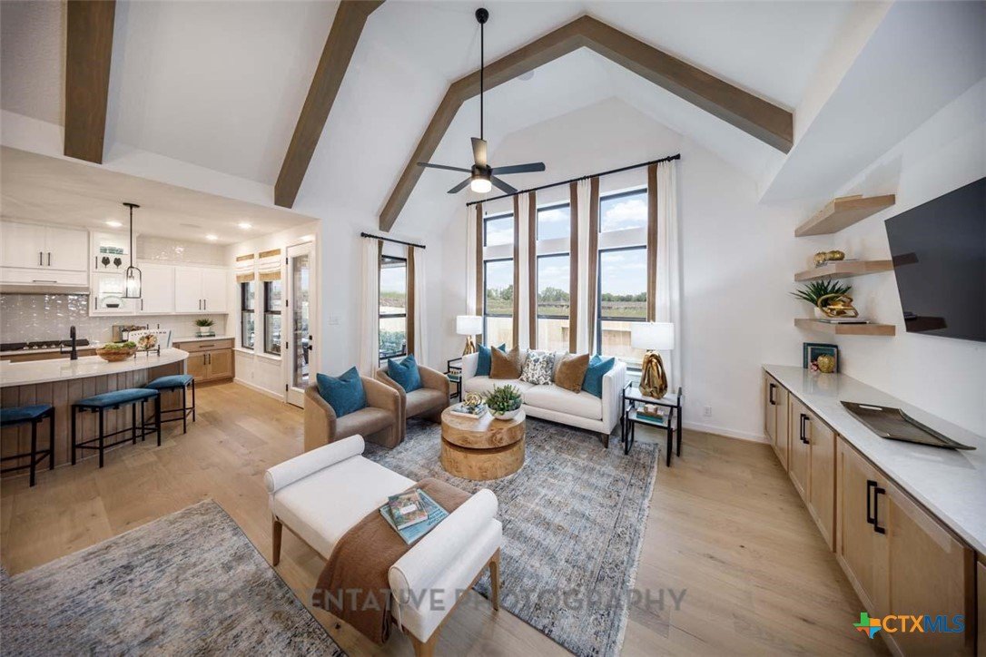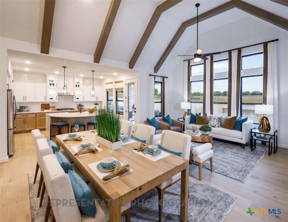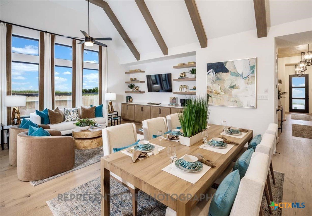 This beautifully designed one-story model home offers 2,200 square feet of thoughtfully planned living space with four bedrooms, three full baths, and a private study. The open-concept layout centers around a spacious gathering room and dining area, both highlighted by elegant steepled ceilings that create a bright, airy atmosphere. Designed for both everyday comfort and entertaining, this home blends functionality with refined architectural details throughout.