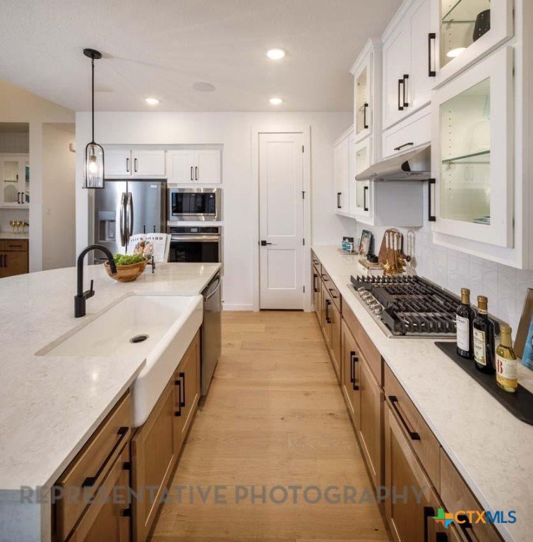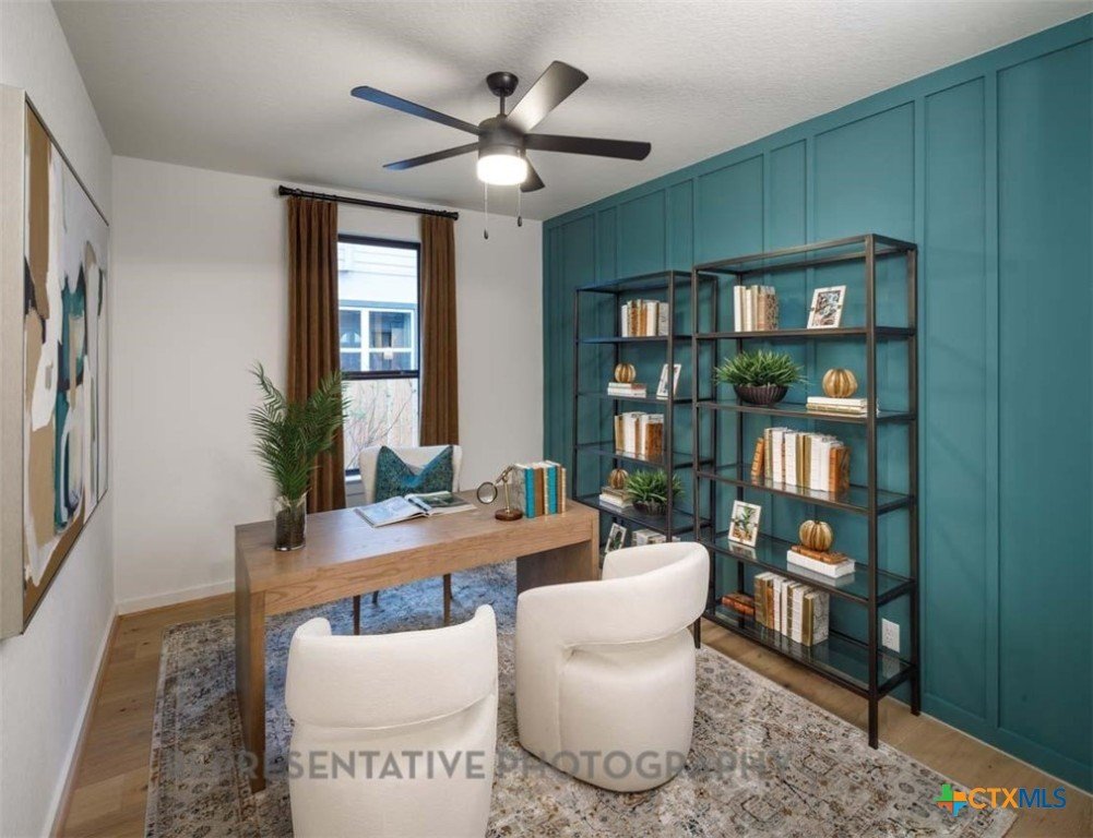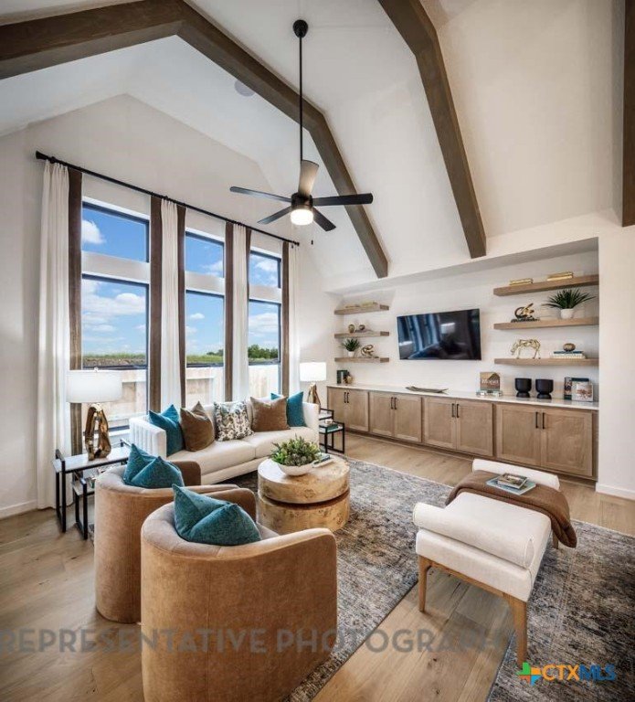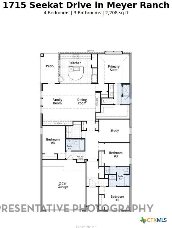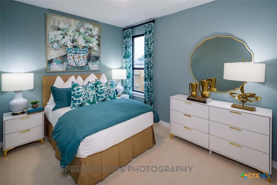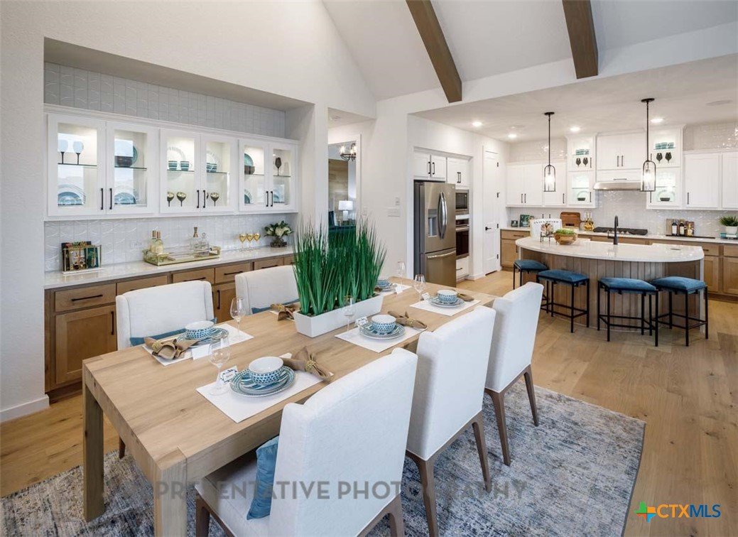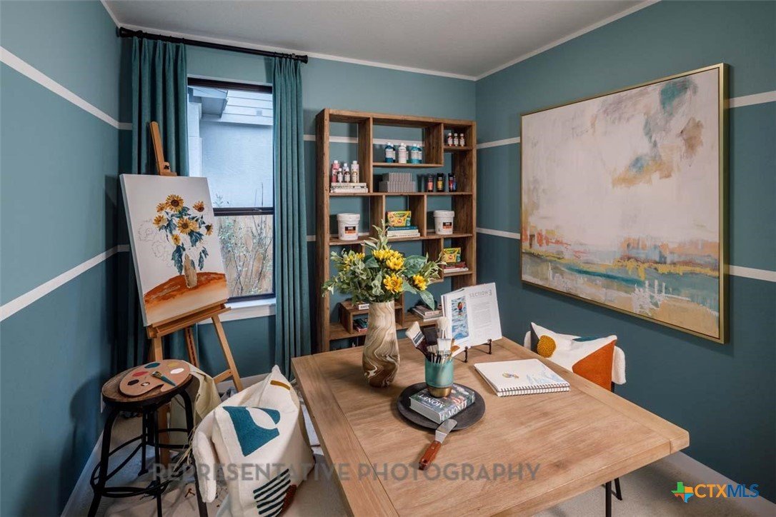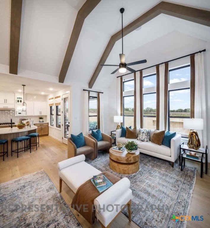 This beautifully designed one-story model home offers 2,200 square feet of thoughtfully planned living space with four bedrooms, three full baths, and a private study. The open-concept layout centers around a spacious gathering room and dining area, both highlighted by elegant steepled ceilings that create a bright, airy atmosphere. Designed for both everyday comfort and entertaining, this home blends functionality with refined architectural details throughout.