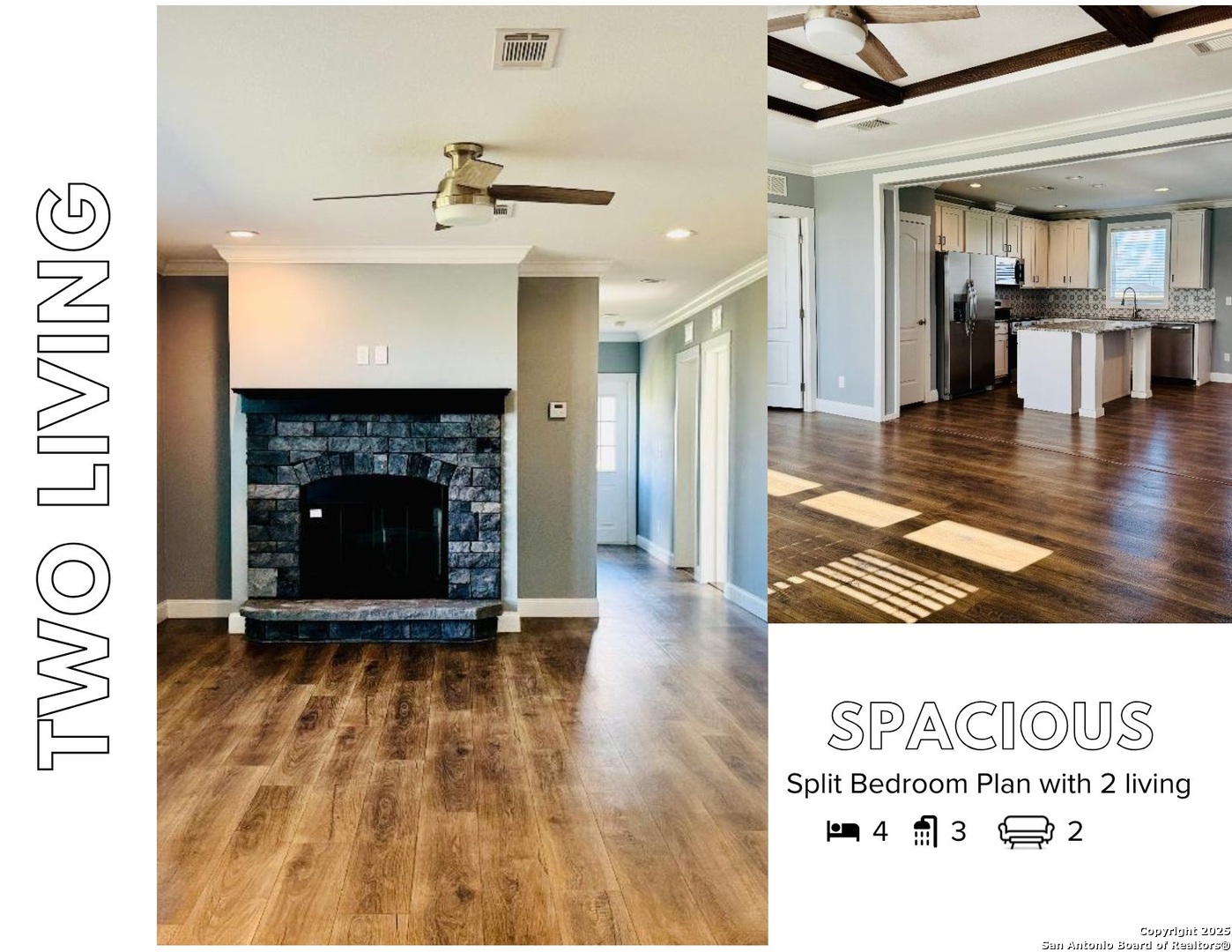 Where Design Meets Space - The One You've Been Waiting For! Beautiful 4-bedroom, 3-bath upscale Mhome on a full 1 ACRE in the desirable Medina Verde Subdivision of Natalia, TX. Seller Financing Available + VA Eligible! Step inside to an upscale interior design featuring an island kitchen with new appliances, a split-bedroom layout, two spacious living areas, featuring den with a cozy fireplace-perfect for a large family. Outside, the full acre offers space to park your RV, add a pool, build a workshop, or simply enjoy room to run, play, or host gatherings. A rare blend of comfort, style, and wide-open space-move-in ready. This Bank Owned opportunity won't last! Seller finance or VA, this is for you!