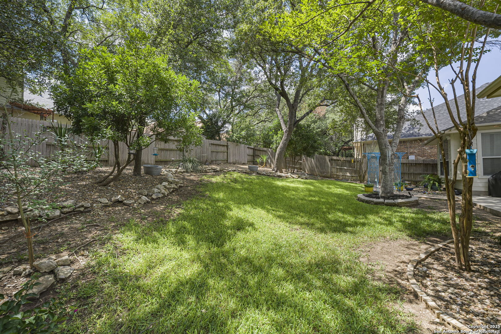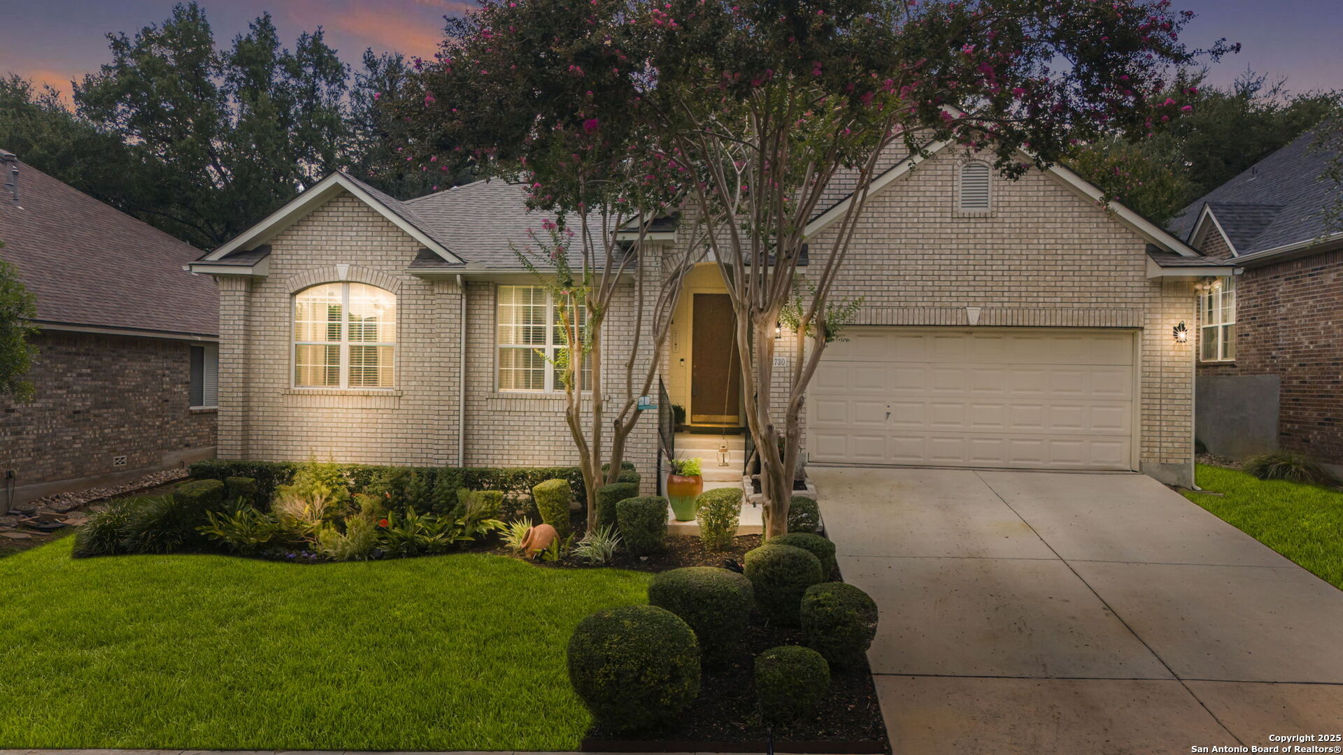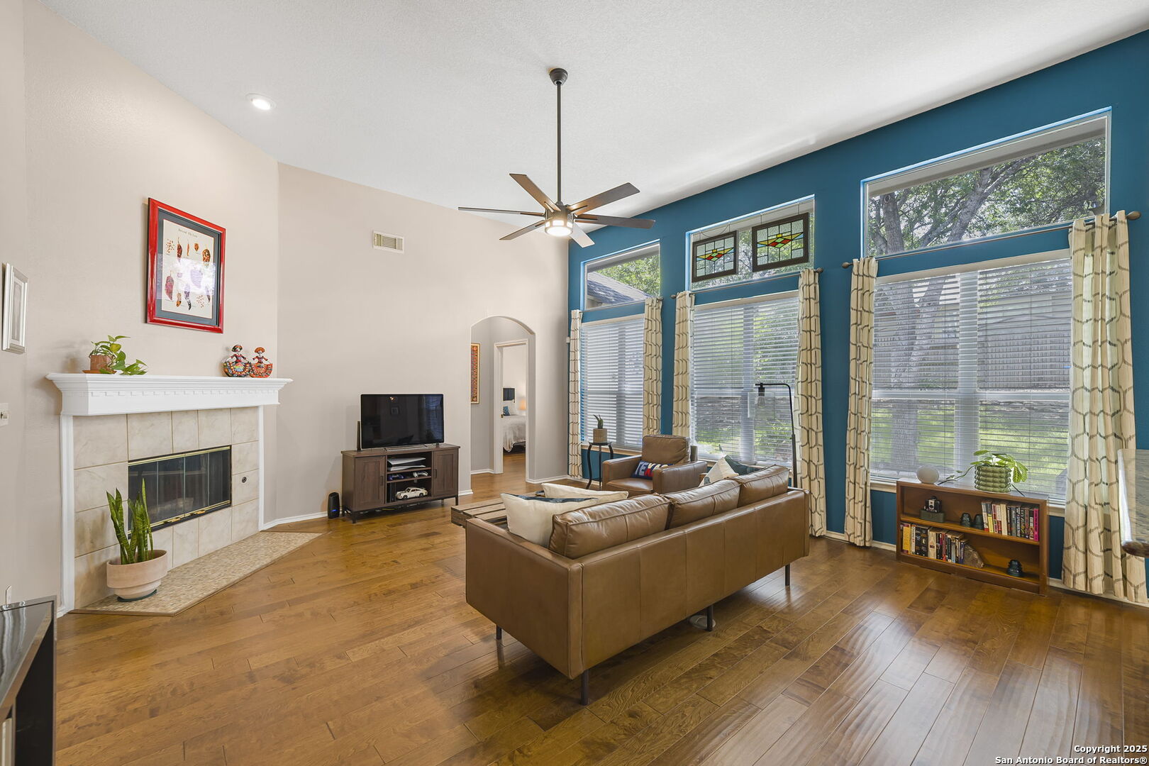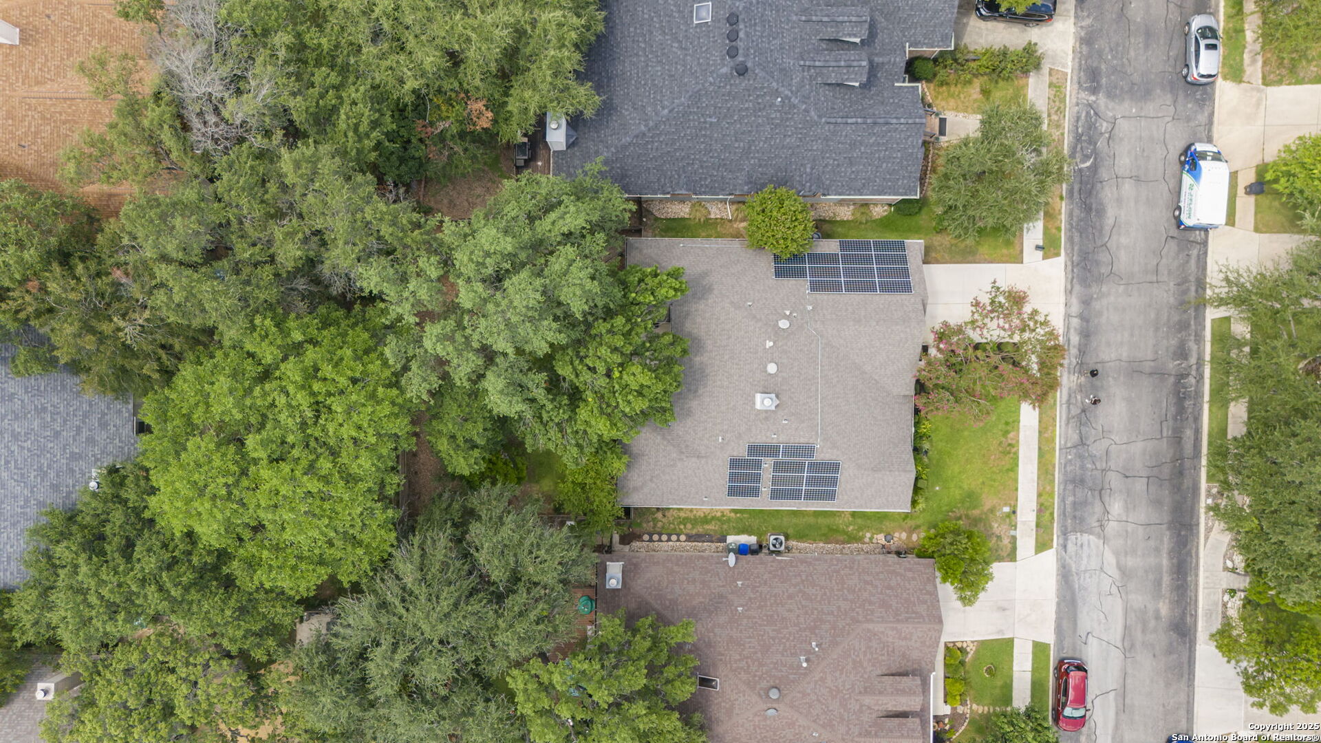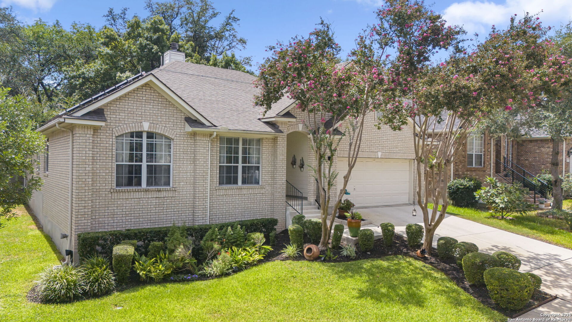 Elegant One-Story in The Gated Community of The Ridge at Deerfield! Situated on a quiet cul-de-sac and surrounded by mature trees this home offers a refined blend of sophistication, comfort, and modern efficiency. Enjoy unbelievably low electric bills thanks to the solar panels that will be completely paid off by the seller at closing. Architectural details such as arched entryways, art niches, tall ceilings, wood flooring throughout the entire home, and transom windows fill the space with light and character. The spacious living area centers around a gas fireplace, creating an inviting atmosphere. A formal dining room and a casual dining area offer versatile options for entertaining, while the kitchen features granite countertops, stainless appliances, a breakfast bar, and thoughtful design to accommodate both gatherings and everyday living. The primary suite is a true retreat, enhanced by a linear bay window overlooking the private backyard. Its spa-like bathroom includes a garden tub, glass-enclosed shower, dual vanities, and an expansive walk-in closet along with built-in storage. A private guest suite with its own ensuite bathroom provides comfort and privacy for visitors. Outdoors, the privacy-fenced backyard with a patio sets the stage for alfresco dining, quiet relaxation, and bird watching through the majestic oaks towering over the entire yard. Located within NEISD, with seamless access to Loop 1604, upscale shopping, fine dining, medical centers, and golf courses, this property offers a luxurious lifestyle in one of San Antonio's most sought-after gated communities.
