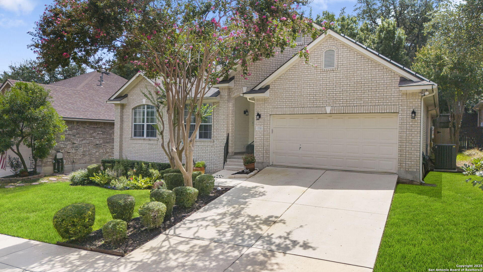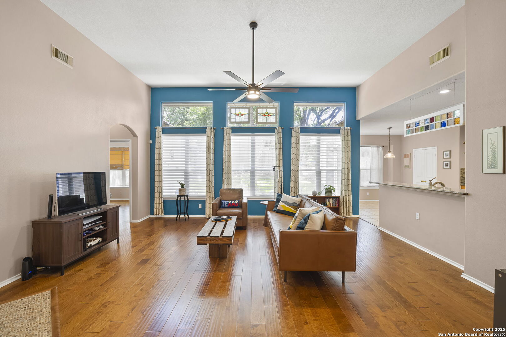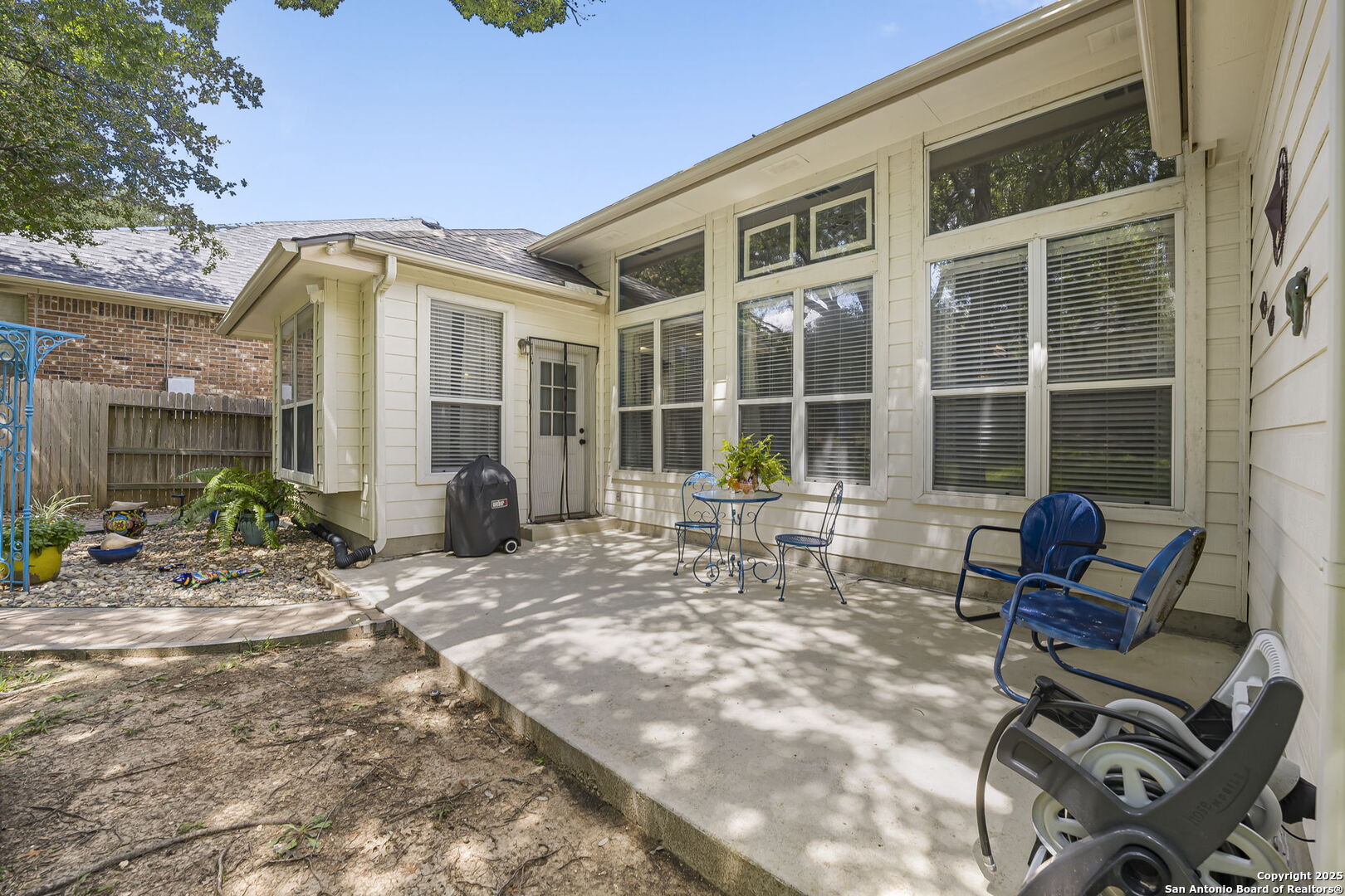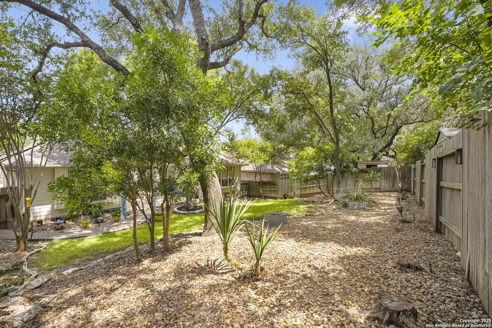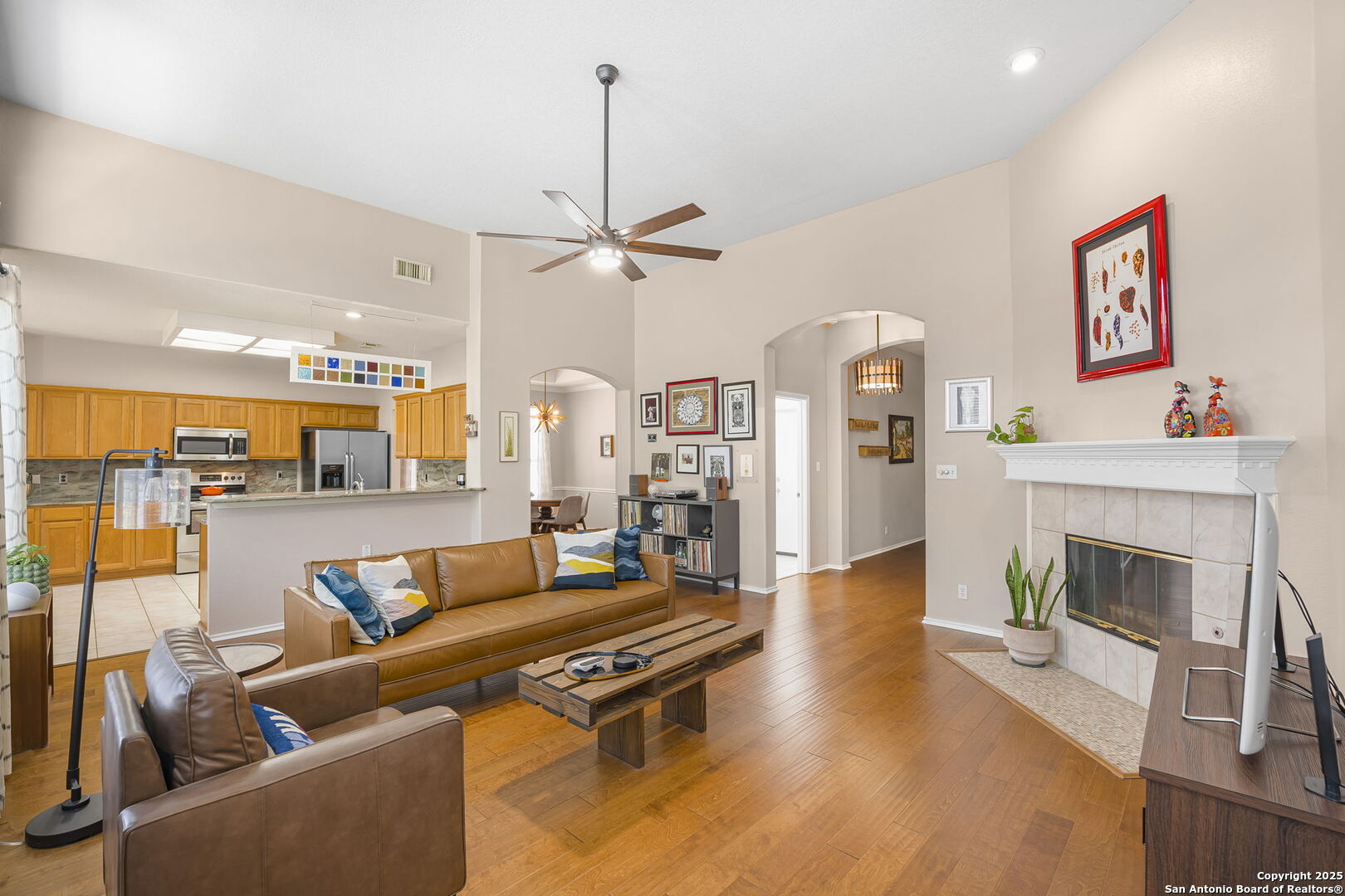 Elegant One-Story in The Gated Community of The Ridge at Deerfield! Situated on a quiet cul-de-sac and surrounded by mature trees this home offers a refined blend of sophistication, comfort, and modern efficiency. Enjoy unbelievably low electric bills thanks to the solar panels that will be completely paid off by the seller at closing. Architectural details such as arched entryways, art niches, tall ceilings, wood flooring throughout the entire home, and transom windows fill the space with light and character. The spacious living area centers around a gas fireplace, creating an inviting atmosphere. A formal dining room and a casual dining area offer versatile options for entertaining, while the kitchen features granite countertops, stainless appliances, a breakfast bar, and thoughtful design to accommodate both gatherings and everyday living. The primary suite is a true retreat, enhanced by a linear bay window overlooking the private backyard. Its spa-like bathroom includes a garden tub, glass-enclosed shower, dual vanities, and an expansive walk-in closet along with built-in storage. A private guest suite with its own ensuite bathroom provides comfort and privacy for visitors. Outdoors, the privacy-fenced backyard with a patio sets the stage for alfresco dining, quiet relaxation, and bird watching through the majestic oaks towering over the entire yard. Located within NEISD, with seamless access to Loop 1604, upscale shopping, fine dining, medical centers, and golf courses, this property offers a luxurious lifestyle in one of San Antonio's most sought-after gated communities.
