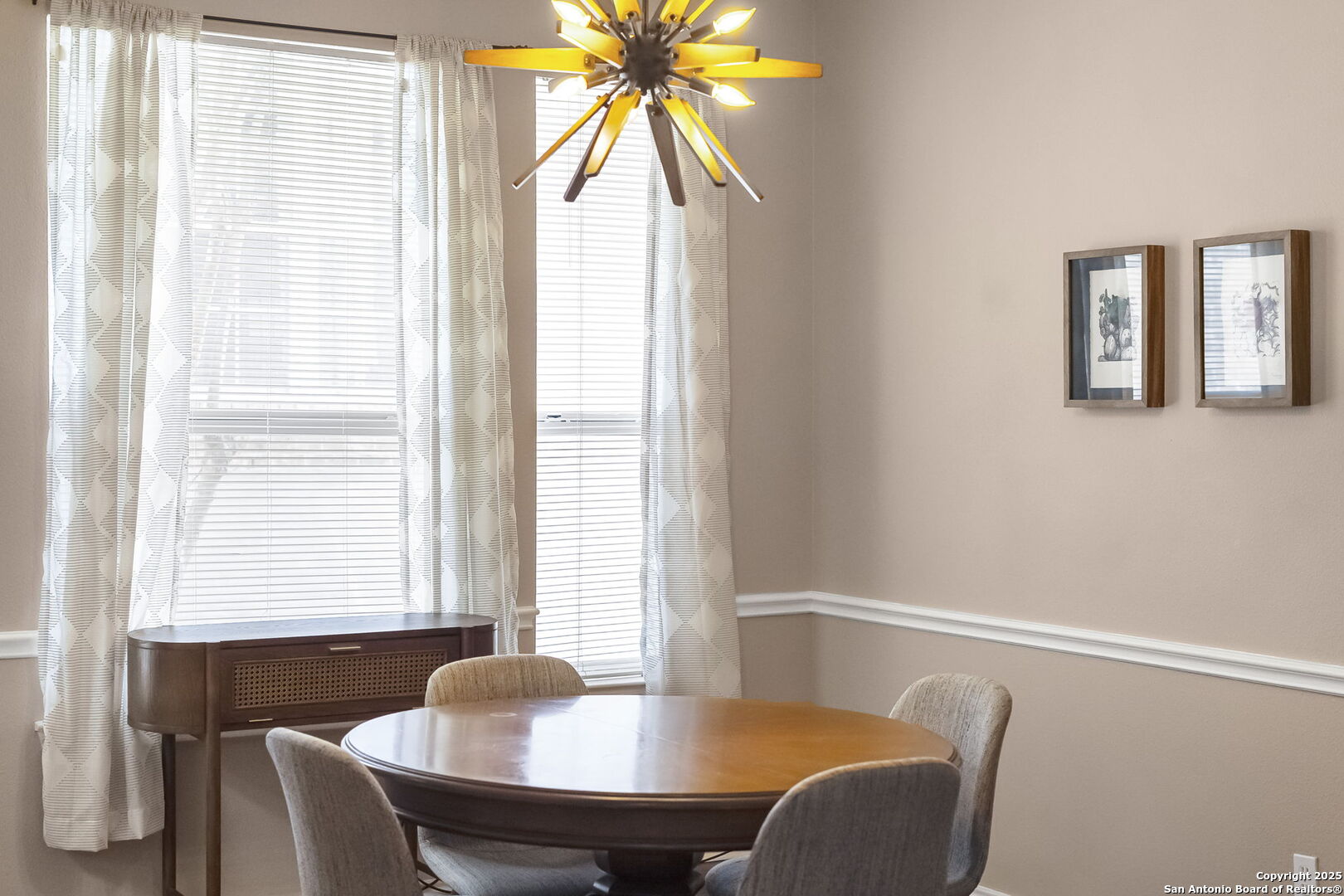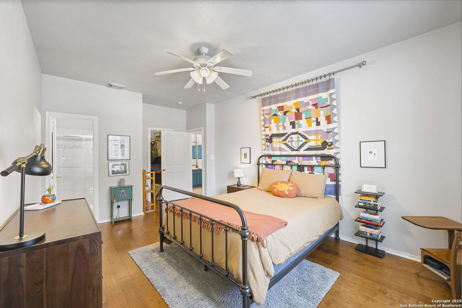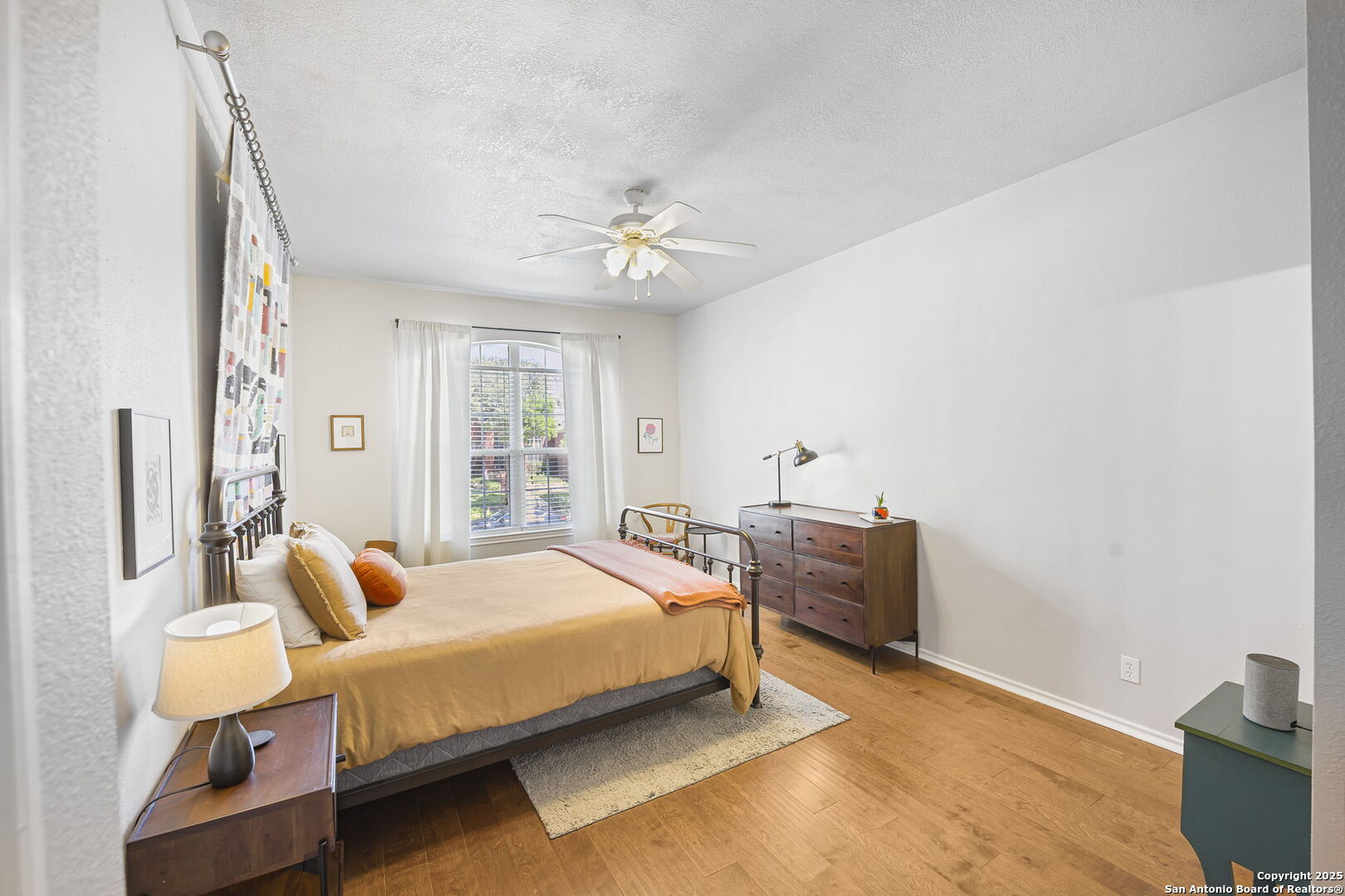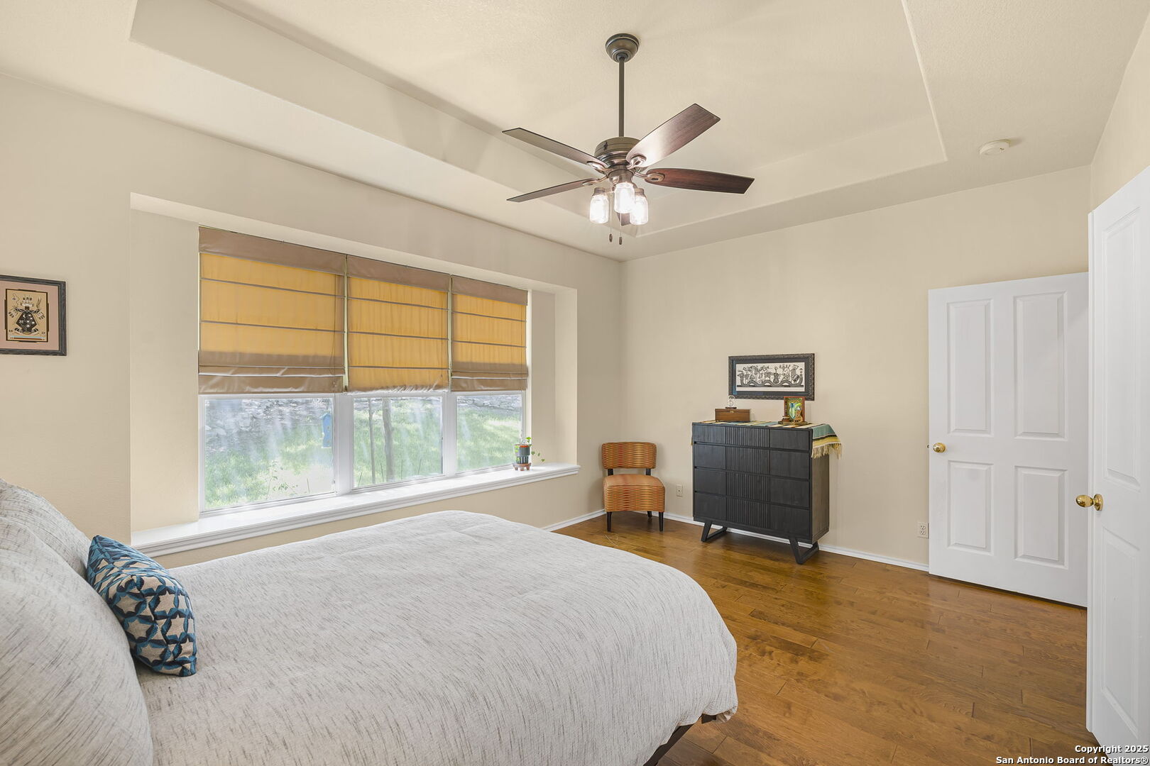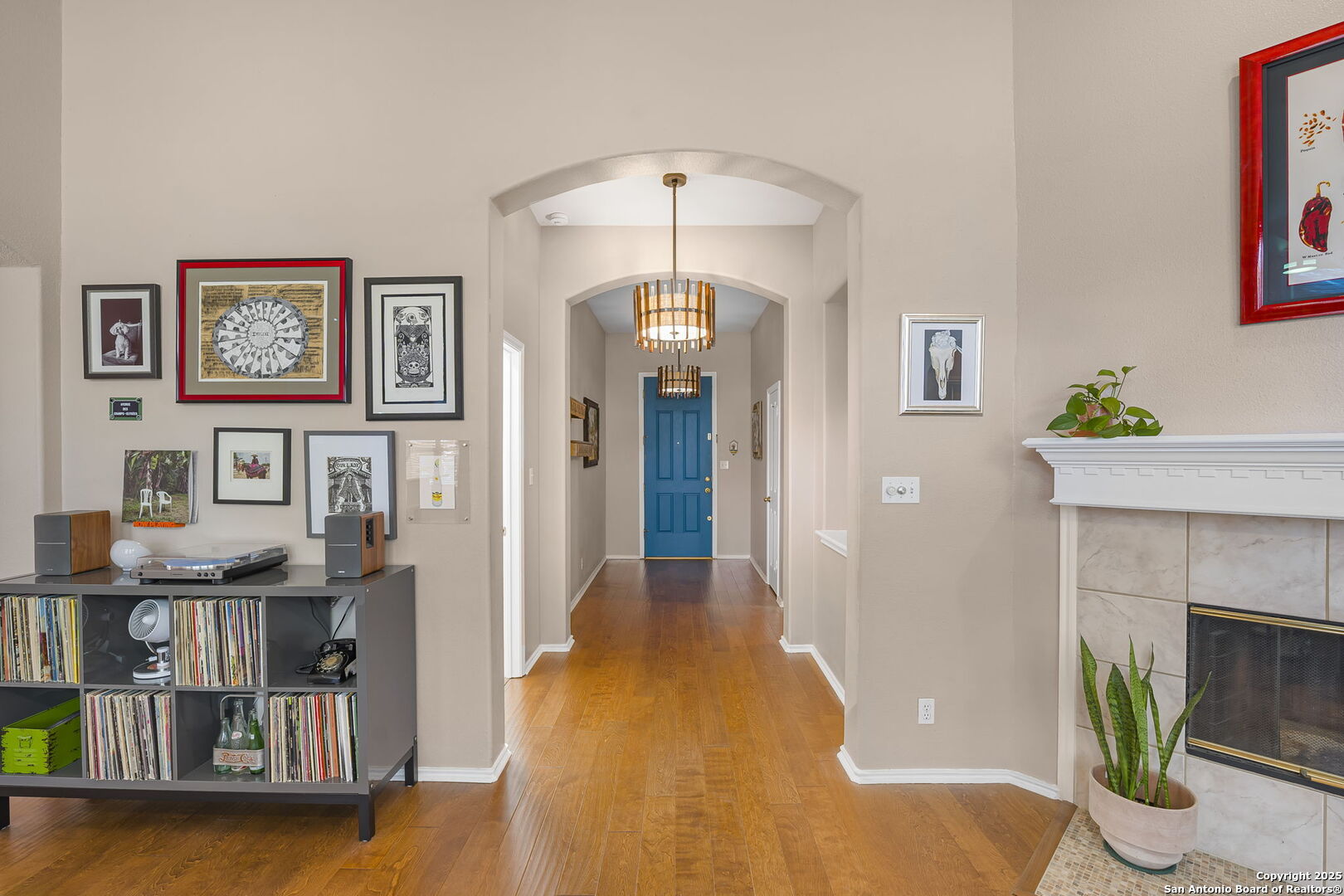 Elegant One-Story in The Gated Community of The Ridge at Deerfield! Situated on a quiet cul-de-sac and surrounded by mature trees this home offers a refined blend of sophistication, comfort, and modern efficiency. Enjoy unbelievably low electric bills thanks to the solar panels that will be completely paid off by the seller at closing. Architectural details such as arched entryways, art niches, tall ceilings, wood flooring throughout the entire home, and transom windows fill the space with light and character. The spacious living area centers around a gas fireplace, creating an inviting atmosphere. A formal dining room and a casual dining area offer versatile options for entertaining, while the kitchen features granite countertops, stainless appliances, a breakfast bar, and thoughtful design to accommodate both gatherings and everyday living. The primary suite is a true retreat, enhanced by a linear bay window overlooking the private backyard. Its spa-like bathroom includes a garden tub, glass-enclosed shower, dual vanities, and an expansive walk-in closet along with built-in storage. A private guest suite with its own ensuite bathroom provides comfort and privacy for visitors. Outdoors, the privacy-fenced backyard with a patio sets the stage for alfresco dining, quiet relaxation, and bird watching through the majestic oaks towering over the entire yard. Located within NEISD, with seamless access to Loop 1604, upscale shopping, fine dining, medical centers, and golf courses, this property offers a luxurious lifestyle in one of San Antonio's most sought-after gated communities.