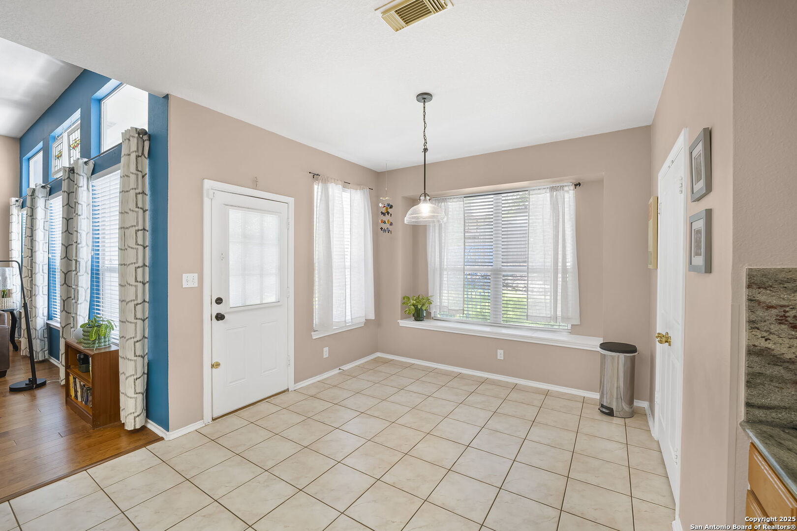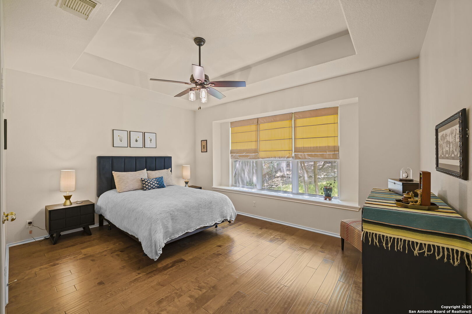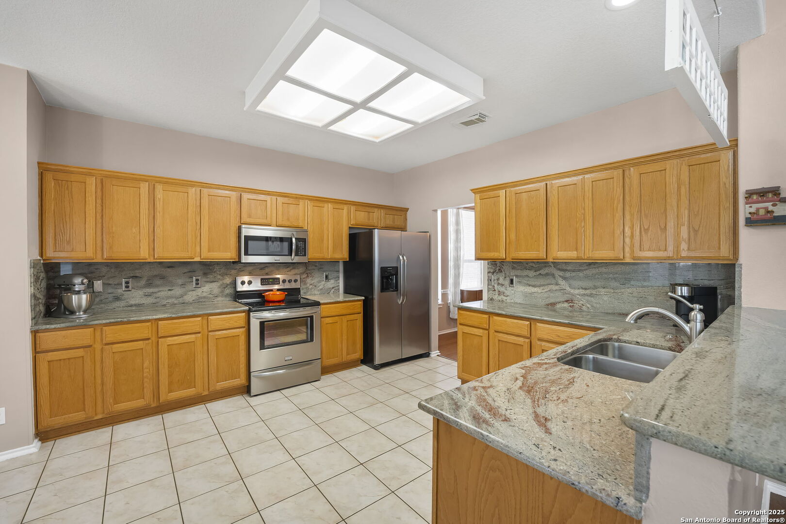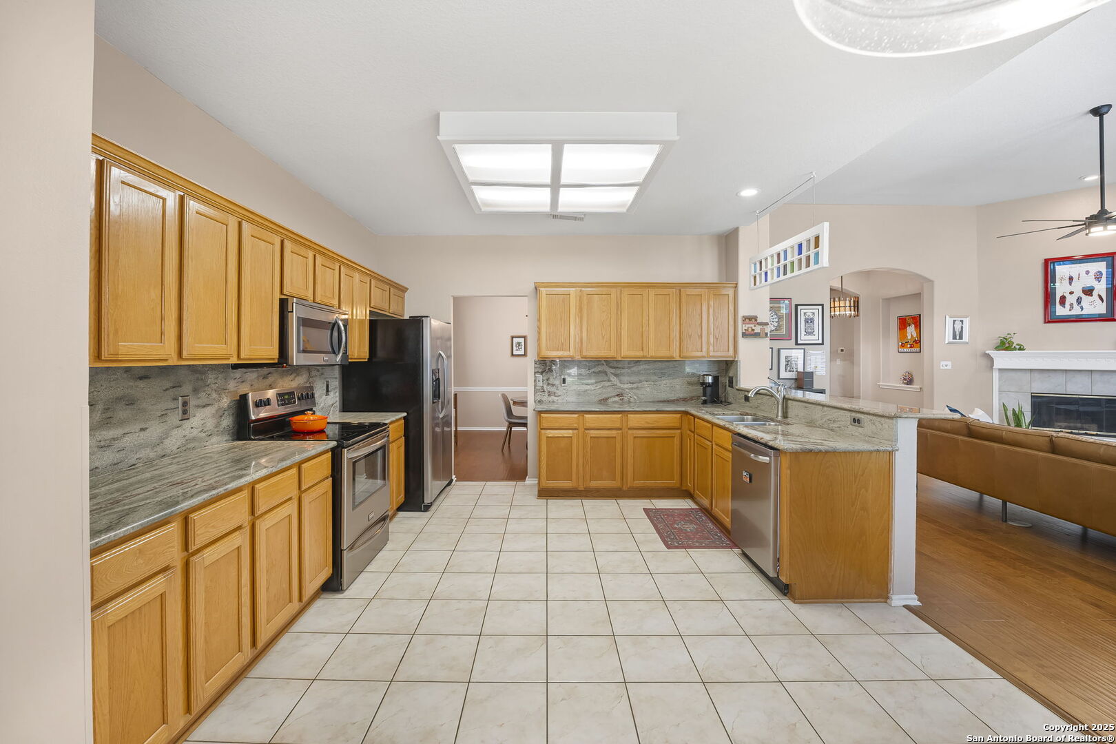 Elegant One-Story in The Gated Community of The Ridge at Deerfield! Situated on a quiet cul-de-sac and surrounded by mature trees this home offers a refined blend of sophistication, comfort, and modern efficiency. Enjoy unbelievably low electric bills thanks to the solar panels that will be completely paid off by the seller at closing. Architectural details such as arched entryways, art niches, tall ceilings, wood flooring throughout the entire home, and transom windows fill the space with light and character. The spacious living area centers around a gas fireplace, creating an inviting atmosphere. A formal dining room and a casual dining area offer versatile options for entertaining, while the kitchen features granite countertops, stainless appliances, a breakfast bar, and thoughtful design to accommodate both gatherings and everyday living. The primary suite is a true retreat, enhanced by a linear bay window overlooking the private backyard. Its spa-like bathroom includes a garden tub, glass-enclosed shower, dual vanities, and an expansive walk-in closet along with built-in storage. A private guest suite with its own ensuite bathroom provides comfort and privacy for visitors. Outdoors, the privacy-fenced backyard with a patio sets the stage for alfresco dining, quiet relaxation, and bird watching through the majestic oaks towering over the entire yard. Located within NEISD, with seamless access to Loop 1604, upscale shopping, fine dining, medical centers, and golf courses, this property offers a luxurious lifestyle in one of San Antonio's most sought-after gated communities.