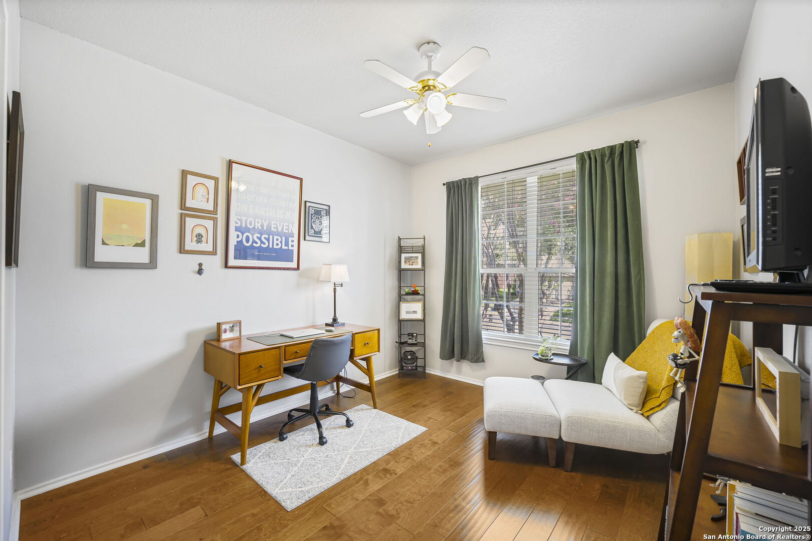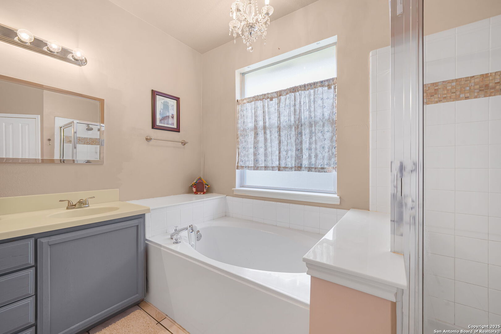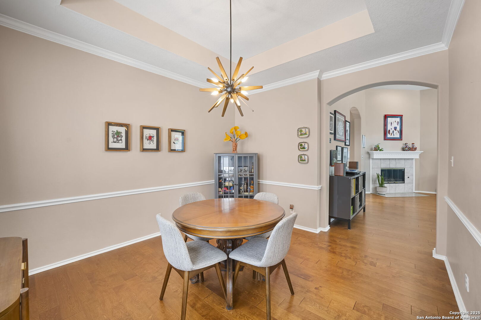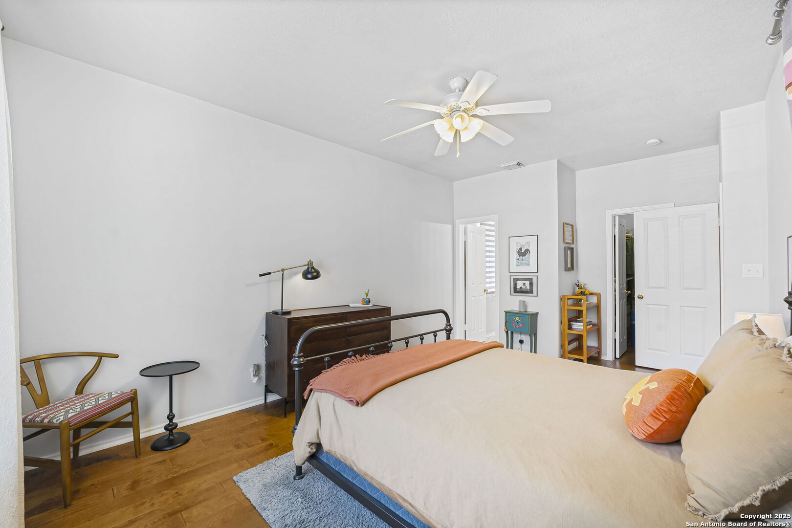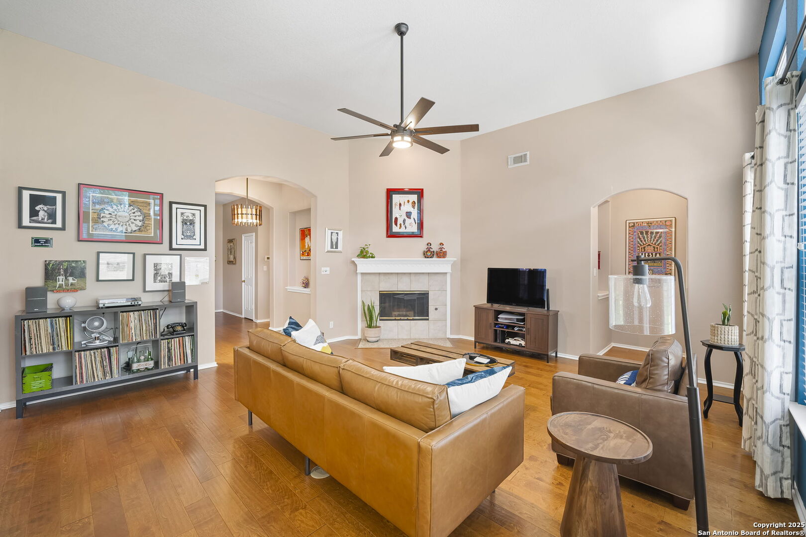 Elegant One-Story in The Gated Community of The Ridge at Deerfield! Situated on a quiet cul-de-sac and surrounded by mature trees this home offers a refined blend of sophistication, comfort, and modern efficiency. Enjoy unbelievably low electric bills thanks to the solar panels that will be completely paid off by the seller at closing. Architectural details such as arched entryways, art niches, tall ceilings, wood flooring throughout the entire home, and transom windows fill the space with light and character. The spacious living area centers around a gas fireplace, creating an inviting atmosphere. A formal dining room and a casual dining area offer versatile options for entertaining, while the kitchen features granite countertops, stainless appliances, a breakfast bar, and thoughtful design to accommodate both gatherings and everyday living. The primary suite is a true retreat, enhanced by a linear bay window overlooking the private backyard. Its spa-like bathroom includes a garden tub, glass-enclosed shower, dual vanities, and an expansive walk-in closet along with built-in storage. A private guest suite with its own ensuite bathroom provides comfort and privacy for visitors. Outdoors, the privacy-fenced backyard with a patio sets the stage for alfresco dining, quiet relaxation, and bird watching through the majestic oaks towering over the entire yard. Located within NEISD, with seamless access to Loop 1604, upscale shopping, fine dining, medical centers, and golf courses, this property offers a luxurious lifestyle in one of San Antonio's most sought-after gated communities.