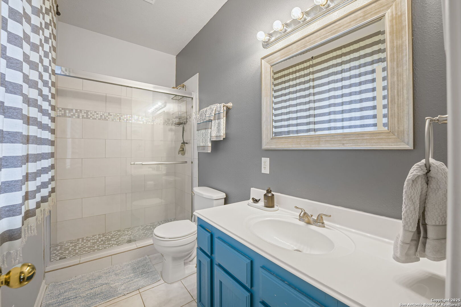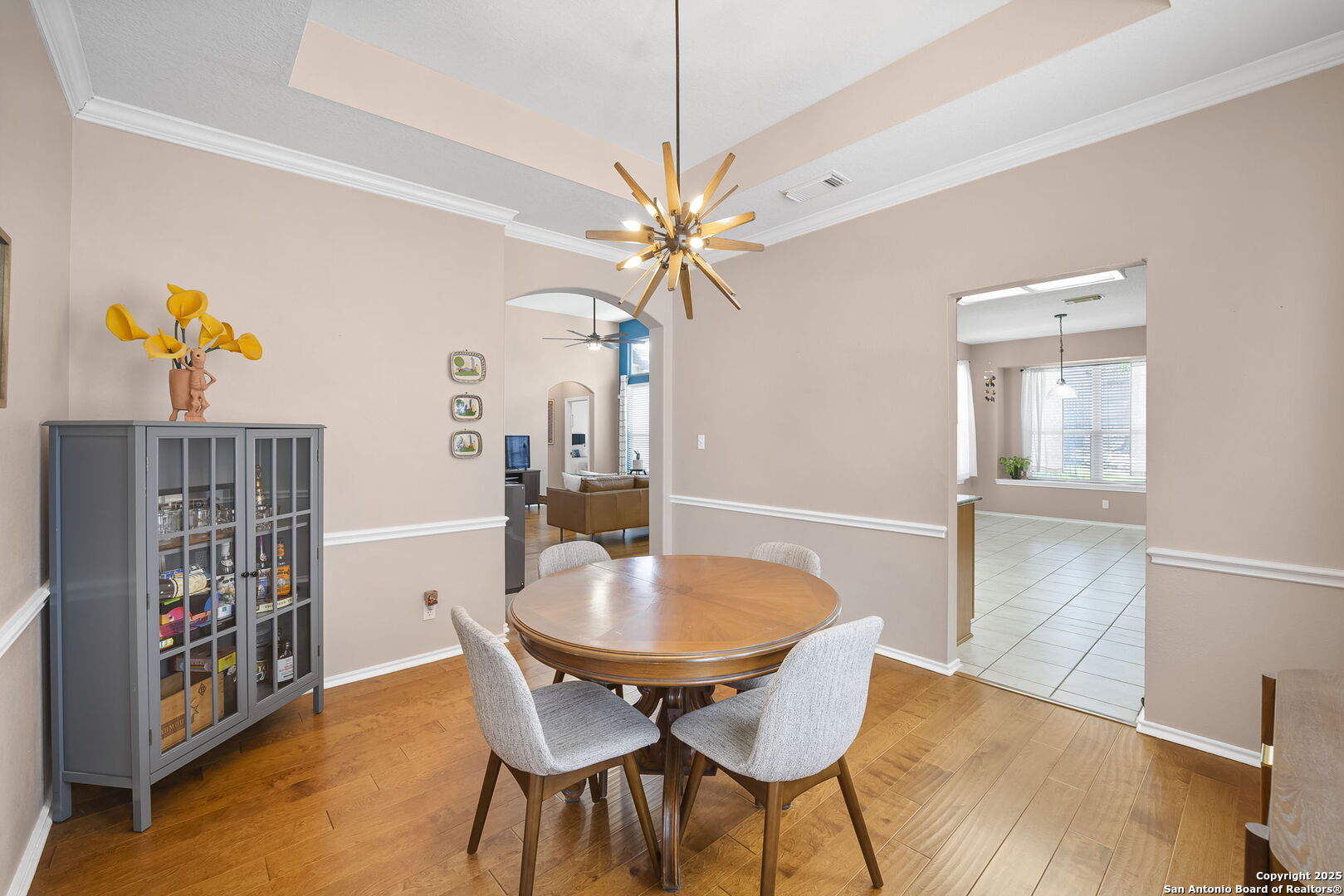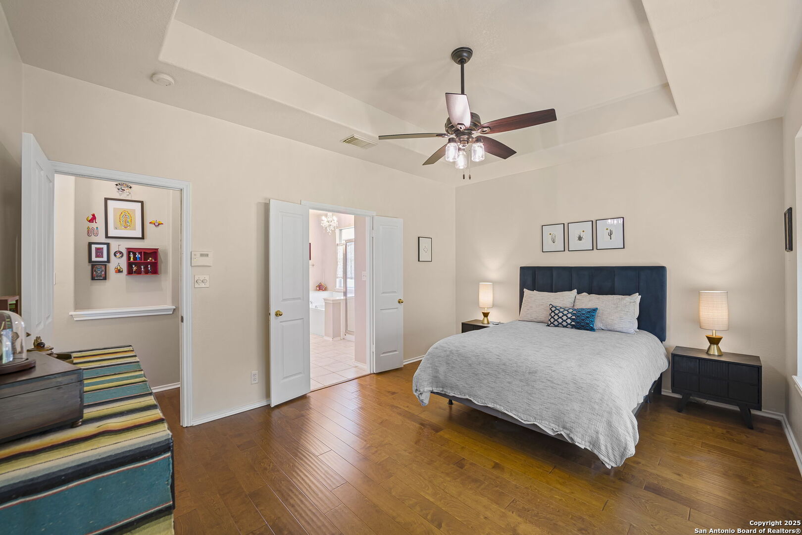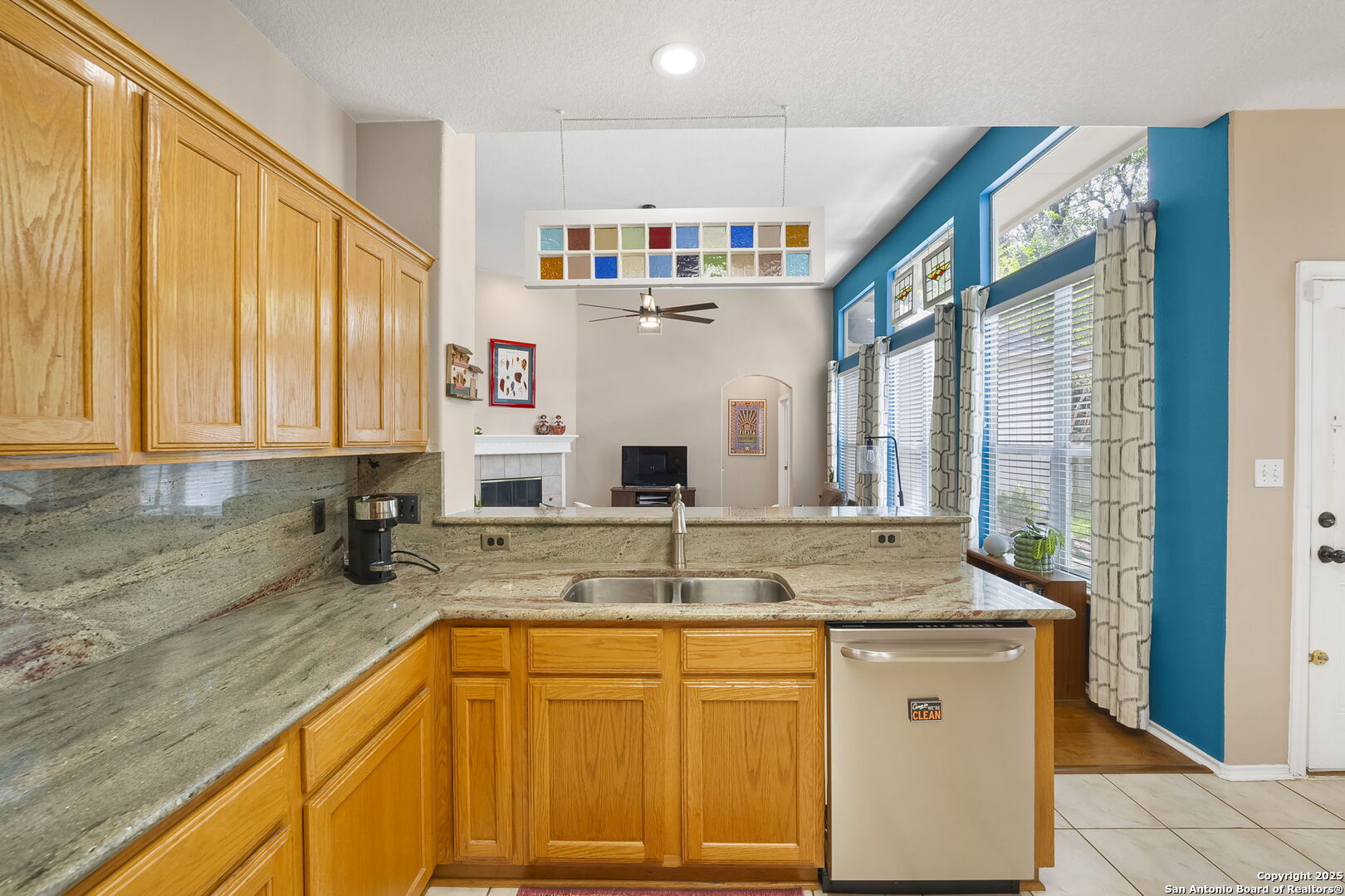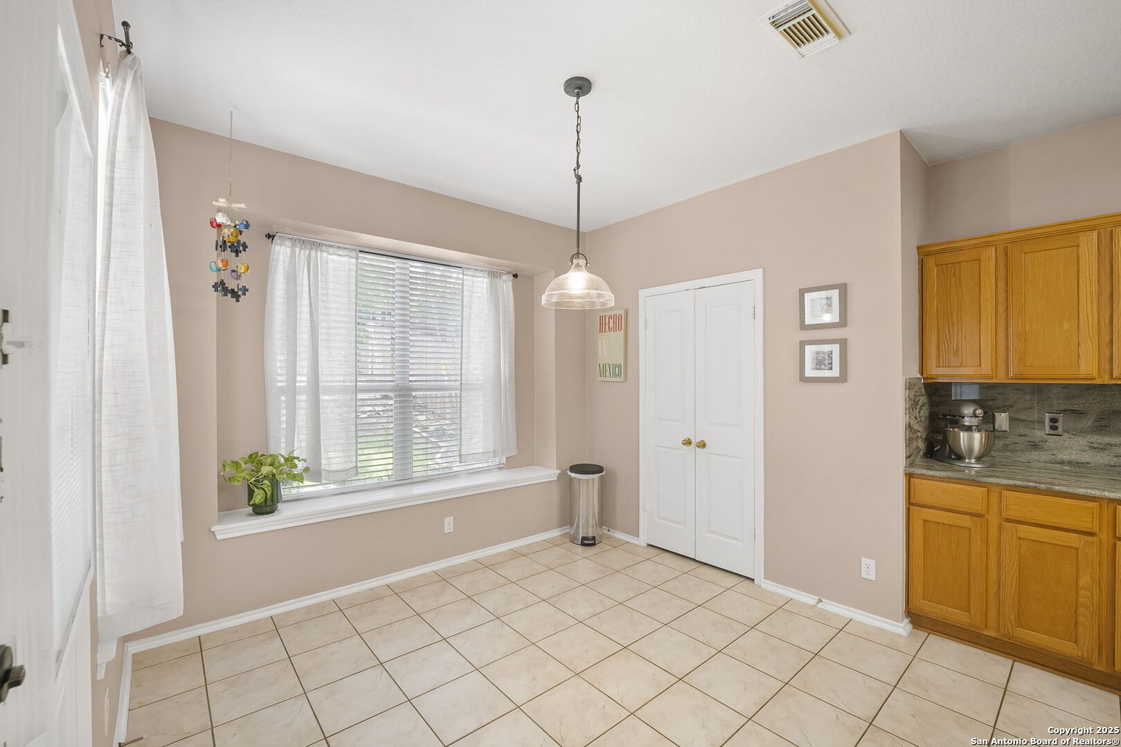 Elegant One-Story in The Gated Community of The Ridge at Deerfield! Situated on a quiet cul-de-sac and surrounded by mature trees this home offers a refined blend of sophistication, comfort, and modern efficiency. Enjoy unbelievably low electric bills thanks to the solar panels that will be completely paid off by the seller at closing. Architectural details such as arched entryways, art niches, tall ceilings, wood flooring throughout the entire home, and transom windows fill the space with light and character. The spacious living area centers around a gas fireplace, creating an inviting atmosphere. A formal dining room and a casual dining area offer versatile options for entertaining, while the kitchen features granite countertops, stainless appliances, a breakfast bar, and thoughtful design to accommodate both gatherings and everyday living. The primary suite is a true retreat, enhanced by a linear bay window overlooking the private backyard. Its spa-like bathroom includes a garden tub, glass-enclosed shower, dual vanities, and an expansive walk-in closet along with built-in storage. A private guest suite with its own ensuite bathroom provides comfort and privacy for visitors. Outdoors, the privacy-fenced backyard with a patio sets the stage for alfresco dining, quiet relaxation, and bird watching through the majestic oaks towering over the entire yard. Located within NEISD, with seamless access to Loop 1604, upscale shopping, fine dining, medical centers, and golf courses, this property offers a luxurious lifestyle in one of San Antonio's most sought-after gated communities.