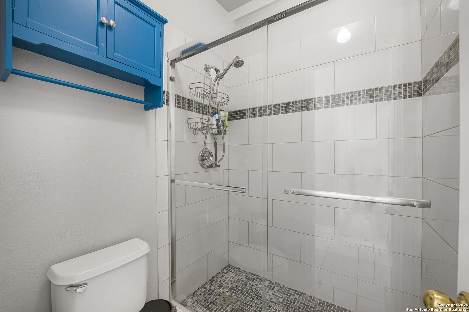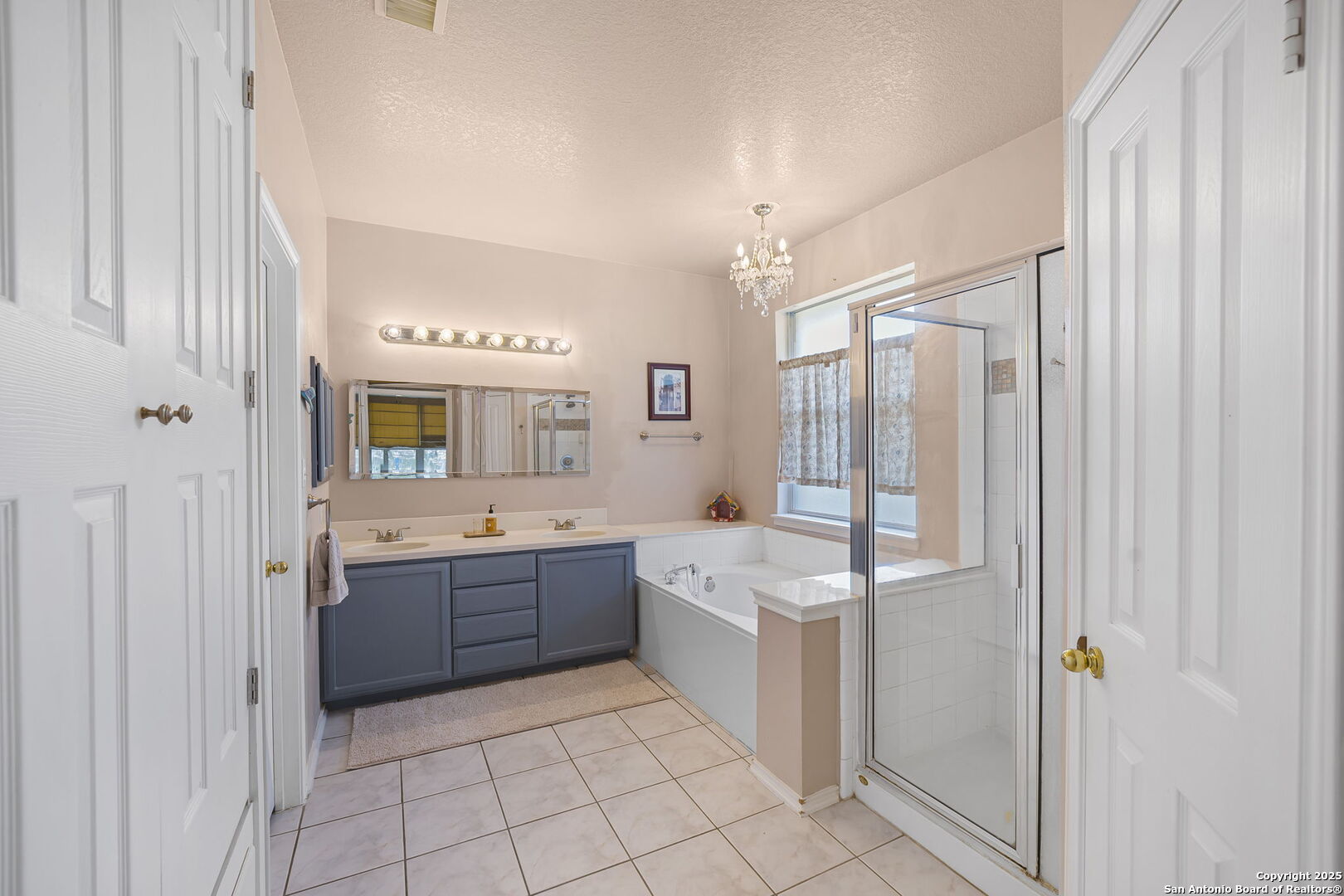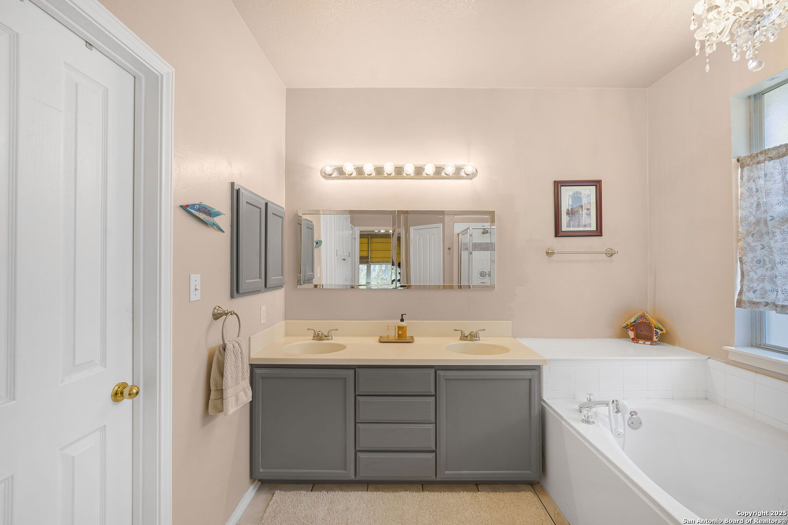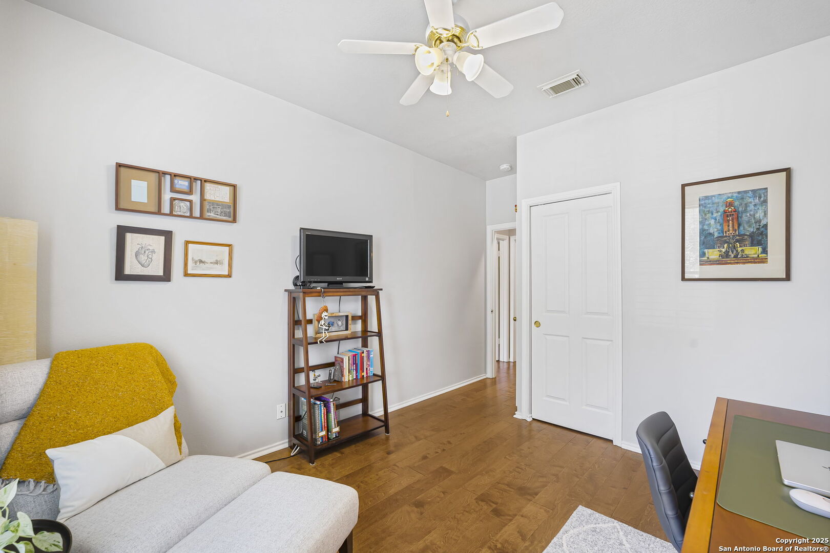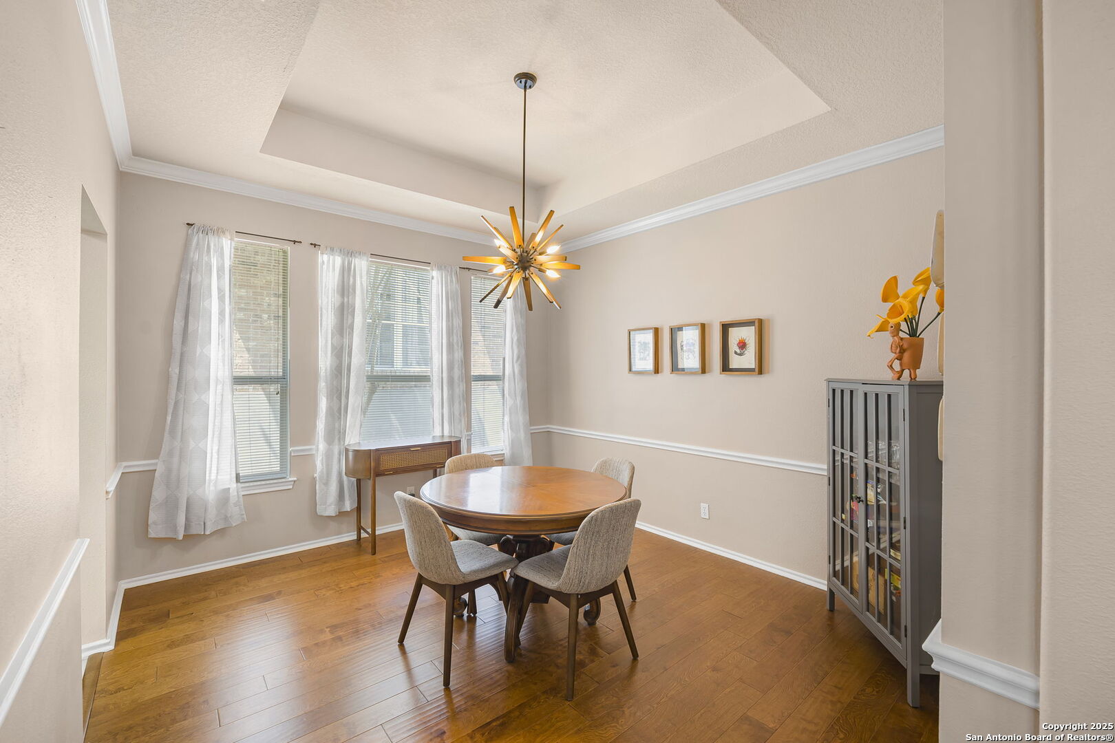 Elegant One-Story in The Gated Community of The Ridge at Deerfield! Situated on a quiet cul-de-sac and surrounded by mature trees this home offers a refined blend of sophistication, comfort, and modern efficiency. Enjoy unbelievably low electric bills thanks to the solar panels that will be completely paid off by the seller at closing. Architectural details such as arched entryways, art niches, tall ceilings, wood flooring throughout the entire home, and transom windows fill the space with light and character. The spacious living area centers around a gas fireplace, creating an inviting atmosphere. A formal dining room and a casual dining area offer versatile options for entertaining, while the kitchen features granite countertops, stainless appliances, a breakfast bar, and thoughtful design to accommodate both gatherings and everyday living. The primary suite is a true retreat, enhanced by a linear bay window overlooking the private backyard. Its spa-like bathroom includes a garden tub, glass-enclosed shower, dual vanities, and an expansive walk-in closet along with built-in storage. A private guest suite with its own ensuite bathroom provides comfort and privacy for visitors. Outdoors, the privacy-fenced backyard with a patio sets the stage for alfresco dining, quiet relaxation, and bird watching through the majestic oaks towering over the entire yard. Located within NEISD, with seamless access to Loop 1604, upscale shopping, fine dining, medical centers, and golf courses, this property offers a luxurious lifestyle in one of San Antonio's most sought-after gated communities.