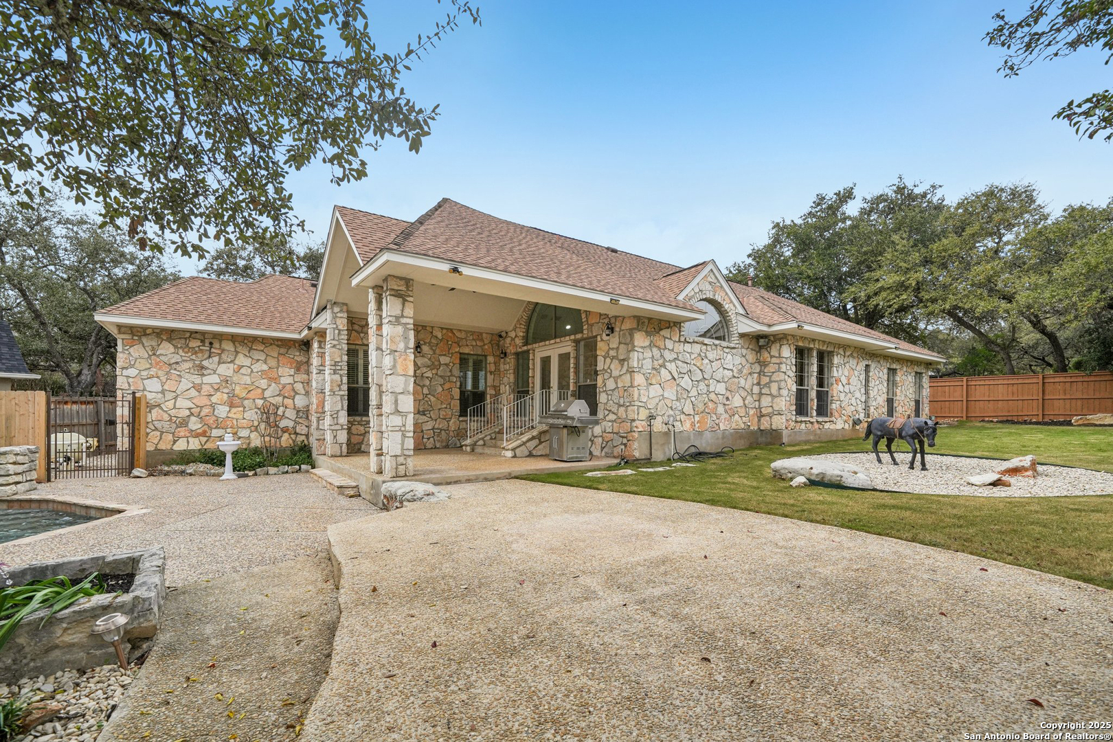 Located in the highly desirable Fountains at Deerfield, this well-maintained single-story home offers an exceptional blend of comfort, elegance, and privacy within a gated, guard-monitored community. Situated on an oversized cul-de-sac lot, the property is surrounded by mature trees, refreshed landscaping, and a peaceful setting, all while remaining inside Loop 1604 with convenient access to shopping, dining, and major highways. The front exterior features low-maintenance xeriscaping. Inside, the bright and open floor plan showcases tall vaulted ceilings, graceful architectural arches, and abundant natural light across multiple living areas. A private front office features a striking stone fireplace, custom built-in cabinetry, and integrated speakers, with the flexibility and layout to function as a potential 4th bedroom. The formal dining room is highlighted by a beautiful chandelier, creating an elegant space for entertaining. The spacious primary suite serves as a private retreat with separate vanities, a generous walk-in closet, and a large walk-in shower enhanced by thoughtful lighting. The kitchen is designed for both everyday living and entertaining, offering high-end granite countertops, a substantial stone island, custom cabinetry, a gas cooktop, and built-in oven and microwave. Outdoor living is equally impressive with a large covered patio, an in-ground pool with fountains, and a stone privacy wall. Recent updates include approximately $100,000 in updates made to the home, full interior painting, new carpet, new exterior trim paint, a new garage door with repainted doors, painted garage floors, refreshed front and back landscaping with new sod, and professional tree trimming. Additional features include a reverse osmosis water filtration system, a fully serviced HVAC system with a new thermostat, sealed ductwork, electrical updates brought to current standards, ceiling fans, and new exterior lighting. This quiet cul-de-sac home offers thoughtful upgrades, timeless design, and a prime San Antonio location within Deerfield. Zoned to the highly regarded NEISD and Churchill High School, with easy access to Loop 1604 and a short commute to Camp Bullis Military Base.