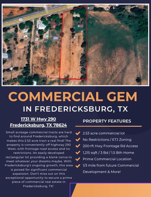 COMMERCIAL GEM IN FREDERICKSBURG – Small acreage commercial tracts are hard to find around Fredericksburg, which makes this 2.53 acre tract a real find! The property is located just a quarter mile from the city limits and conveniently off highway 290 West and has no restrictions. Offering approx 200+ feet of road frontage, this nice rectangular shaped lot can be easily developed and provides a blank canva to meet whatever your dreams maybe. The property offers plenty of room for your endeavor and would make a great office space, veterinarian clinic, STR complex, church, just about anything you can imagine. The existing home is a 3 Bedroom / 1.5 Bath home with 1,215 sqft and is conveniently tucked away on the front corner of the property, offering most of the lot wide open for additional development. The home is cute and livable and can be easily incorporated into your project with the option of seller relocating the home off the property to maximize the use of the lot. Plus, there is an additional 1.61 acre tract available to the South of the lot that includes a 2,274 sqft home off of Joe Duderstadt Road. The property's location is unbeatable, situated 1.5 miles from Market Square and just a third of a mile from future commercial developments, including a large hotel and event center located at highway 290 and highway 87. With Fredericksburg's ongoing growth, this area is poised for significant commercial expansion. Don't miss out on this exceptional opportunity to secure a prime piece of commercial real estate in Fredericksburg, TX! Whether you're looking to develop or invest, this property has everything you need to make your dreams a reality a true commercial gem!