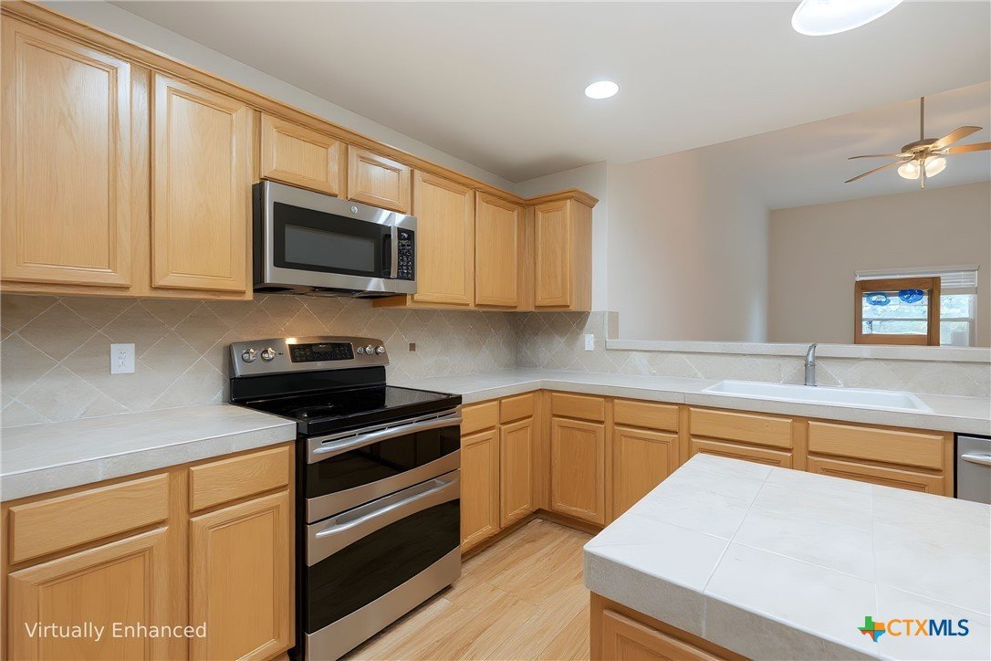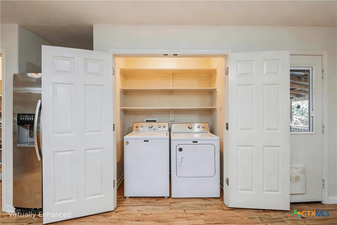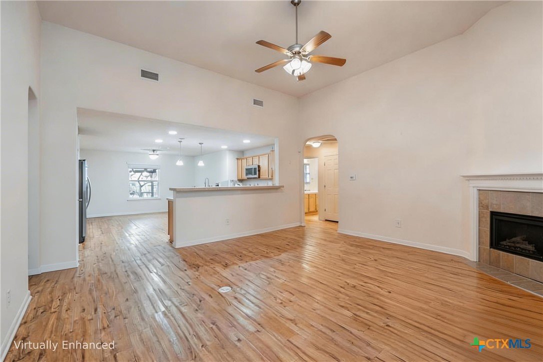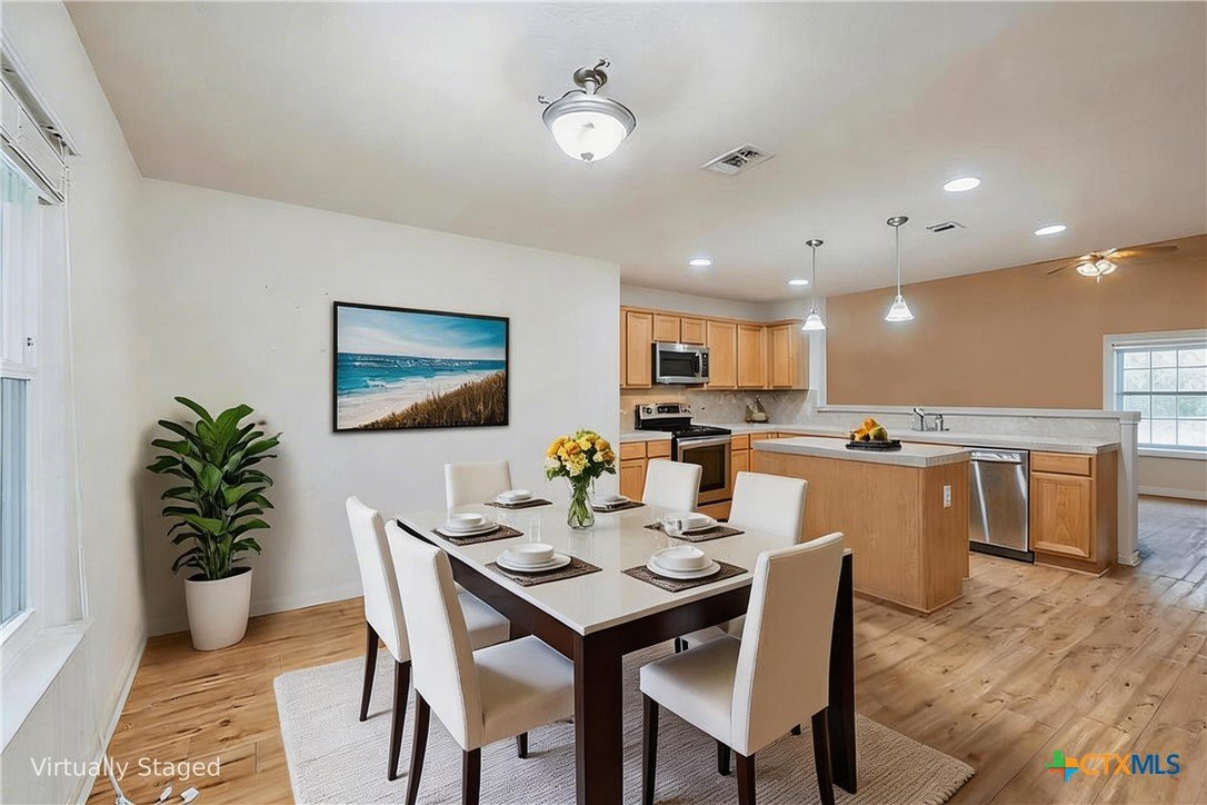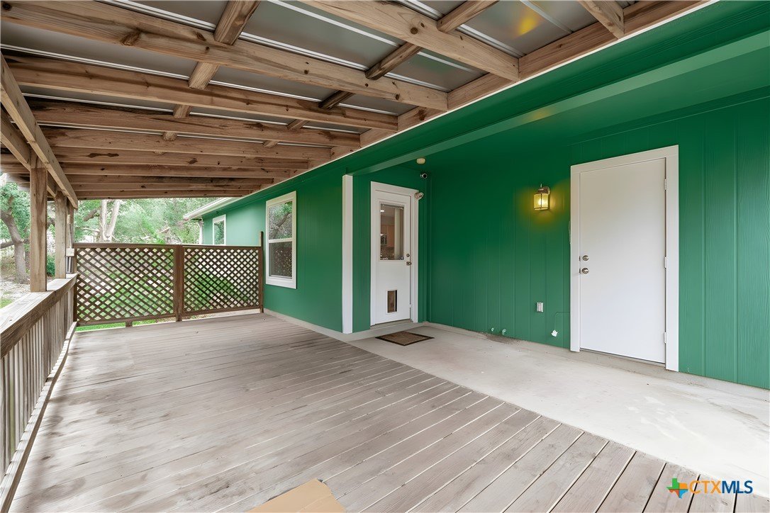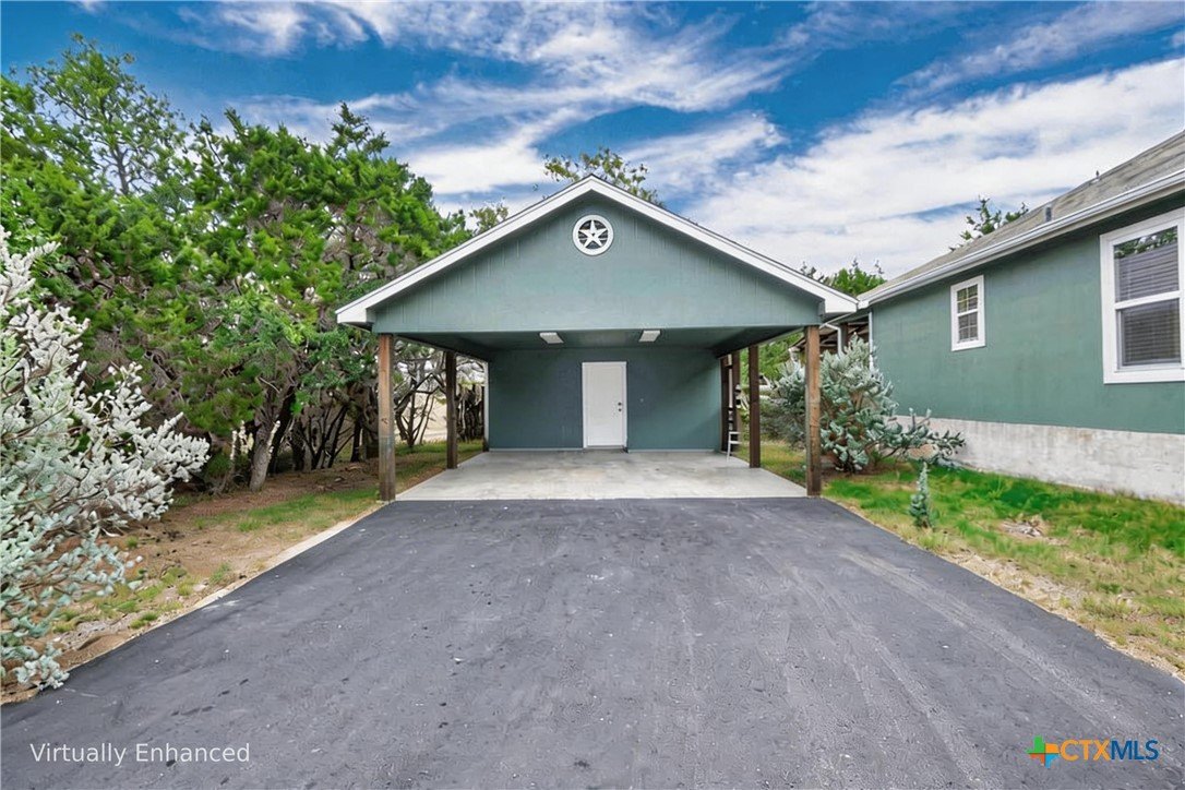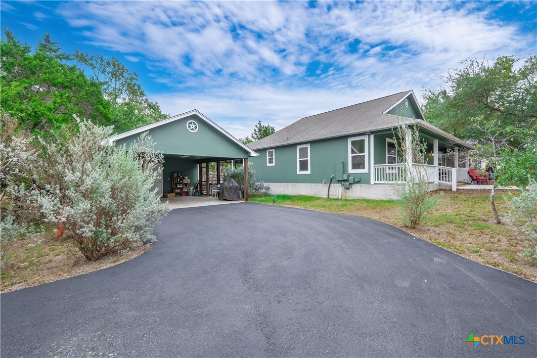 This thoughtfully designed 3-bed, 2-bath single-story home offers the perfect blend of functionality, privacy, and entertaining space. The open-concept living room, complete with a cozy fireplace, flows seamlessly into the kitchen and dining area, creating an inviting central hub ideal for daily living and hosting guests. The kitchen features a convenient pantry and a kitchen island, providing excellent storage and prep space. A generous primary suite is tucked away on one side of the home for added privacy and includes an ensuite bathroom with a dual vanity, walk-in shower, and a walk-in closet. Two additional bedrooms and a secondary bath are positioned on the opposite side of the home, offering a smart split-bedroom layout perfect for families, guests, or a home office setup. Leading out the back door from the dining room is a covered deck, with stairs that connect to a screened door opening into the 2-car carport and attached shop. The shop includes two windows and access to a storage attic above, providing excellent space for tools, projects, and additional storage. The water heater is located outside, behind the washer and dryer closet. A circular paved driveway wraps around the property and leads directly under the carport for added convenience. The neighborhood is located across from Canyon Lake High School and offers a quiet setting with no HOA, while still being close to shopping and everyday essentials.
