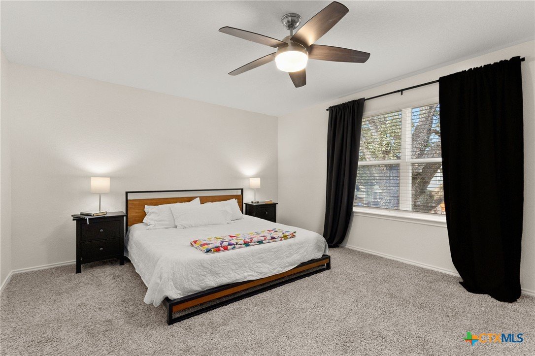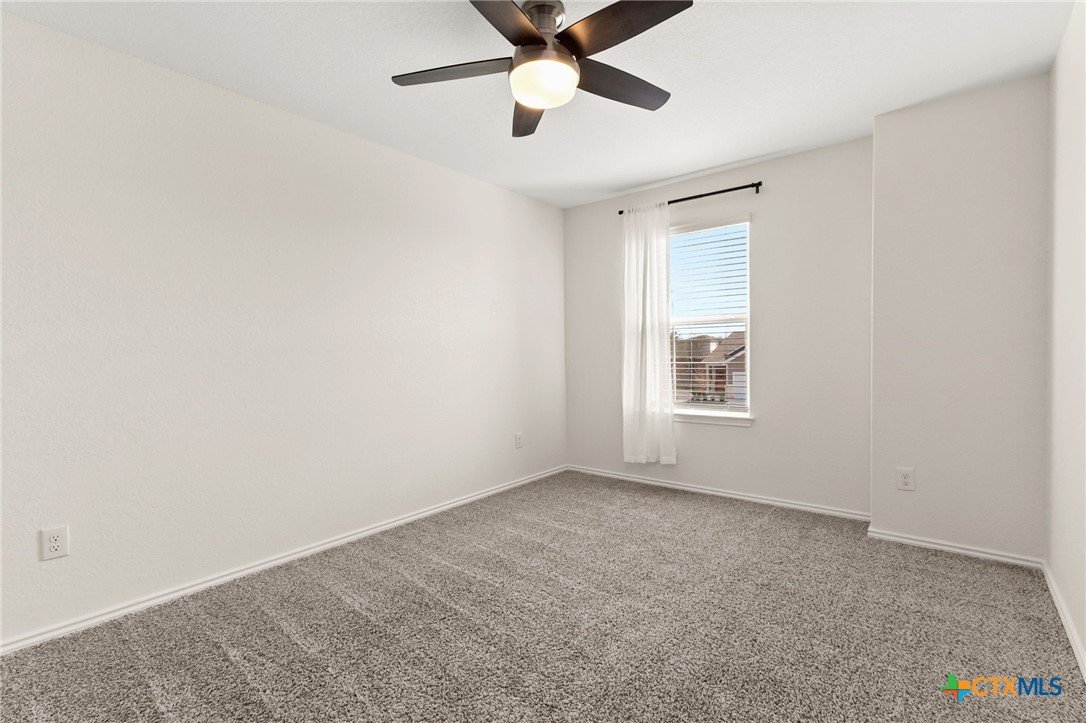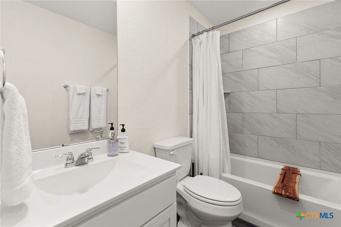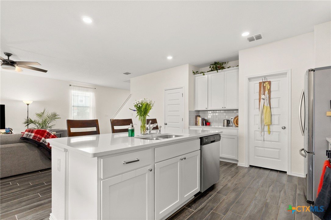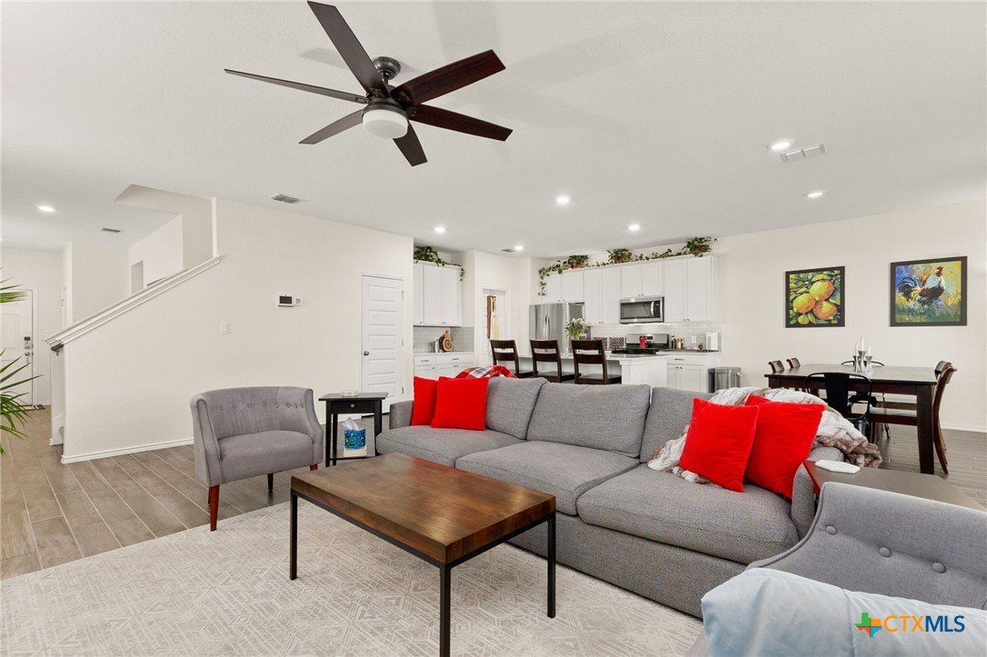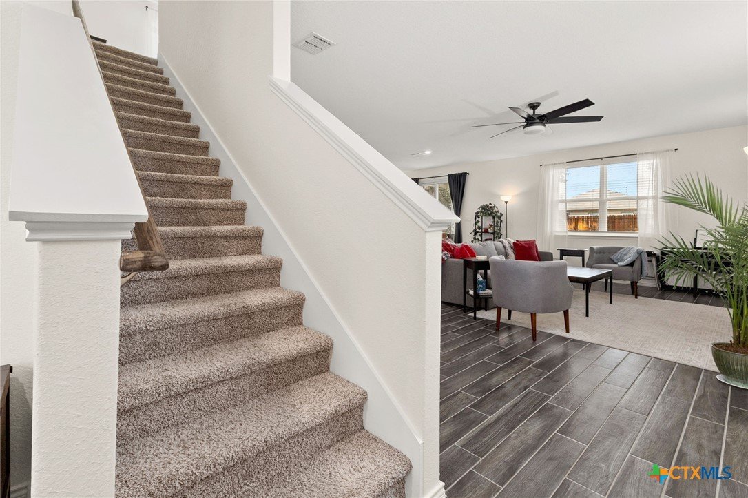 Move-in ready and thoughtfully designed, this home offers a flexible layout ideal for today’s lifestyle. The open-concept main living area flows seamlessly into the kitchen and breakfast nook, featuring a center island, large pantry, granite countertops, white cabinetry, subway tile backsplash, and upgraded stainless-steel appliances. A first-floor bedroom with a full bath nearby provides excellent space for guests or a home office. Upstairs, a spacious loft separates the secondary bedrooms from the private primary suite, which includes dual sinks, a walk-in shower, and a generous walk-in closet. Enjoy outdoor living with a covered patio and a large backyard shaded by a mature oak tree—perfect for relaxing or entertaining. Additional features include a 6’ sliding glass door and water softner.