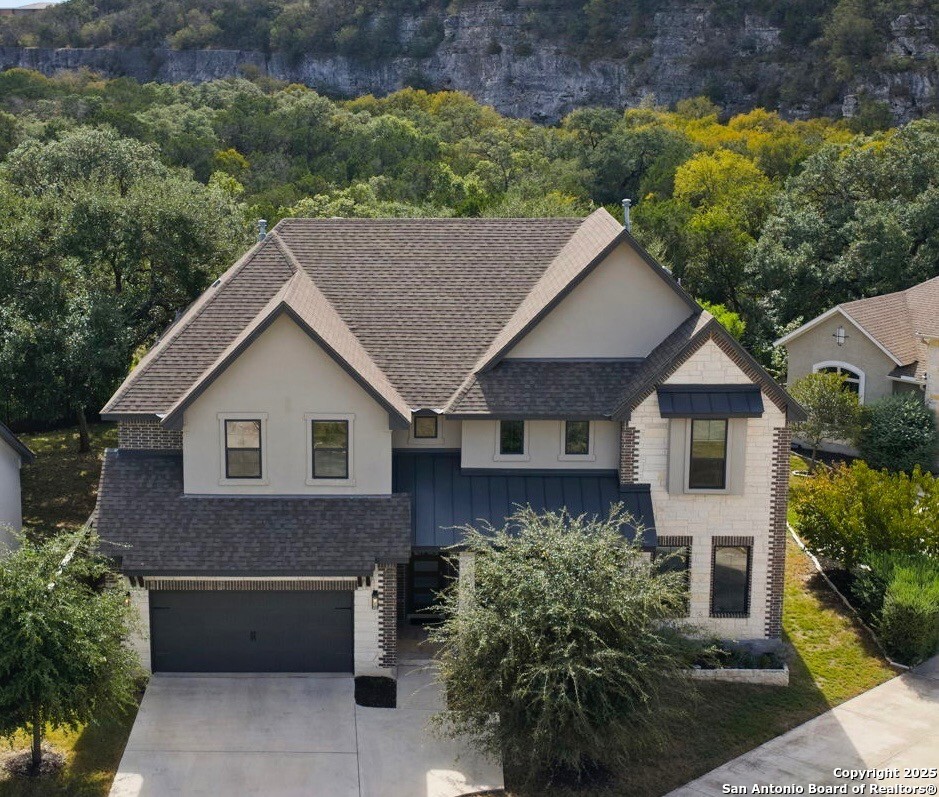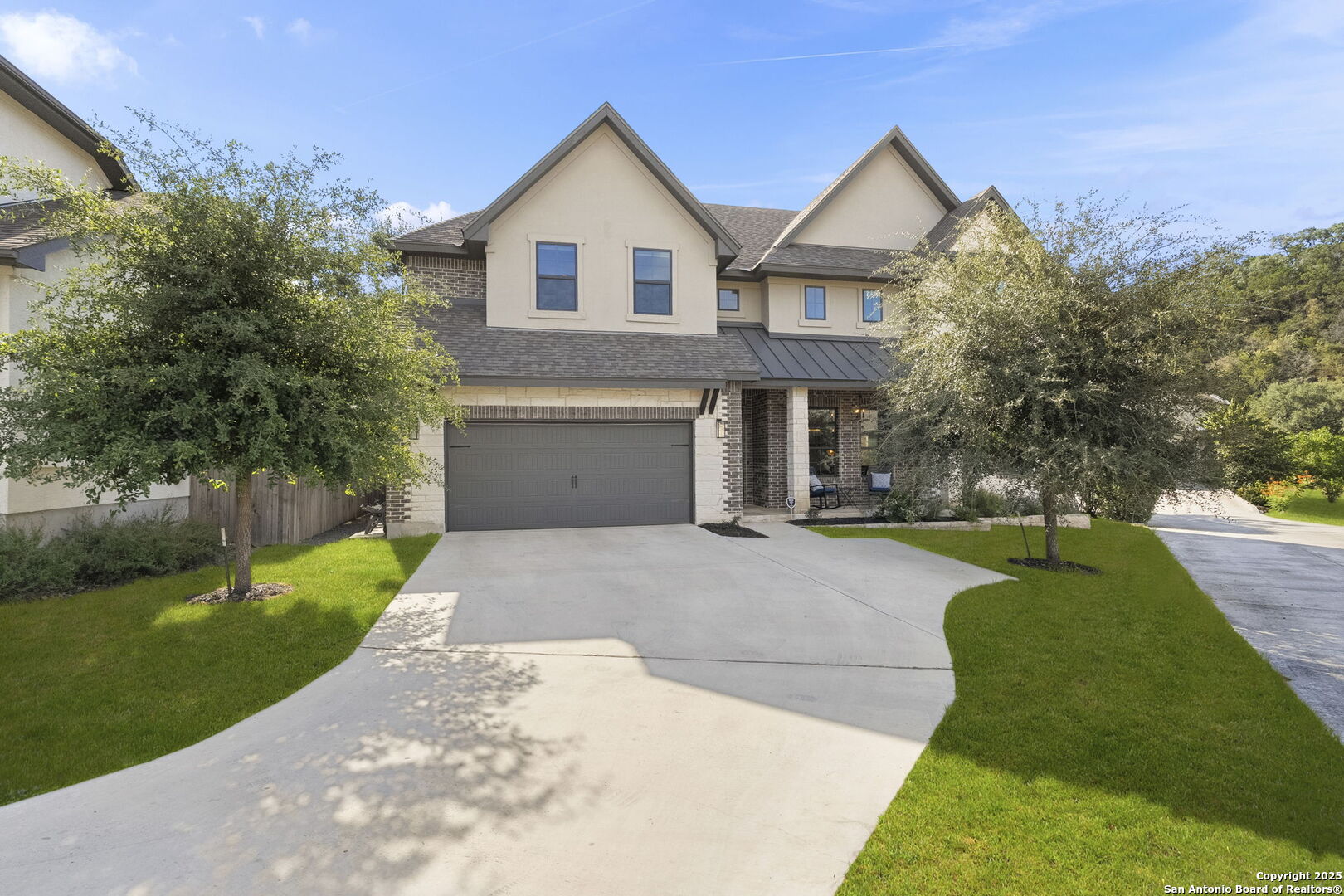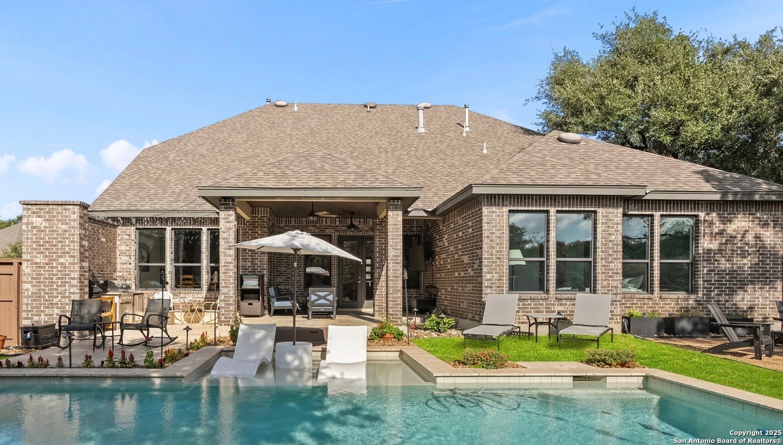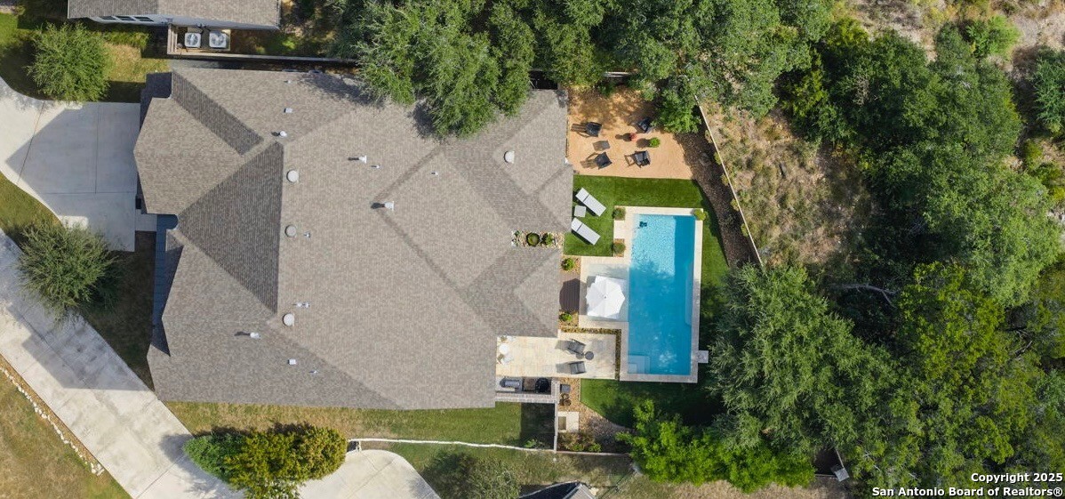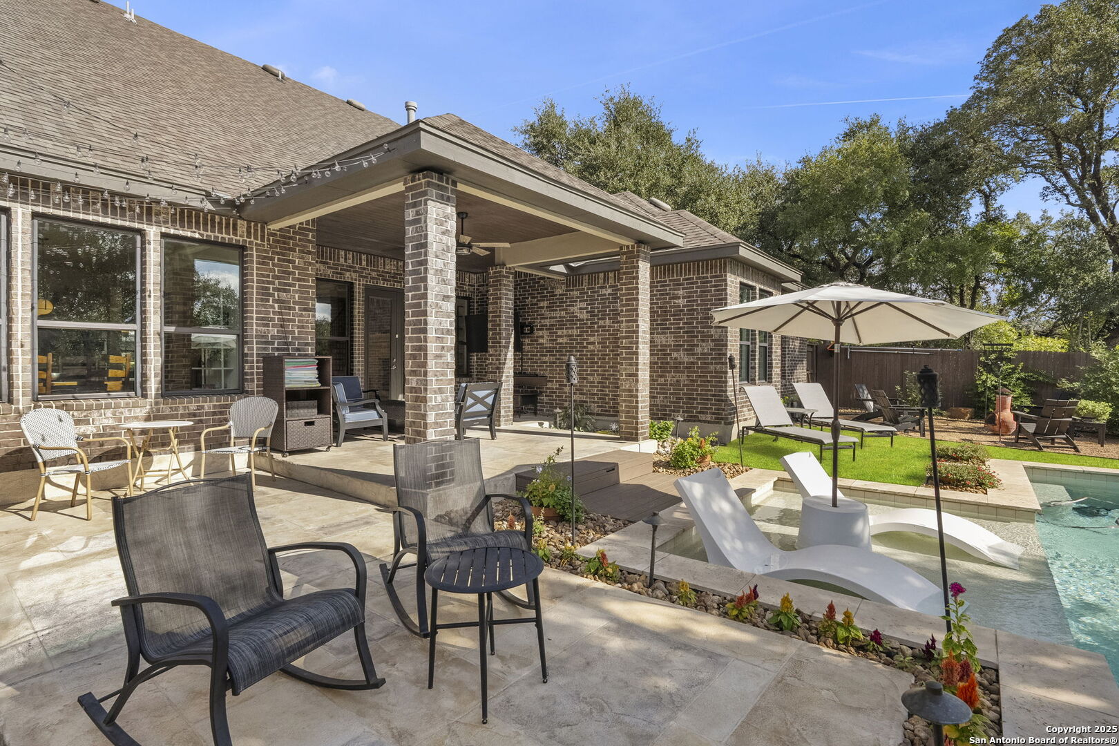 Luxury and location await in this stunning model style home in the prestigious Shavano Highlands community. Greenbelt privacy create your private backyard paradise-complete with a covered patio, outdoor kitchen, a resort-style pool with sundeck and no backyard neighbors. Meticulous landscaping, mature oak trees along with designer lighting and finishes throughout, make this property a real showstopper. Step through the foyer onto beautiful wood-inspired tile flooring, past the elegant staircase and custom wet bar, and into the main living area featuring soaring ceilings and an impressive stone fireplace. The gourmet kitchen is a chef's dream with stainless steel appliances, gas cooking, and an oversized island perfect for gatherings. The expansive primary suite is privately situated with a spa-like ensuite, dual stone vanities, his-and-hers closets, and direct access to the utility room. A secondary guest bedroom downstairs provides guests main level living or doubles as a private study. Upstairs, enjoy a spacious game/media room, a private study/office nook, plus three additional bedrooms. This immaculate home offers luxury living with proximity to Salado Creek Trail System, shopping, restaurants, and award winning schools.