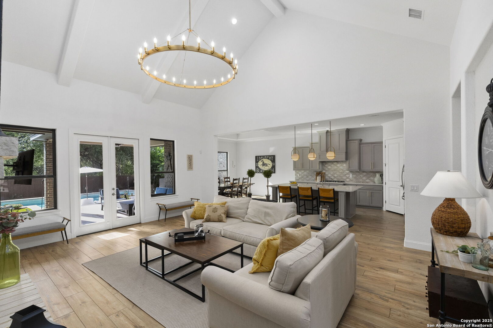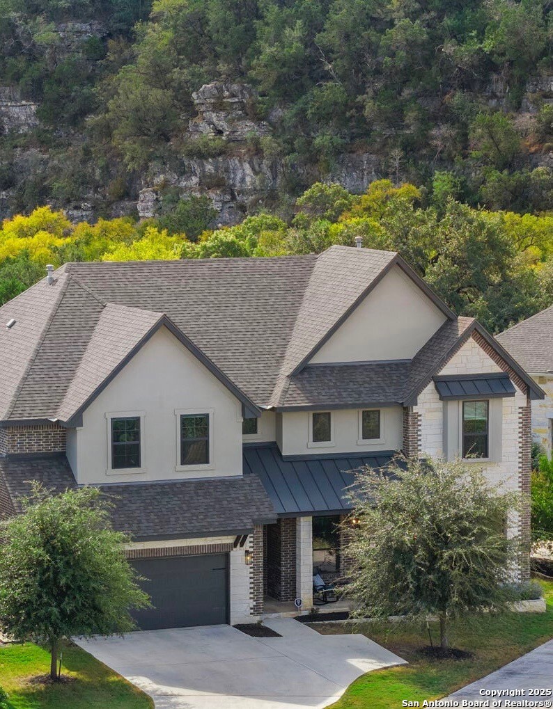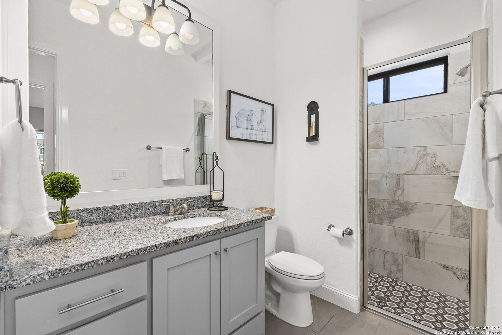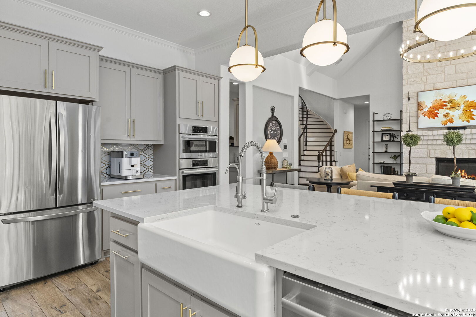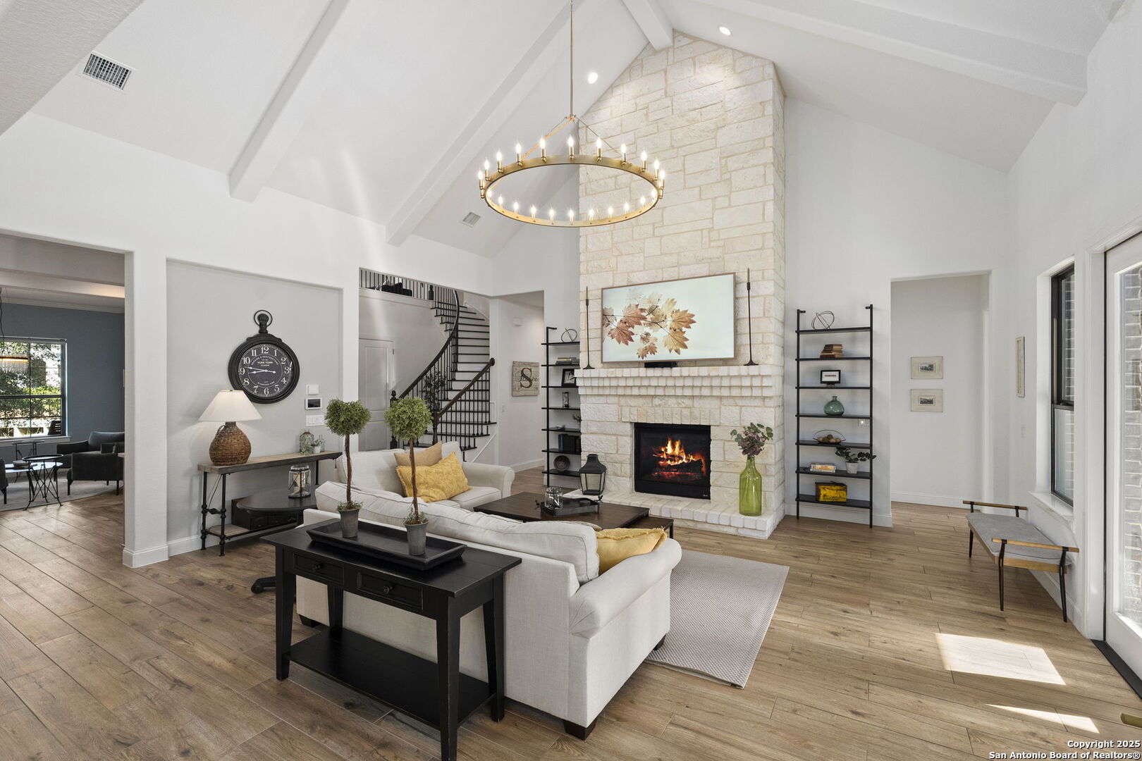 Luxury and location await in this stunning model style home in the prestigious Shavano Highlands community. Greenbelt privacy create your private backyard paradise-complete with a covered patio, outdoor kitchen, a resort-style pool with sundeck and no backyard neighbors. Meticulous landscaping, mature oak trees along with designer lighting and finishes throughout, make this property a real showstopper. Step through the foyer onto beautiful wood-inspired tile flooring, past the elegant staircase and custom wet bar, and into the main living area featuring soaring ceilings and an impressive stone fireplace. The gourmet kitchen is a chef's dream with stainless steel appliances, gas cooking, and an oversized island perfect for gatherings. The expansive primary suite is privately situated with a spa-like ensuite, dual stone vanities, his-and-hers closets, and direct access to the utility room. A secondary guest bedroom downstairs provides guests main level living or doubles as a private study. Upstairs, enjoy a spacious game/media room, a private study/office nook, plus three additional bedrooms. This immaculate home offers luxury living with proximity to Salado Creek Trail System, shopping, restaurants, and award winning schools.