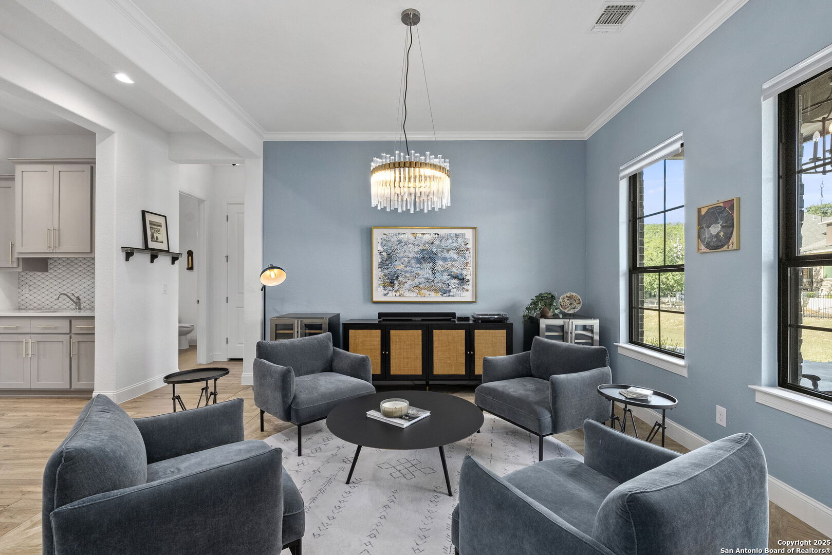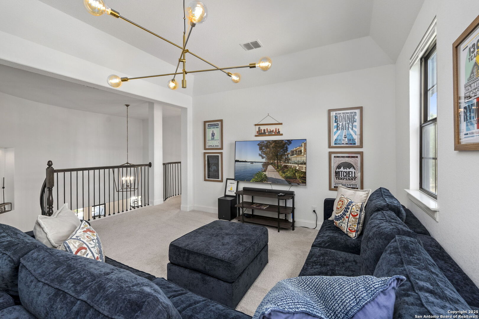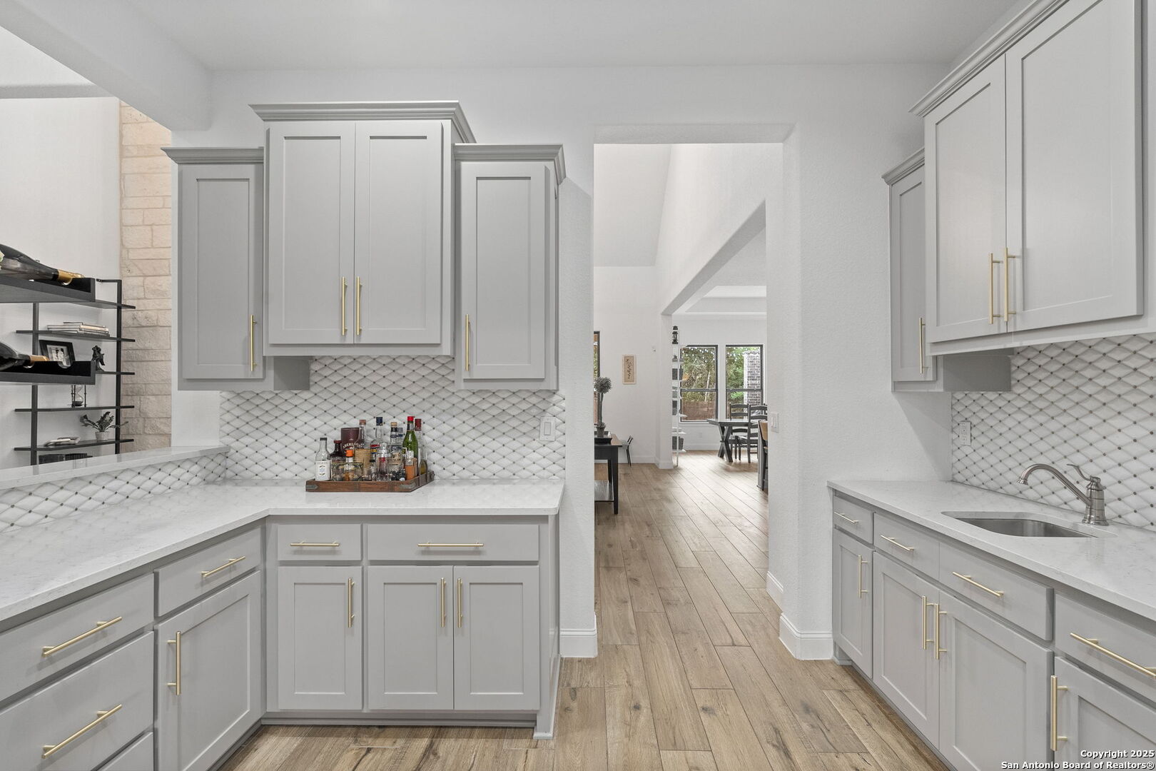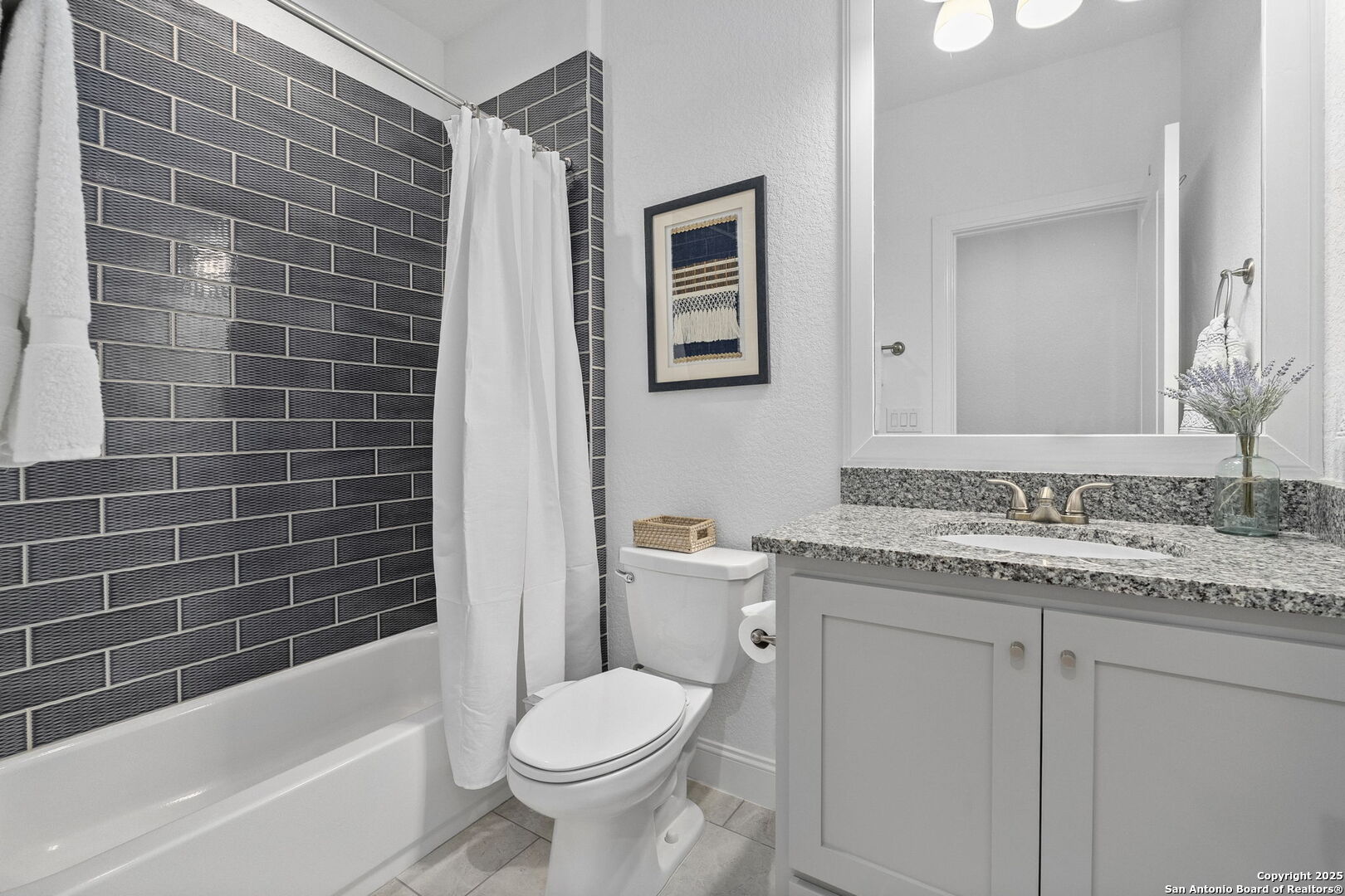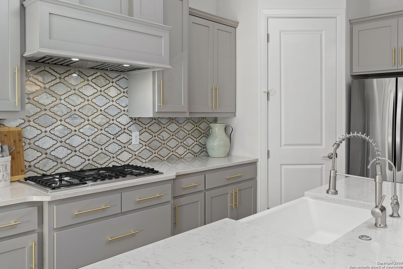 Luxury and location await in this stunning model style home in the prestigious Shavano Highlands community. Greenbelt privacy create your private backyard paradise-complete with a covered patio, outdoor kitchen, a resort-style pool with sundeck and no backyard neighbors. Meticulous landscaping, mature oak trees along with designer lighting and finishes throughout, make this property a real showstopper. Step through the foyer onto beautiful wood-inspired tile flooring, past the elegant staircase and custom wet bar, and into the main living area featuring soaring ceilings and an impressive stone fireplace. The gourmet kitchen is a chef's dream with stainless steel appliances, gas cooking, and an oversized island perfect for gatherings. The expansive primary suite is privately situated with a spa-like ensuite, dual stone vanities, his-and-hers closets, and direct access to the utility room. A secondary guest bedroom downstairs provides guests main level living or doubles as a private study. Upstairs, enjoy a spacious game/media room, a private study/office nook, plus three additional bedrooms. This immaculate home offers luxury living with proximity to Salado Creek Trail System, shopping, restaurants, and award winning schools.