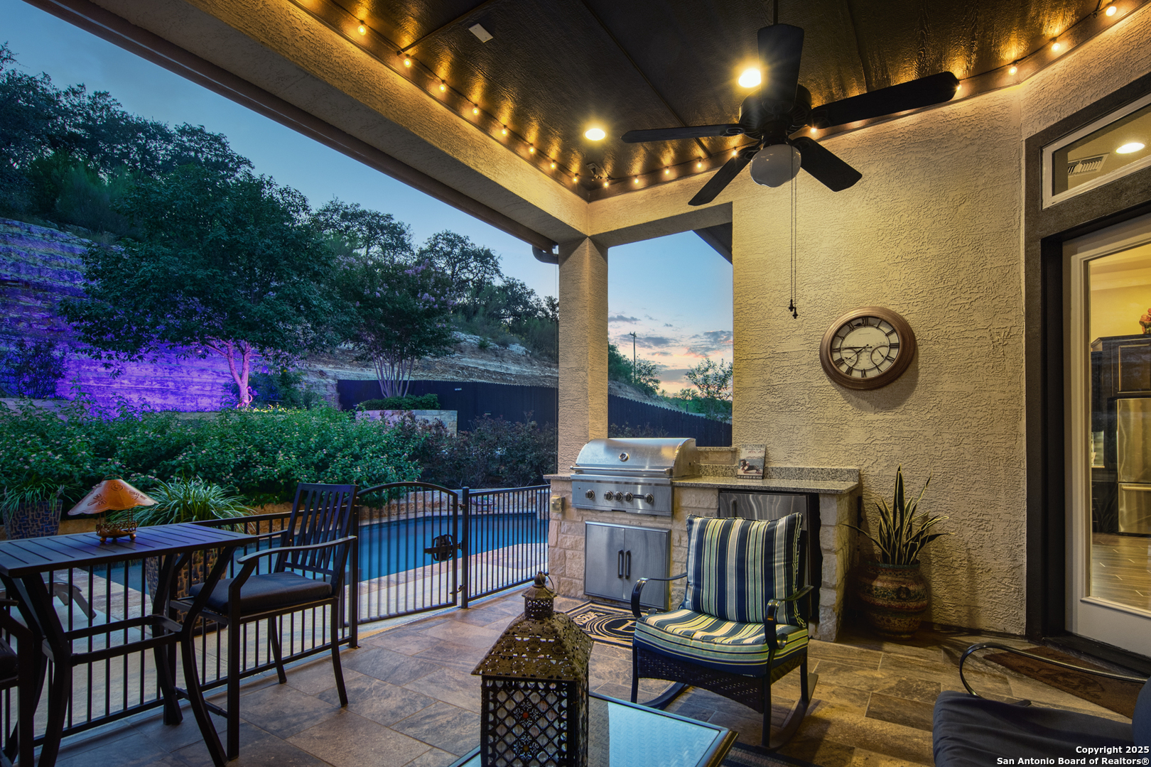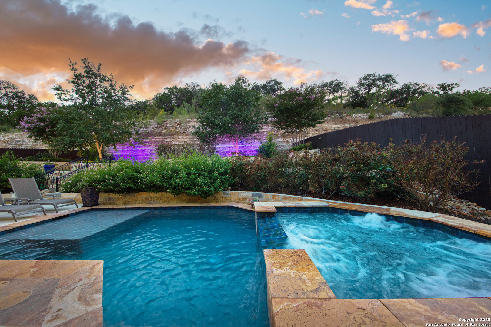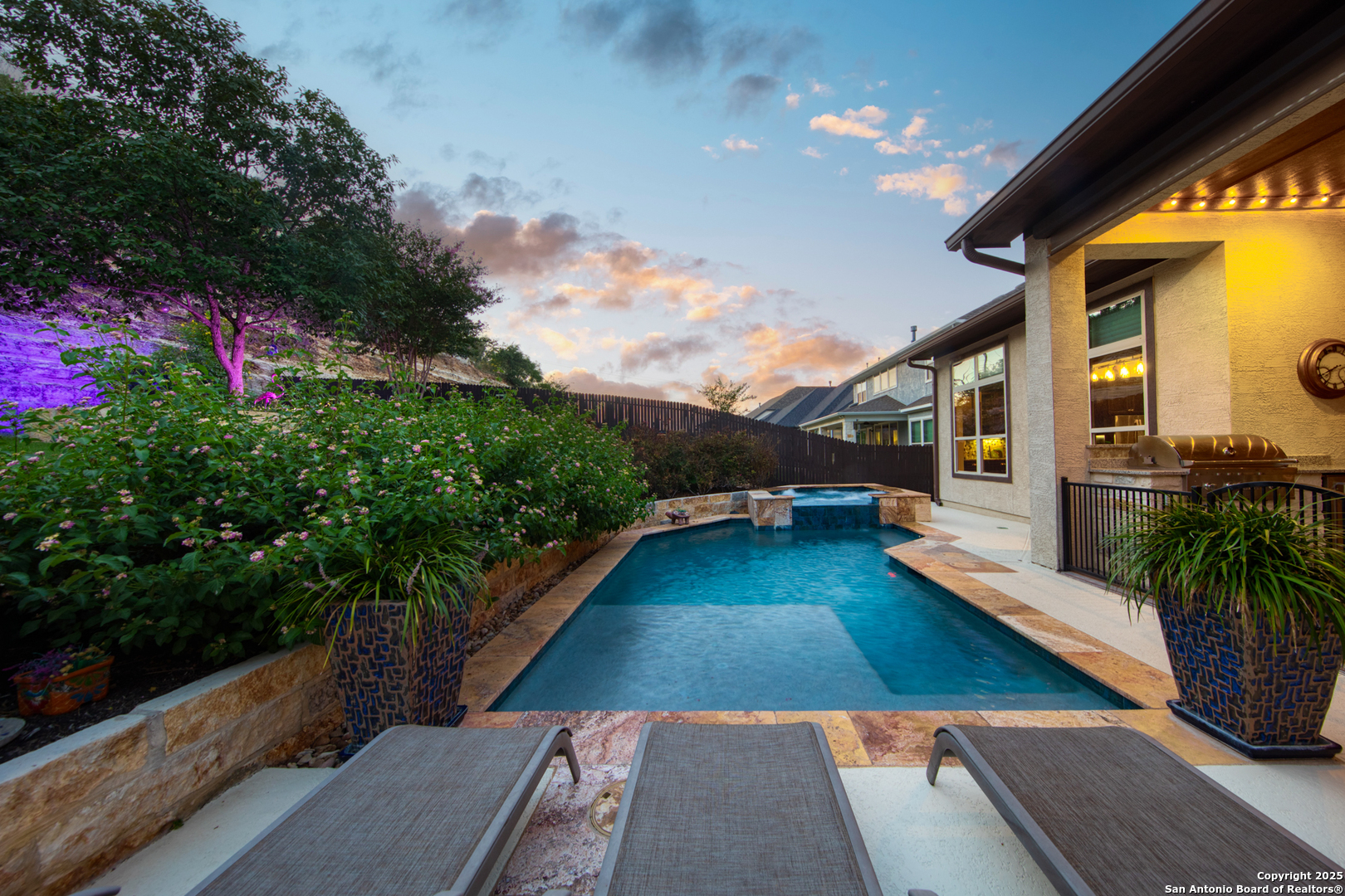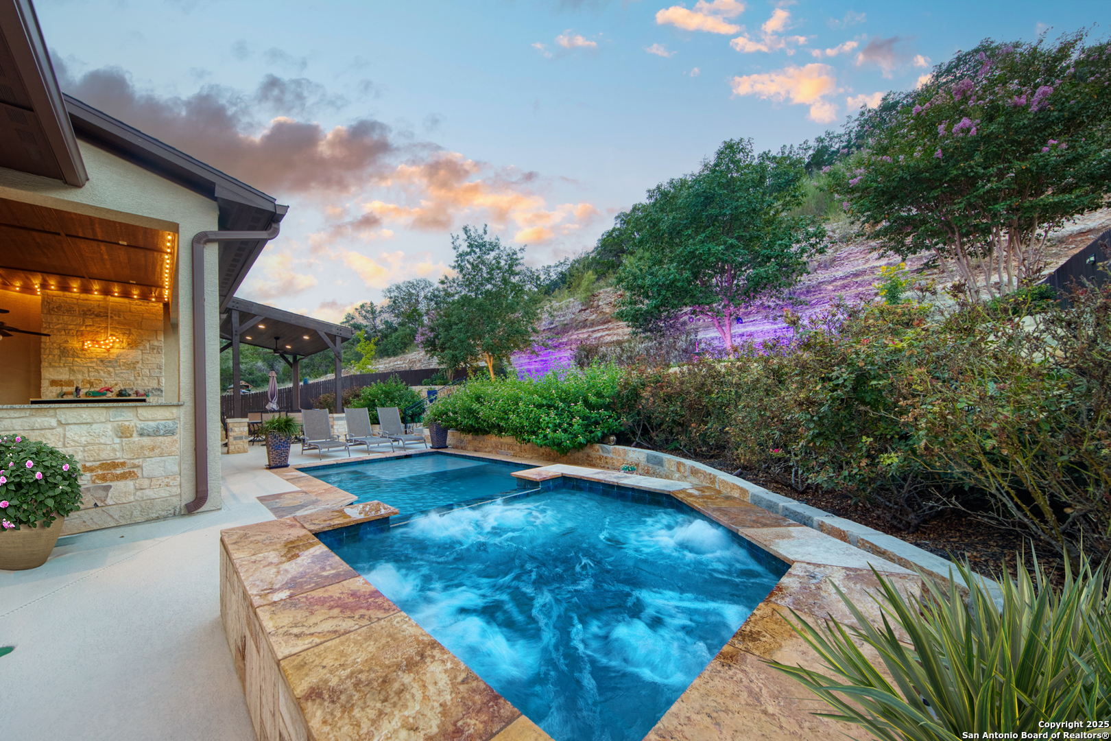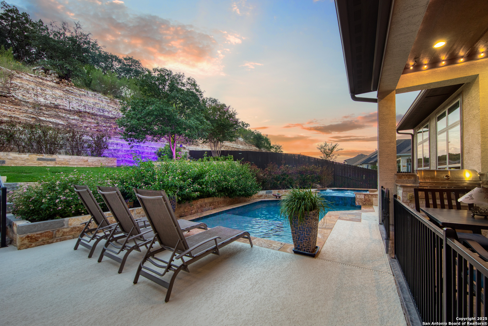 Luxury living awaits on this beautiful hillside lot with consummate back yard privacy. This David Weekly custom home ushers you into a grand open floor plan allowing the best of times for family and friends to gather. Enjoy visiting with your guests at the generous granite island with comfortable seating for 6 with the option to have a seated meal in the adjoining dining area and custom bar. Home chefs will delight in this gourmet kitchen with gas cooking opportunity, double ovens and oversized fridge that is surrounded by exquisite glass tile backsplash. Pool views invite you out to the covered patio to dine al fresco if you prefer and offers a gas grill and beverage center poolside. Immense privacy and lush plantings and landscaping enhance the custom pool and spa features. Inside, the owner's suite and 2 other bedrooms are all downstairs. Upstairs is a large gameroom/living room for the 4th bedroom and bath. This is a one owner custom build with tons of extras and upgrades. Don't miss this home in highly desirable Shavano Highlands.