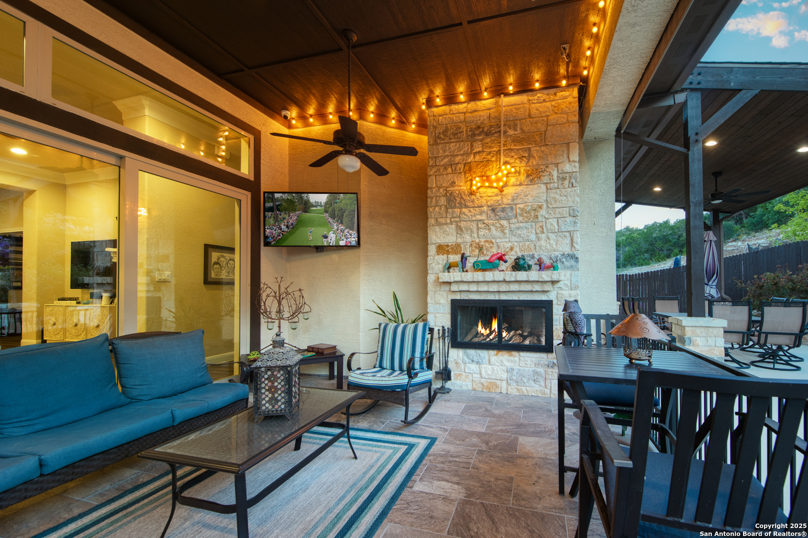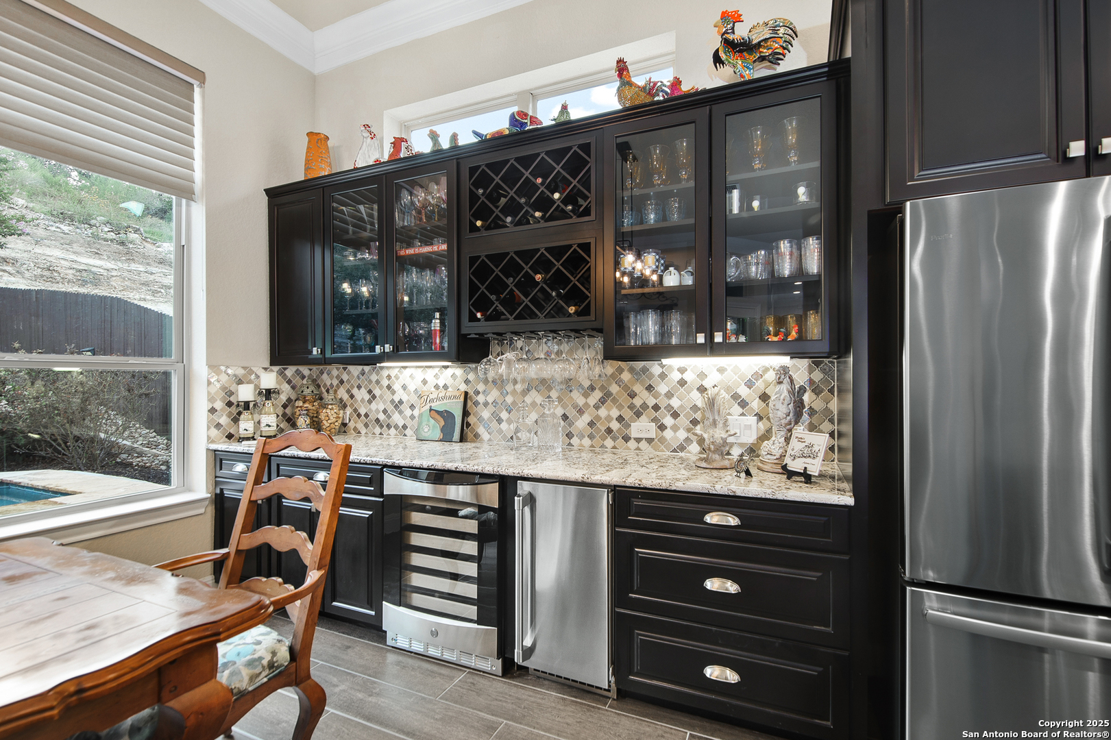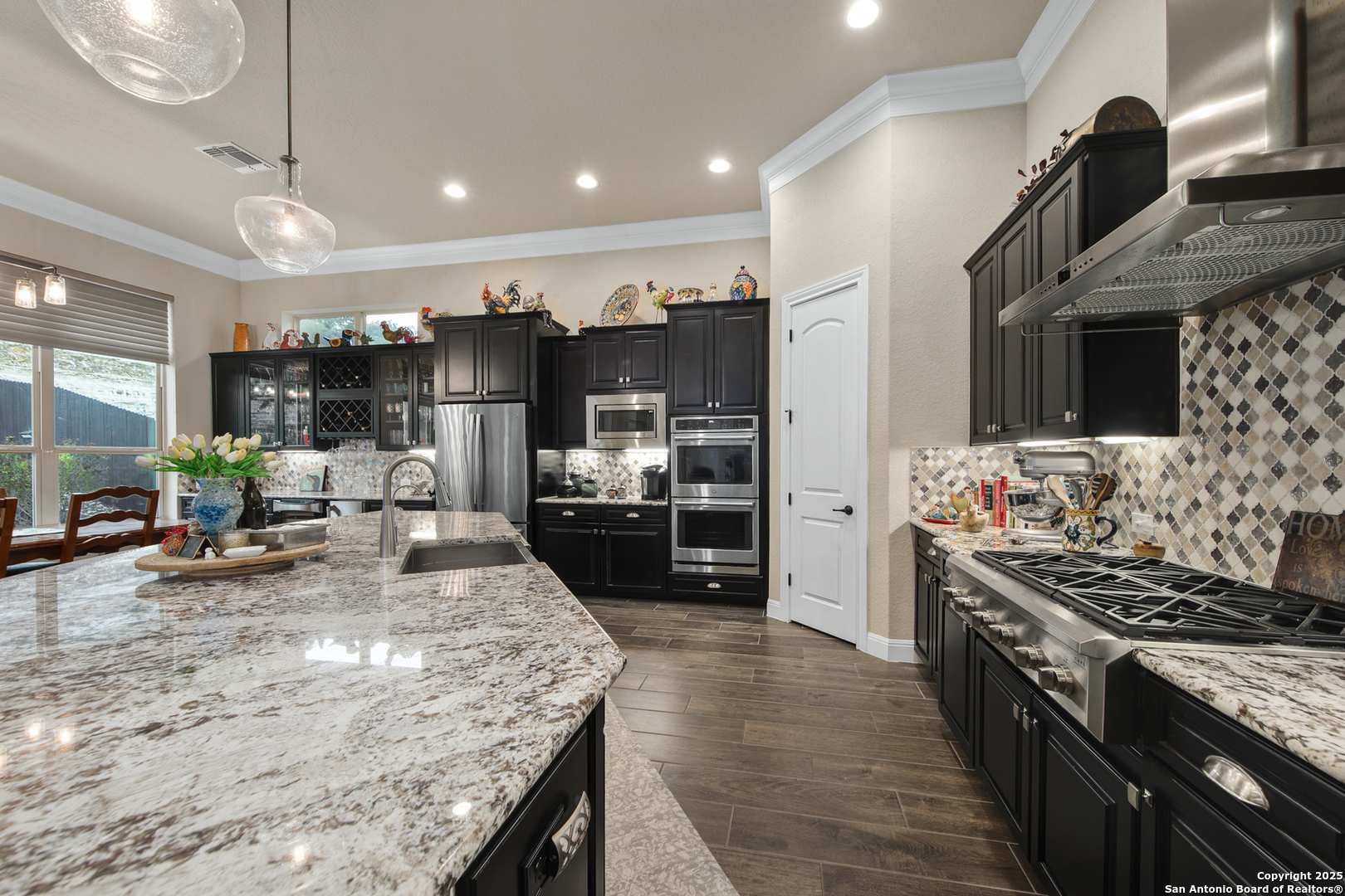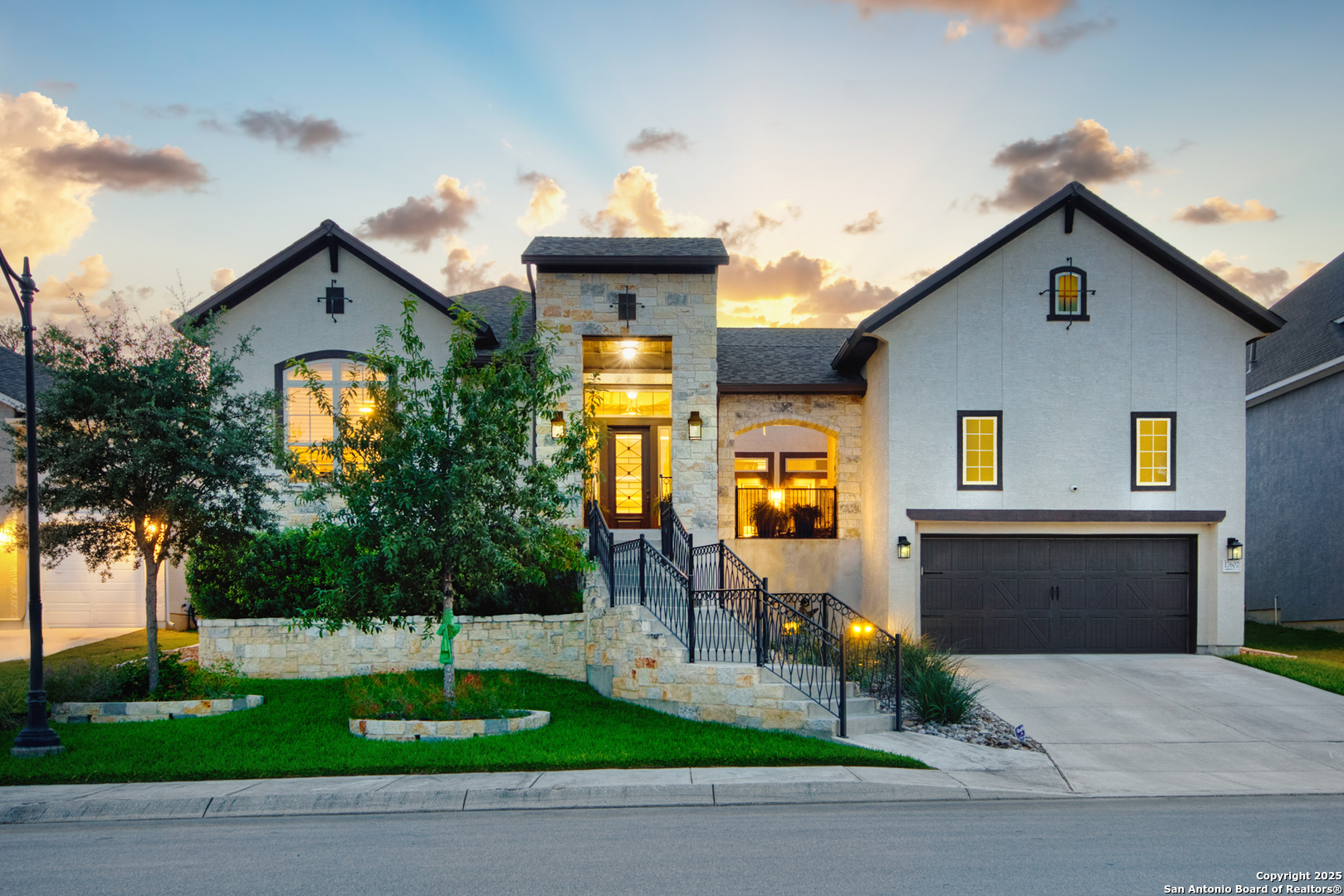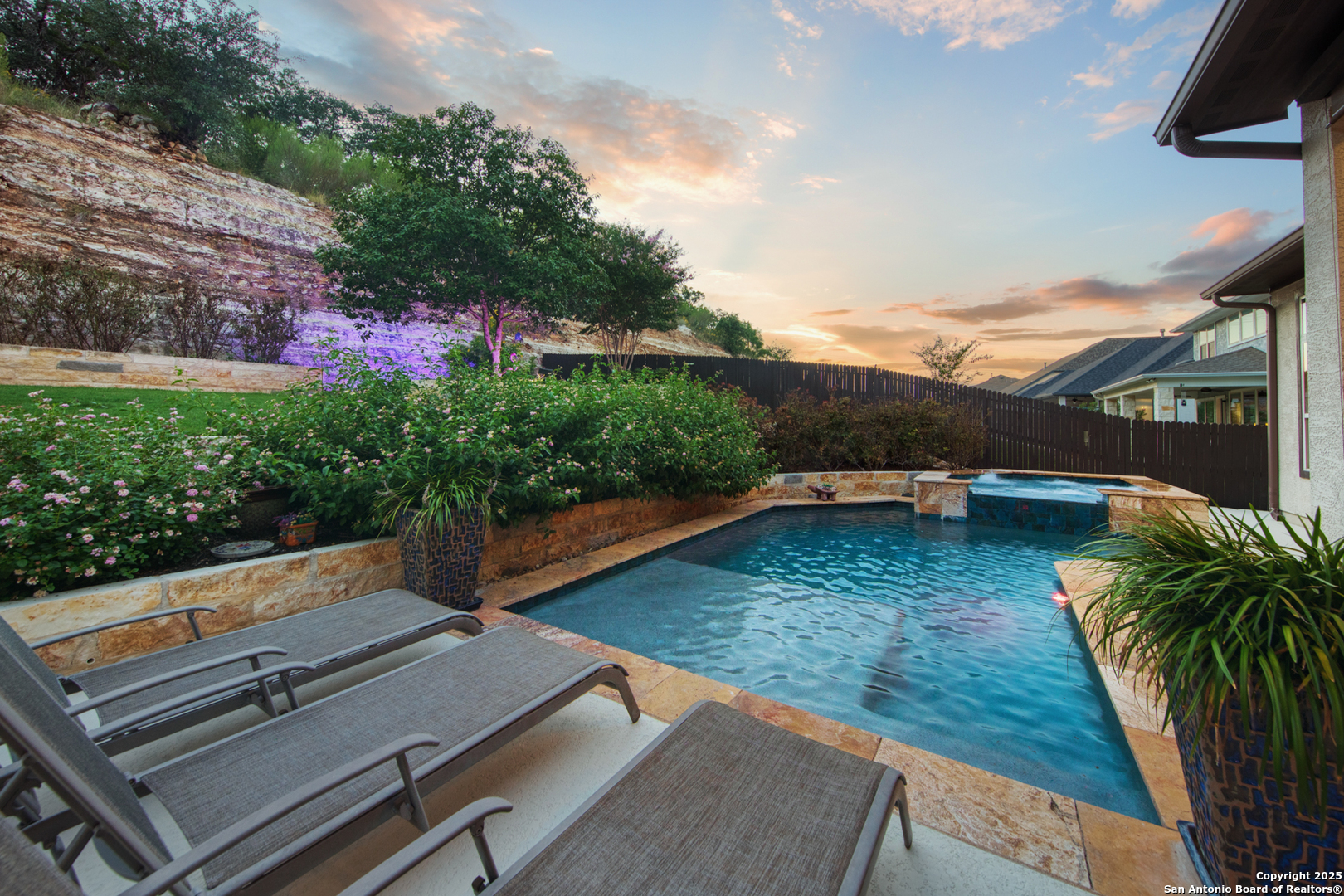 Luxury living awaits on this beautiful hillside lot with consummate back yard privacy. This David Weekly custom home ushers you into a grand open floor plan allowing the best of times for family and friends to gather. Enjoy visiting with your guests at the generous granite island with comfortable seating for 6 with the option to have a seated meal in the adjoining dining area and custom bar. Home chefs will delight in this gourmet kitchen with gas cooking opportunity, double ovens and oversized fridge that is surrounded by exquisite glass tile backsplash. Pool views invite you out to the covered patio to dine al fresco if you prefer and offers a gas grill and beverage center poolside. Immense privacy and lush plantings and landscaping enhance the custom pool and spa features. Inside, the owner's suite and 2 other bedrooms are all downstairs. Upstairs is a large gameroom/living room for the 4th bedroom and bath. This is a one owner custom build with tons of extras and upgrades. Don't miss this home in highly desirable Shavano Highlands.