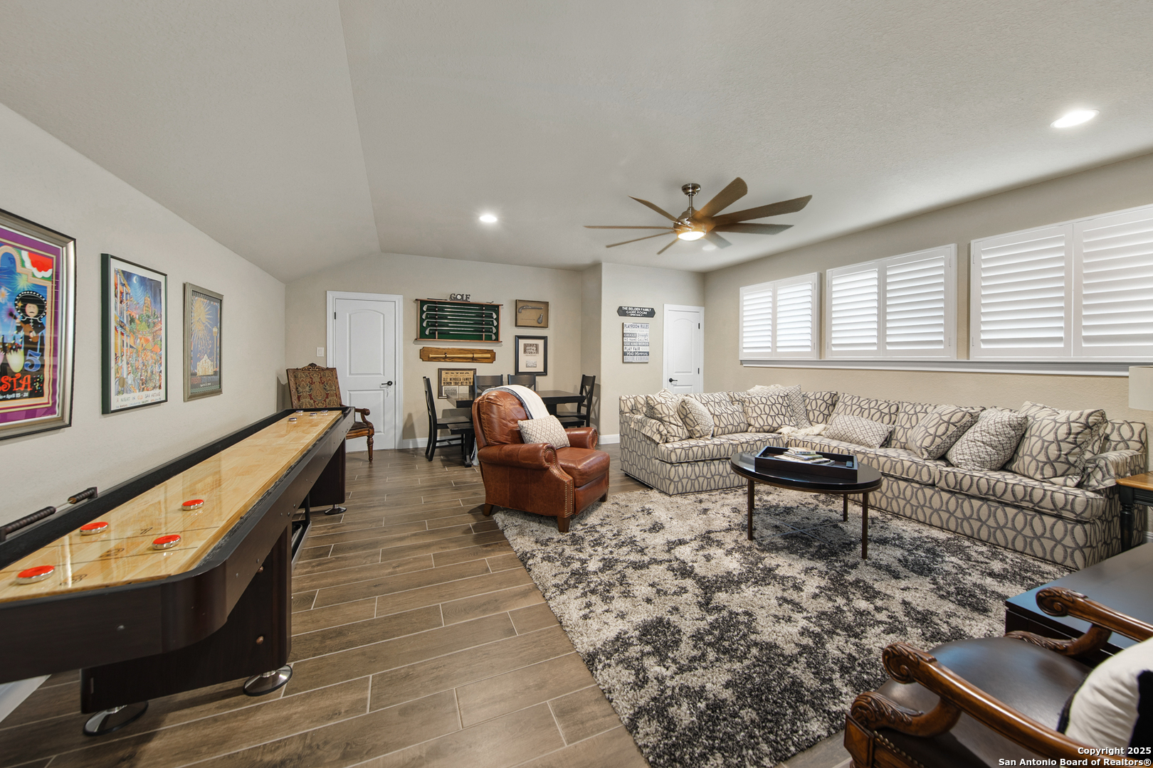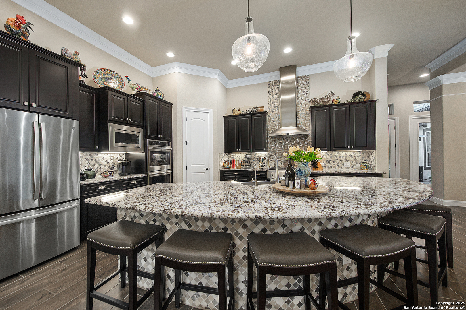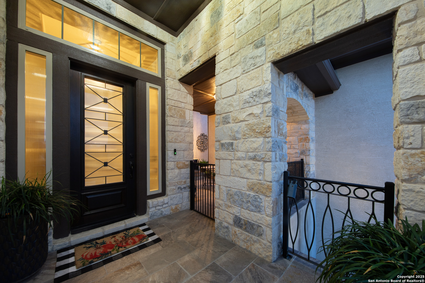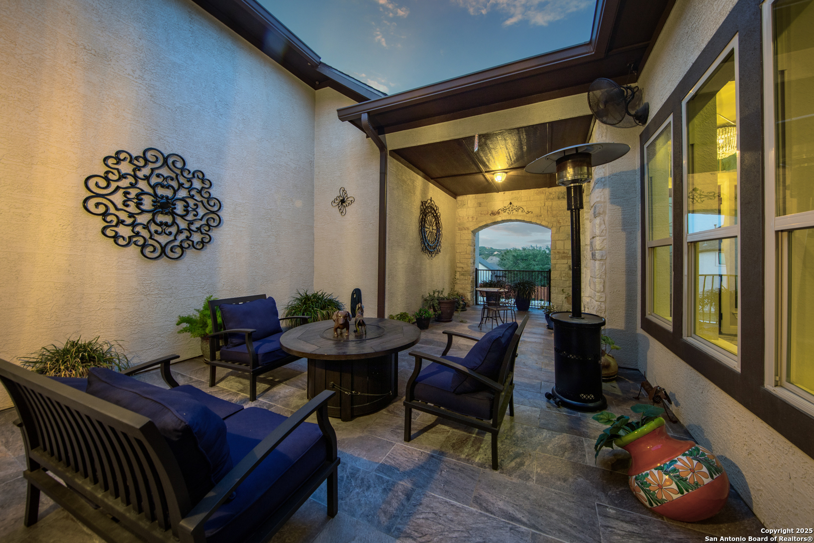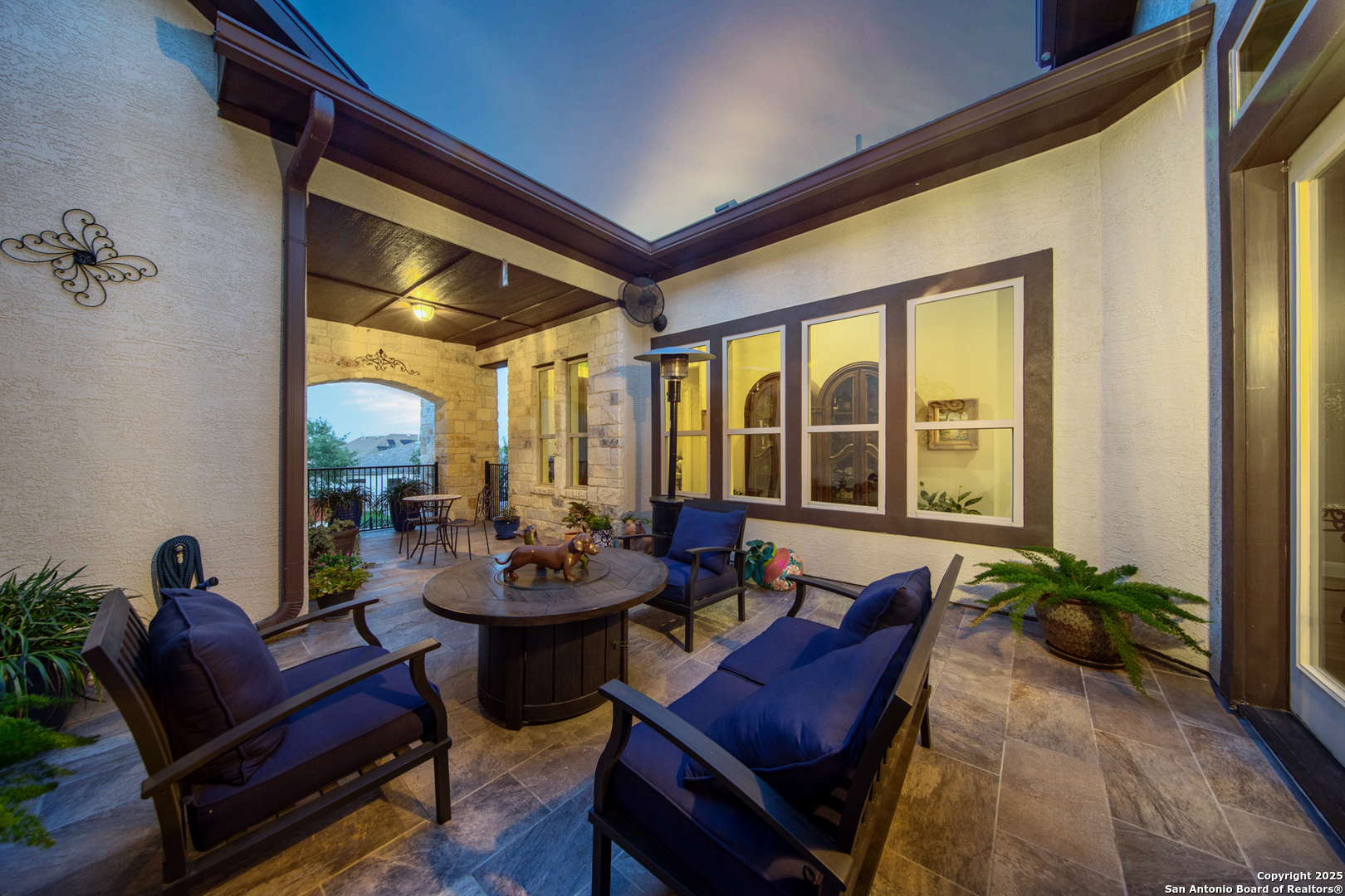 Luxury living awaits on this beautiful hillside lot with consummate back yard privacy. This David Weekly custom home ushers you into a grand open floor plan allowing the best of times for family and friends to gather. Enjoy visiting with your guests at the generous granite island with comfortable seating for 6 with the option to have a seated meal in the adjoining dining area and custom bar. Home chefs will delight in this gourmet kitchen with gas cooking opportunity, double ovens and oversized fridge that is surrounded by exquisite glass tile backsplash. Pool views invite you out to the covered patio to dine al fresco if you prefer and offers a gas grill and beverage center poolside. Immense privacy and lush plantings and landscaping enhance the custom pool and spa features. Inside, the owner's suite and 2 other bedrooms are all downstairs. Upstairs is a large gameroom/living room for the 4th bedroom and bath. This is a one owner custom build with tons of extras and upgrades. Don't miss this home in highly desirable Shavano Highlands.