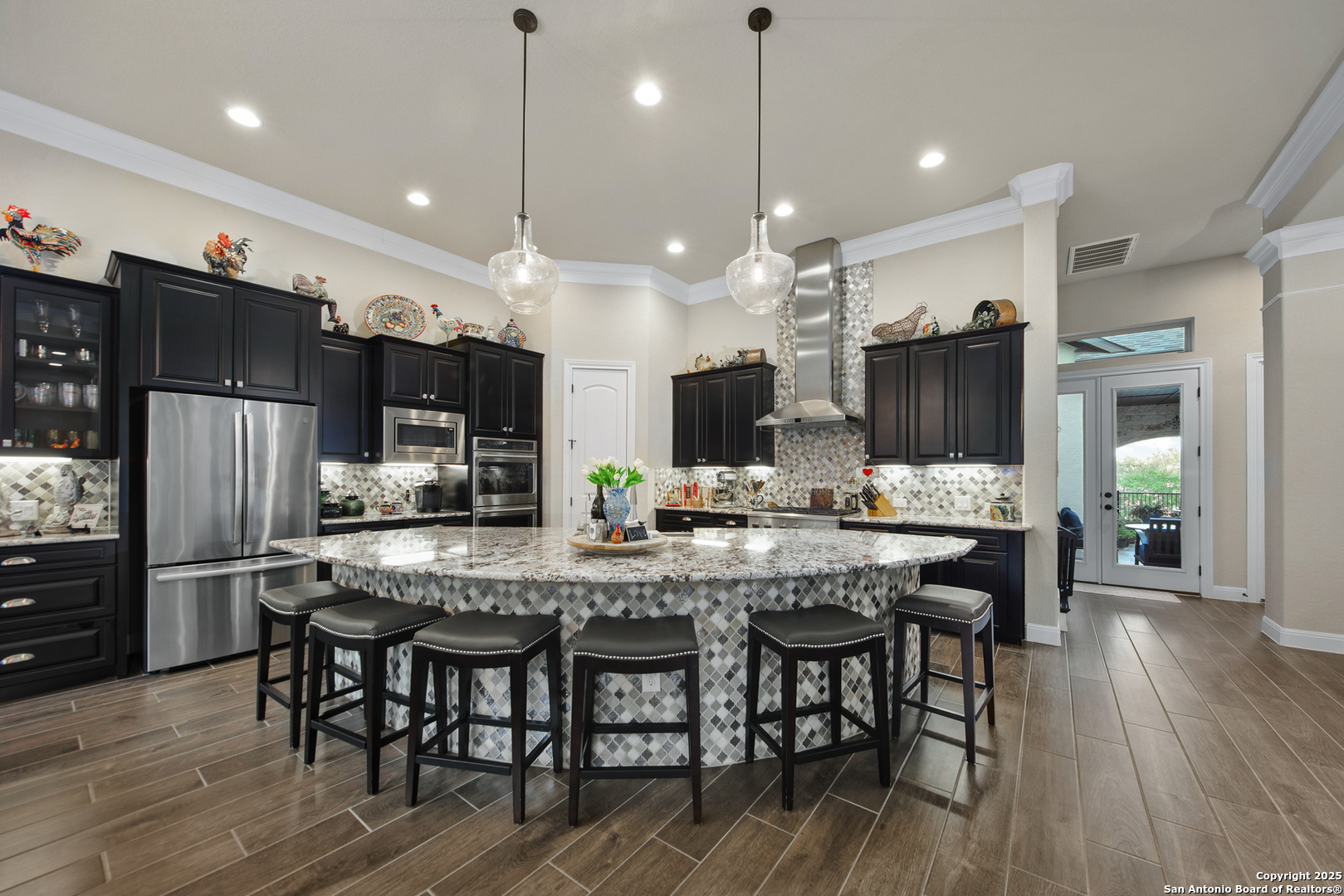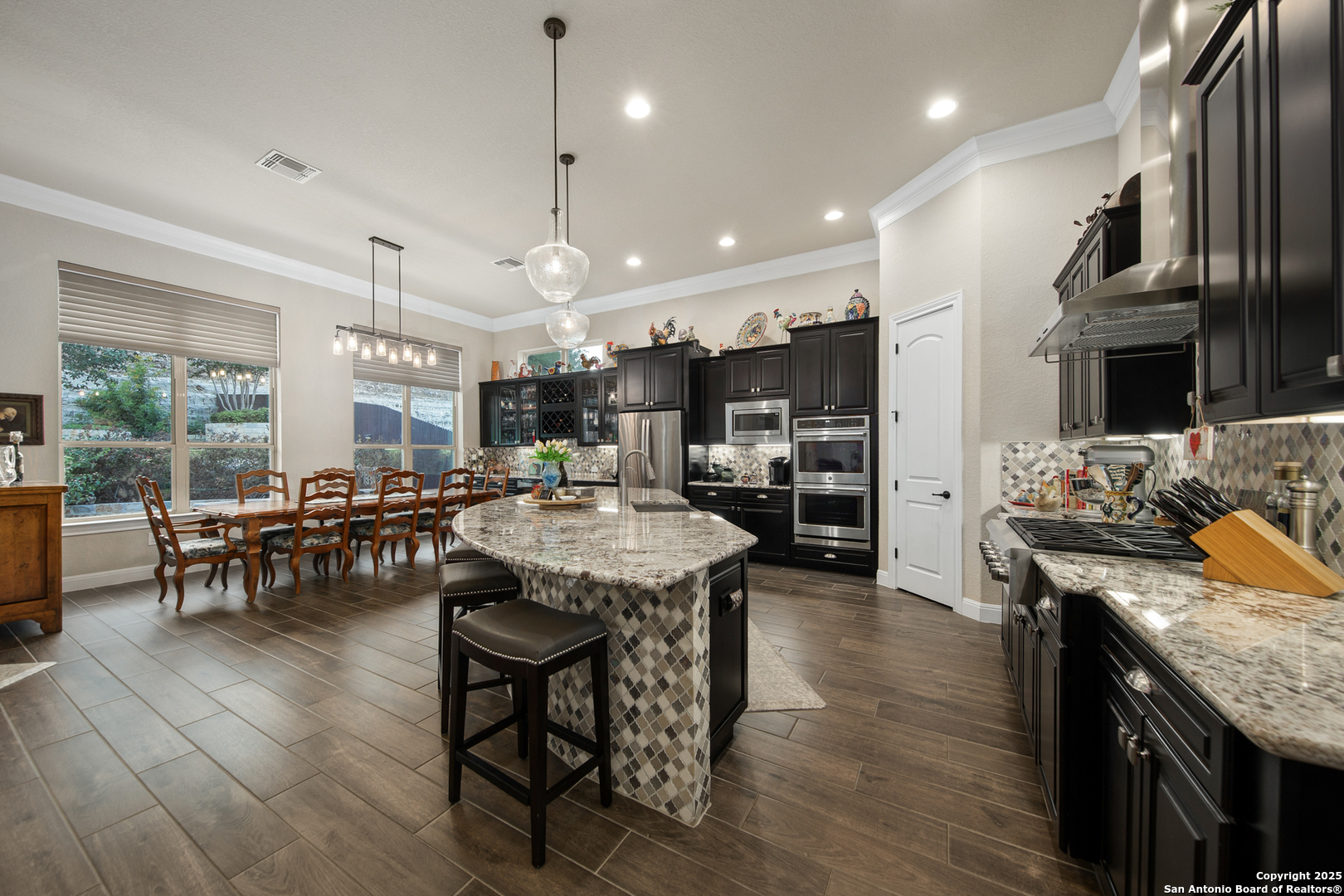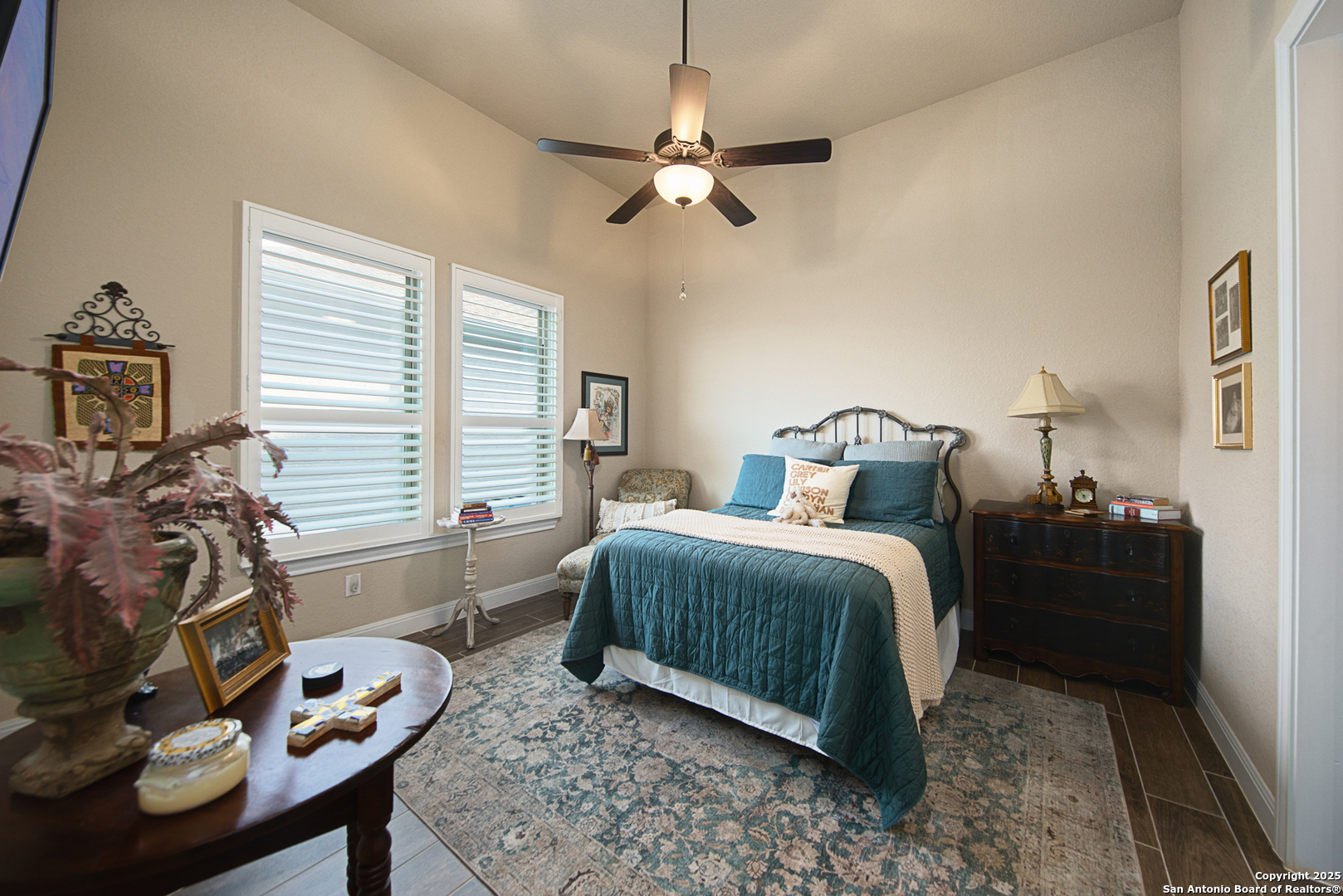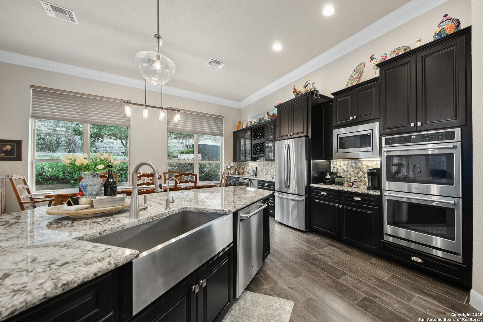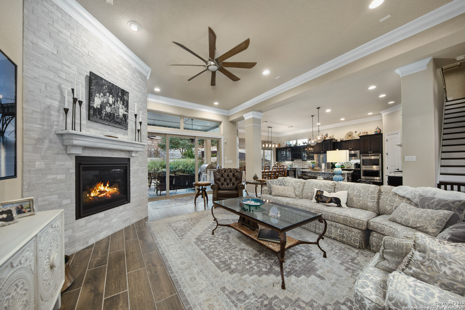 Luxury living awaits on this beautiful hillside lot with consummate back yard privacy. This David Weekly custom home ushers you into a grand open floor plan allowing the best of times for family and friends to gather. Enjoy visiting with your guests at the generous granite island with comfortable seating for 6 with the option to have a seated meal in the adjoining dining area and custom bar. Home chefs will delight in this gourmet kitchen with gas cooking opportunity, double ovens and oversized fridge that is surrounded by exquisite glass tile backsplash. Pool views invite you out to the covered patio to dine al fresco if you prefer and offers a gas grill and beverage center poolside. Immense privacy and lush plantings and landscaping enhance the custom pool and spa features. Inside, the owner's suite and 2 other bedrooms are all downstairs. Upstairs is a large gameroom/living room for the 4th bedroom and bath. This is a one owner custom build with tons of extras and upgrades. Don't miss this home in highly desirable Shavano Highlands.