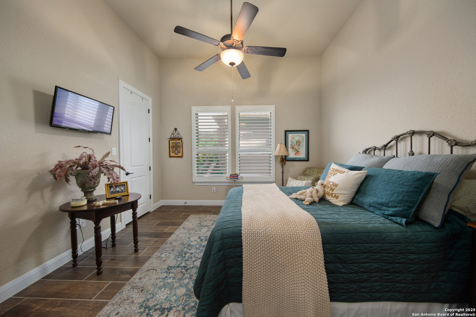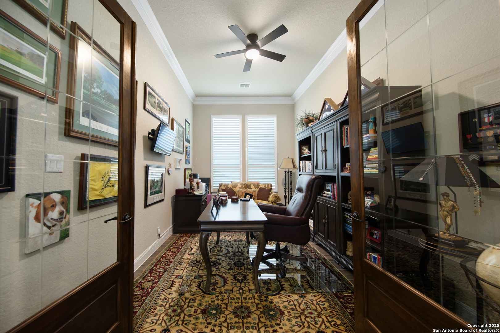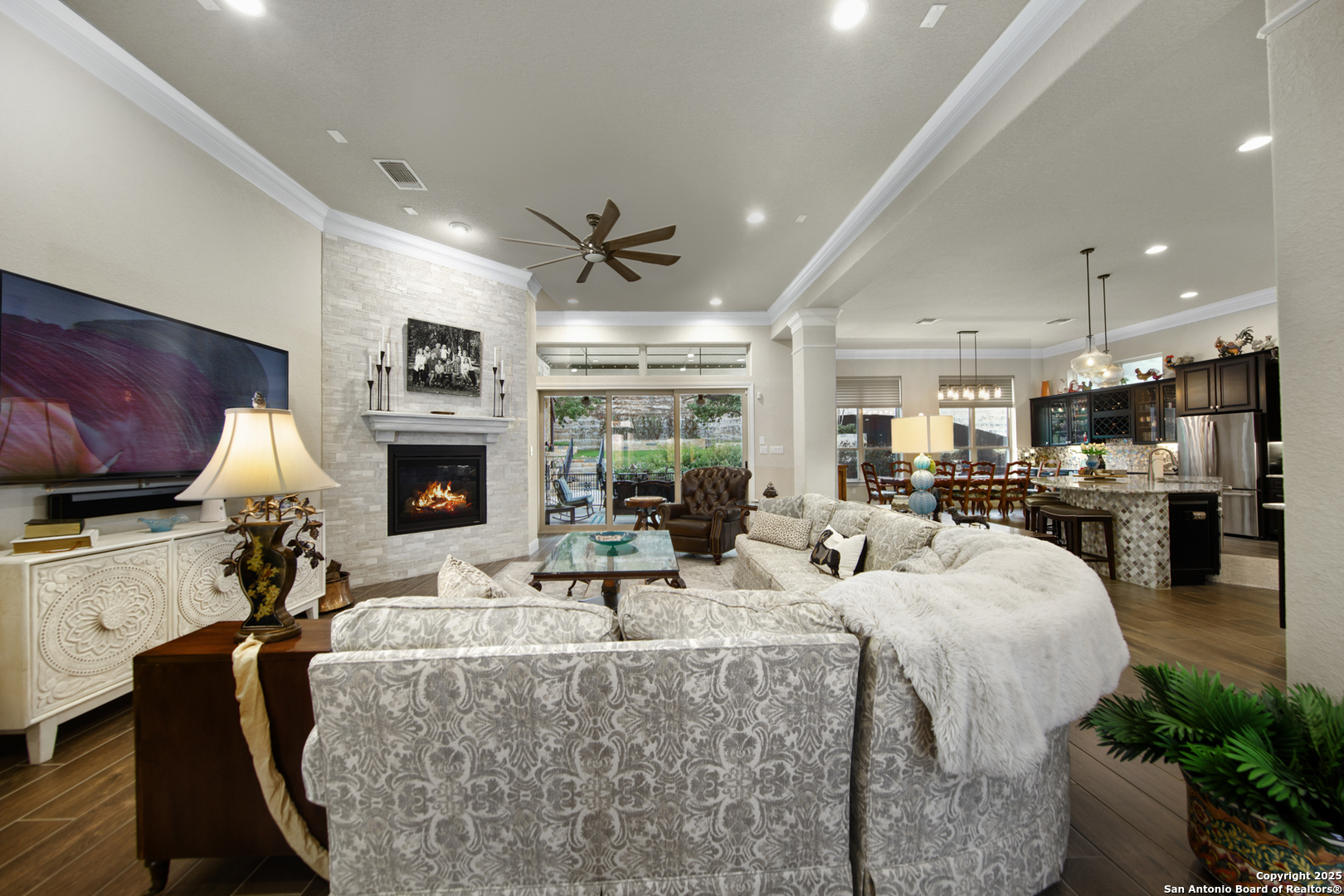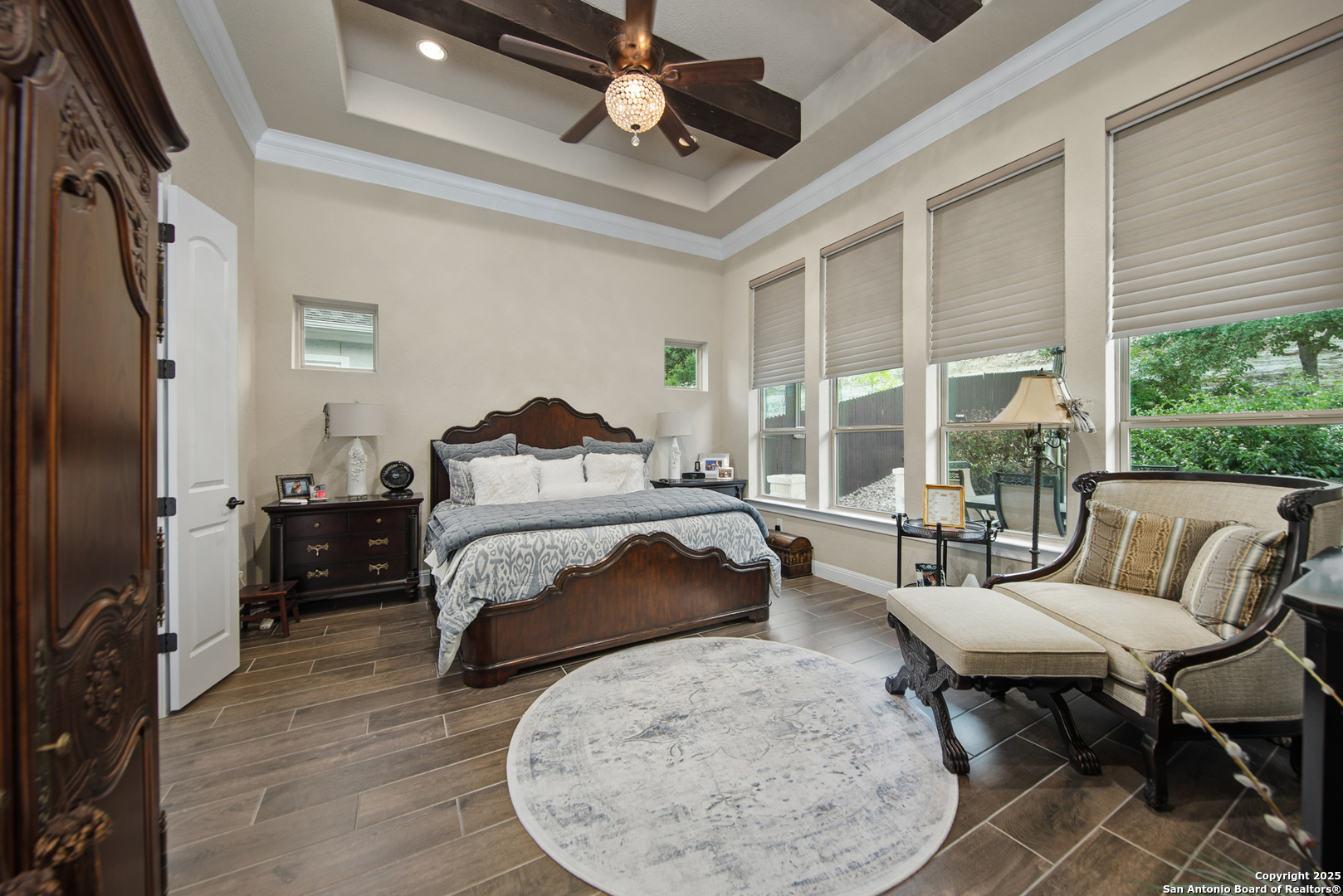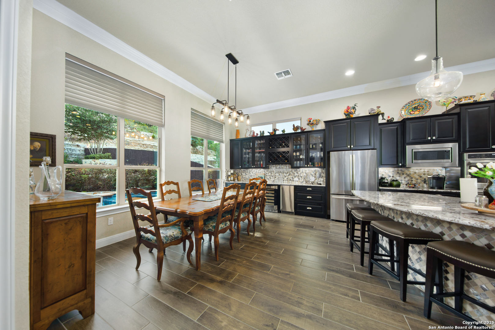 Luxury living awaits on this beautiful hillside lot with consummate back yard privacy. This David Weekly custom home ushers you into a grand open floor plan allowing the best of times for family and friends to gather. Enjoy visiting with your guests at the generous granite island with comfortable seating for 6 with the option to have a seated meal in the adjoining dining area and custom bar. Home chefs will delight in this gourmet kitchen with gas cooking opportunity, double ovens and oversized fridge that is surrounded by exquisite glass tile backsplash. Pool views invite you out to the covered patio to dine al fresco if you prefer and offers a gas grill and beverage center poolside. Immense privacy and lush plantings and landscaping enhance the custom pool and spa features. Inside, the owner's suite and 2 other bedrooms are all downstairs. Upstairs is a large gameroom/living room for the 4th bedroom and bath. This is a one owner custom build with tons of extras and upgrades. Don't miss this home in highly desirable Shavano Highlands.