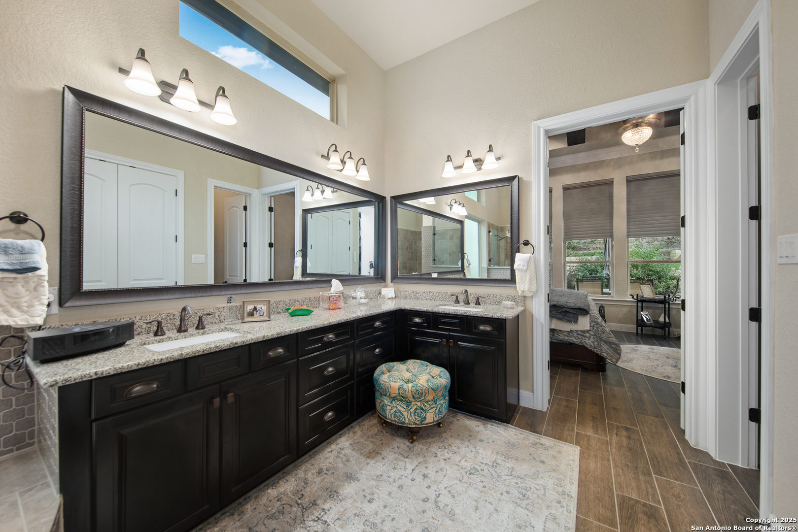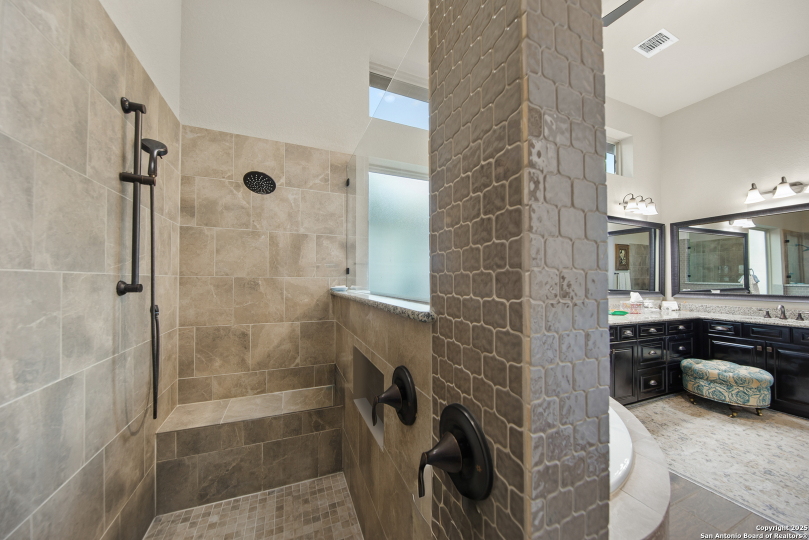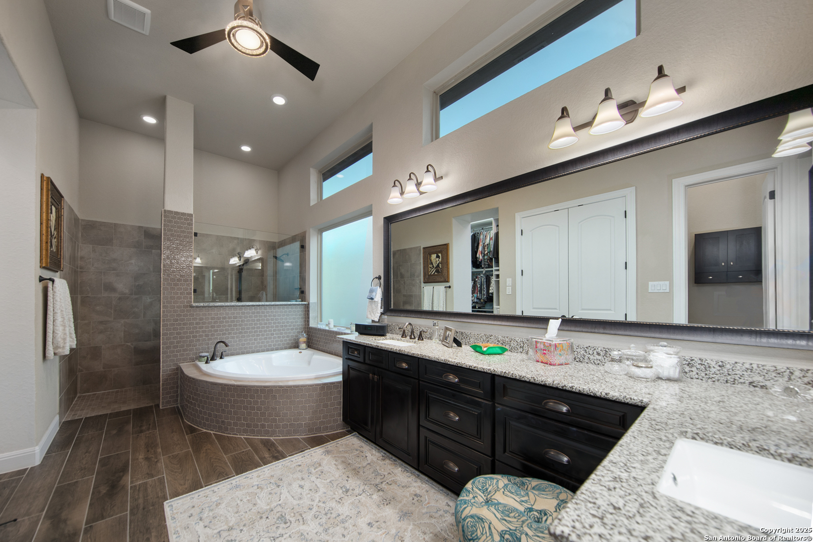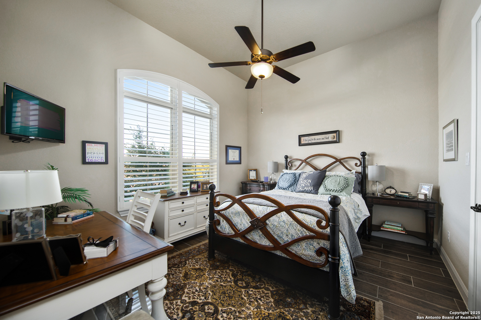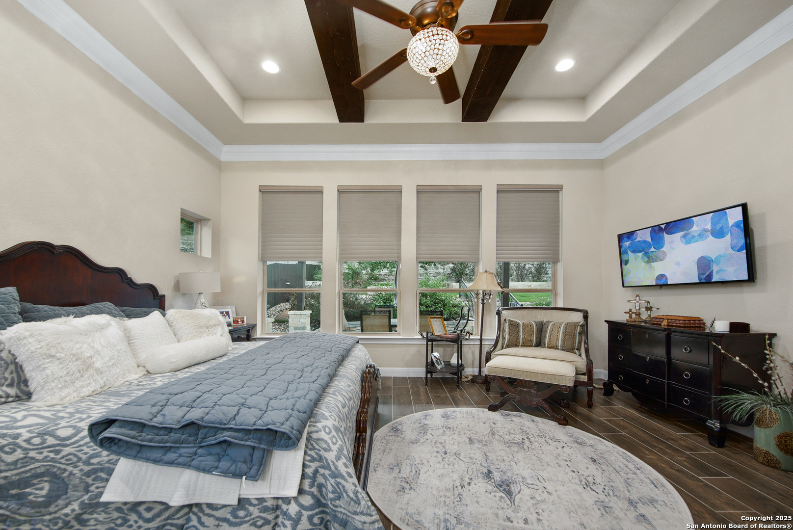 Luxury living awaits on this beautiful hillside lot with consummate back yard privacy. This David Weekly custom home ushers you into a grand open floor plan allowing the best of times for family and friends to gather. Enjoy visiting with your guests at the generous granite island with comfortable seating for 6 with the option to have a seated meal in the adjoining dining area and custom bar. Home chefs will delight in this gourmet kitchen with gas cooking opportunity, double ovens and oversized fridge that is surrounded by exquisite glass tile backsplash. Pool views invite you out to the covered patio to dine al fresco if you prefer and offers a gas grill and beverage center poolside. Immense privacy and lush plantings and landscaping enhance the custom pool and spa features. Inside, the owner's suite and 2 other bedrooms are all downstairs. Upstairs is a large gameroom/living room for the 4th bedroom and bath. This is a one owner custom build with tons of extras and upgrades. Don't miss this home in highly desirable Shavano Highlands.