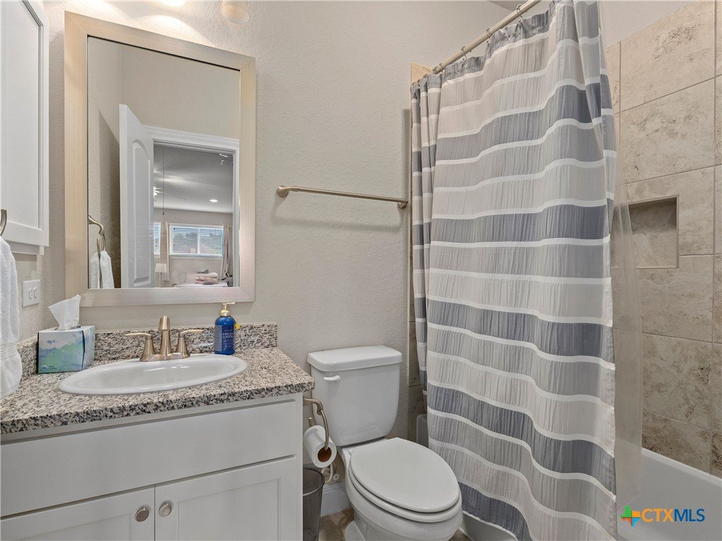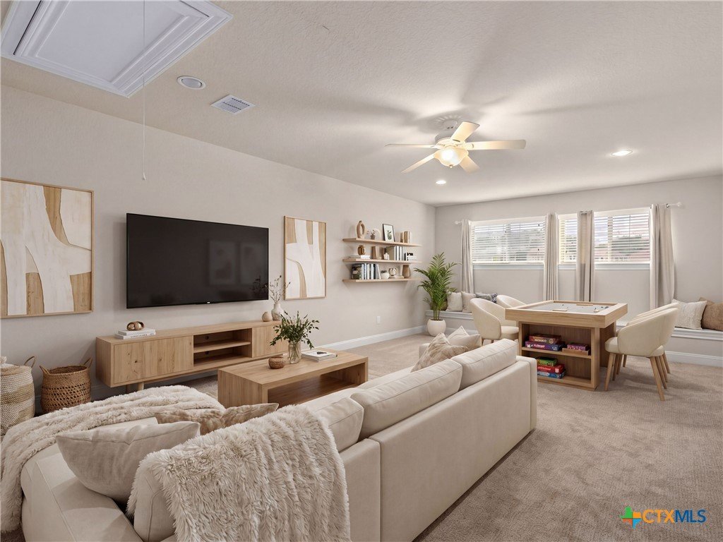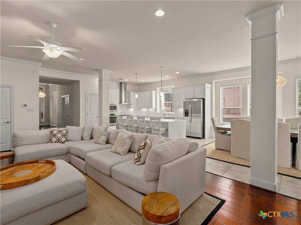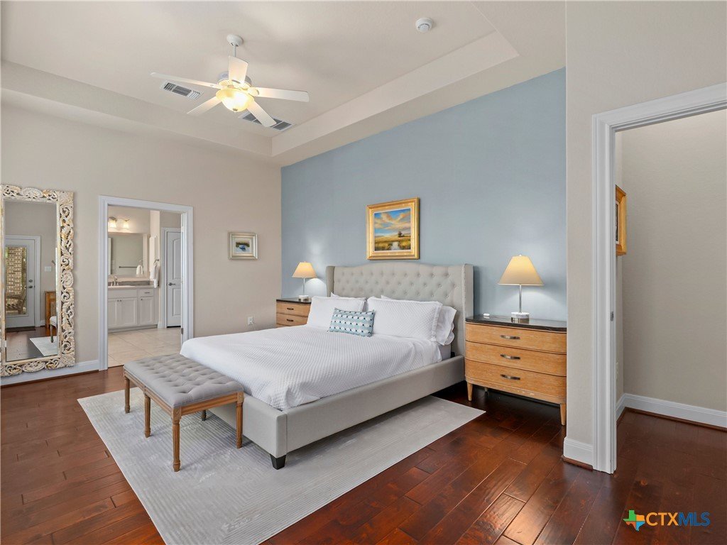 Positioned along the fairways of Cedar Creek Golf Course, this one-and-a-half-story residence delivers a seamless blend of elevated living and everyday ease. Natural light fills the open concept interior, where a spacious living area flows effortlessly into an expansive island kitchen complete with built-in appliances and generous prep space equally suited for entertaining and daily living. A private office offers a quiet, dedicated workspace, while the secondary bedrooms are thoughtfully set apart alongside an additional living area, creating a flexible layout that adapts with ease. Upstairs, a generous flex space lends itself to a media room, game room, or play area. The primary suite serves as a true retreat, featuring a wall of windows that capture serene backyard and golf course views. The en-suite bath is appointed with dual vanities, a soaking tub, and a separate shower for a refined, spa-like experience. Outdoors, the setting invites both relaxation and connection complete with a hot tub and an outdoor kitchen with built-in grill, all framed by privacy and picturesque fairway views. A three-car garage adds convenience, while the location offers quick access to Cedar Creek Golf Course and surrounding amenities. A well executed balance of space, comfort, and lifestyle set in a premier golf course setting.