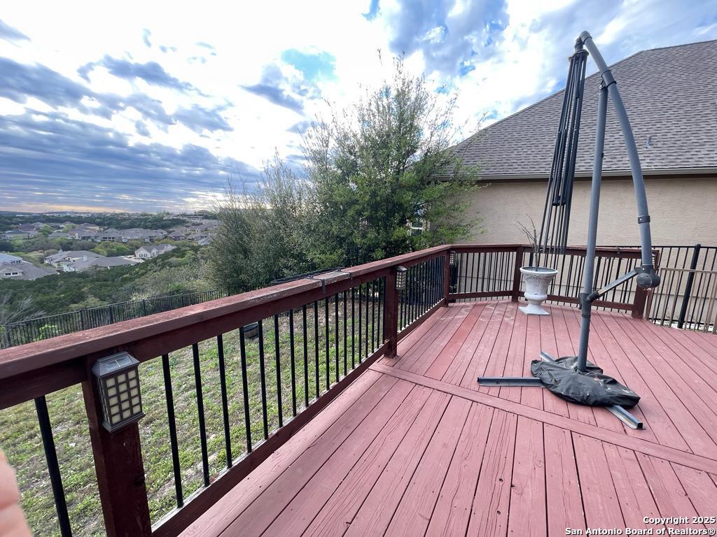 Beautiful home with breathtaking views of greenbelt, Upgraded kitchen with 42" cabinets & SS appliances, Open floor plan with wood shutters throughout, stone covered gas fireplace, Surround sound with in ceiling speakers,Wood flooring & tile downstairs, study with French doors, crown molding, ALL bedrooms up, carpet/tile upstairs, gorgeous views from huge master, good size rooms with utility upstairs, HUGE back deck with privacy fence ready for entertaining with views of golf course & greenbelt
