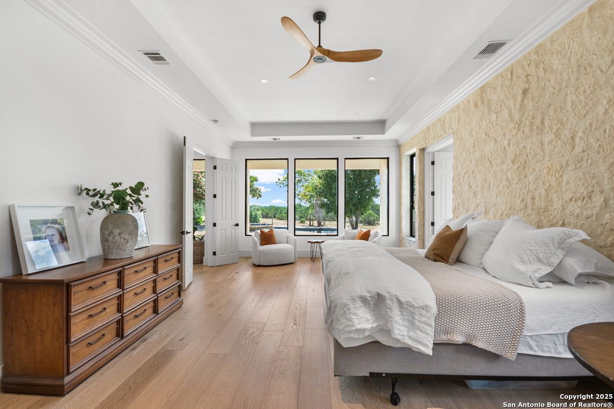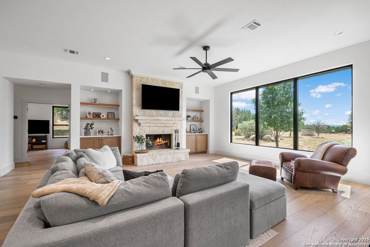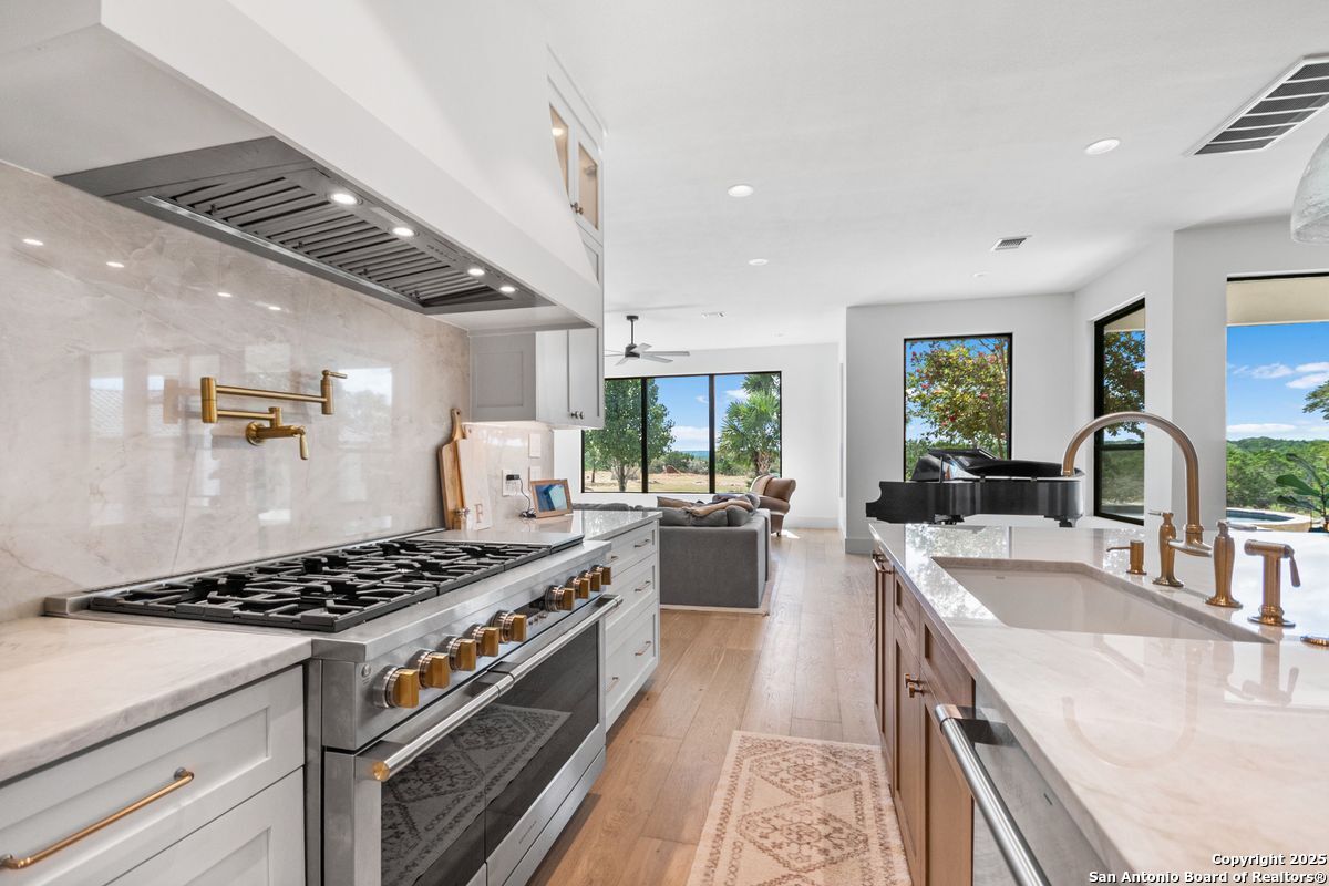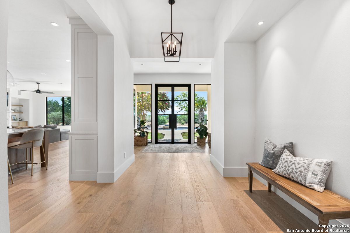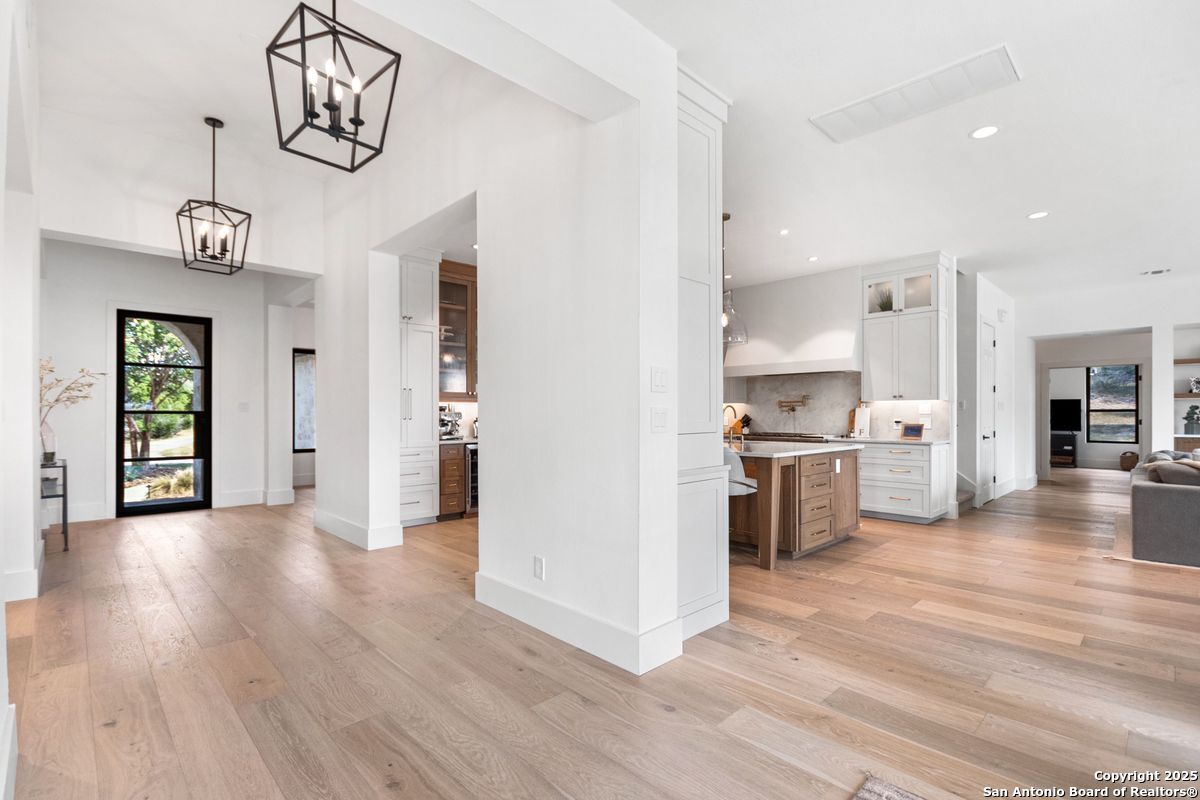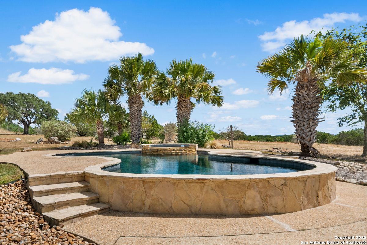 Perched atop a scenic hill, this newly remodeled transitional-style home offers wide open hilltop views, privacy, a gorgeous pool and a detached casita. Stucco and stone with all new windows and doors to frame the hills and invite in natural light. The detached casita sits adjacent to the main home, offering privacy for guests, in-laws, or use as a studio or office. It echoes the same transitional design elements for seamless cohesion. Inside, the home showcases wide-plank white oak wood floors throughout, offering a warm, neutral foundation that complements both contemporary and traditional elements. The color palette leans toward soft whites, warm greys, and subtle earth tones, creating a tranquil and airy feel. Open-concept design connects the kitchen, dining, and living areas, enhanced by recessed lighting, statement light fixtures, and views from every angle. The main home boasts 4 bedrooms and 3.5 baths as well as a separate office with built in custom cabinets, game room, and separate dining room all with beautiful design and attention to detail. Located in Cordillera Ranch and Boerne ISD schools.