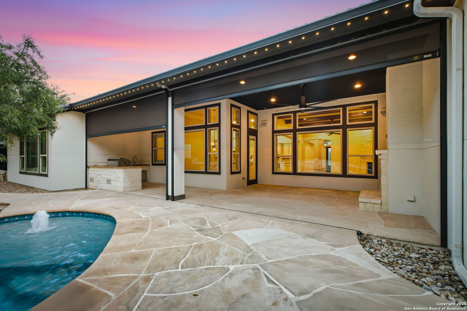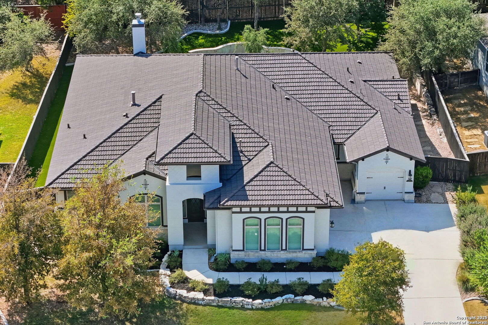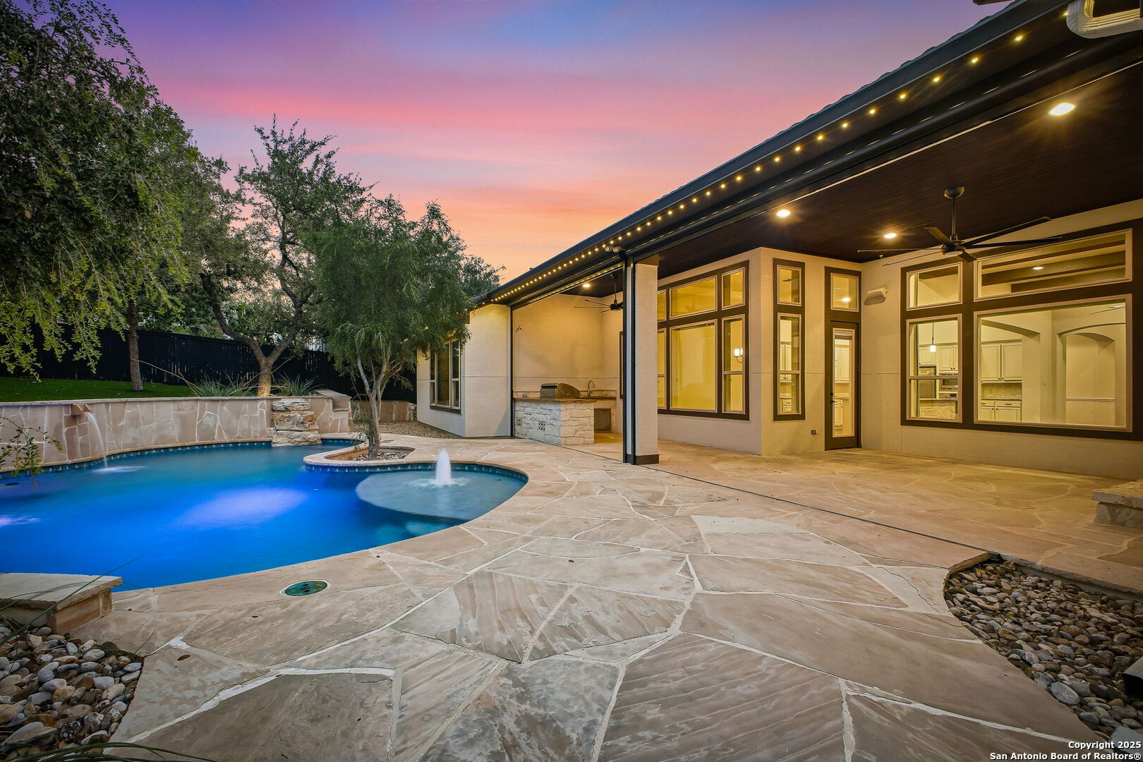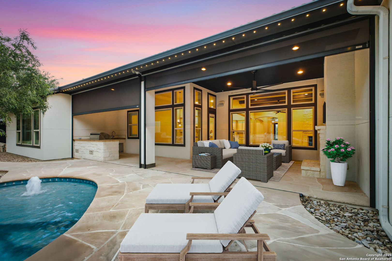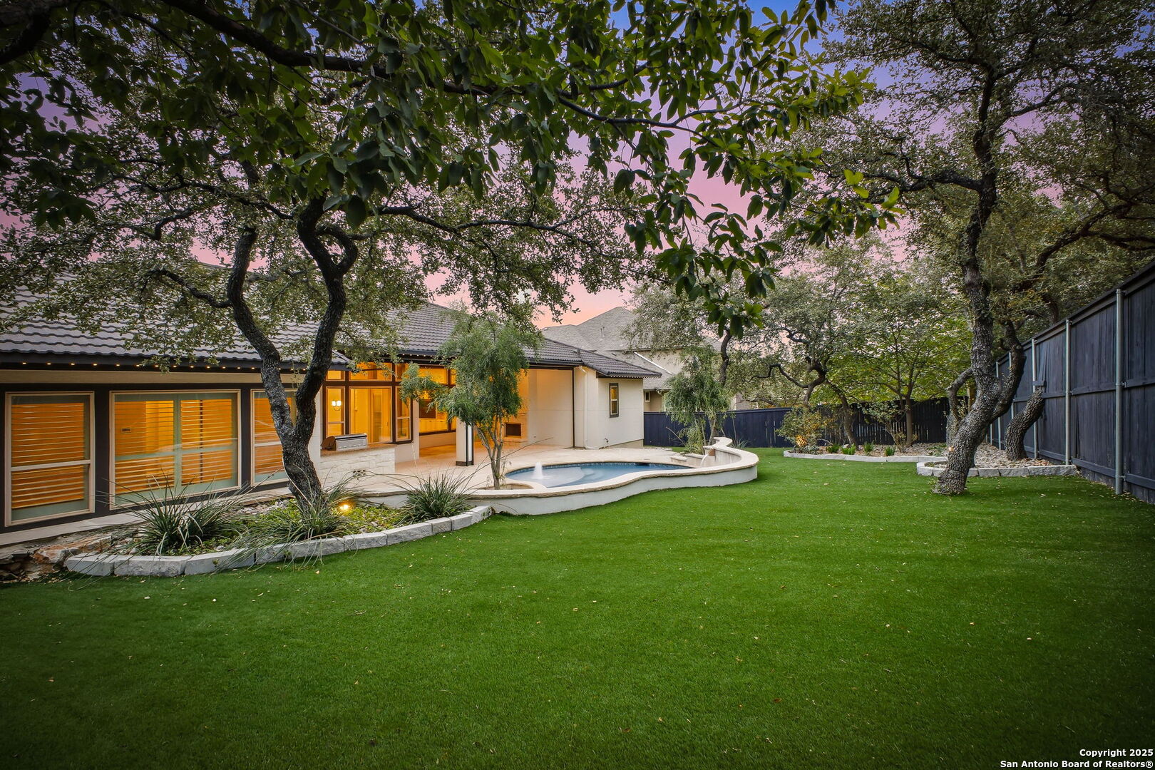 Situated on a majestic .32-acre private lot in the exclusive "Shavano Highlands" community, this one story elegantly designed residence offers a refined balance of luxury and comfort. Drive up to the stunning curb appeal with lush landscape, stucco exterior & Boral steel roof boasts elegant curb appeal. The thoughtful flowing layout showcases superior craftsmanship throughout, with wood/tile floors, plantation shutters, open floorplan, windows galore allowing natural light to flow through and detailed custom architectural elements at every turn. The chef's kitchen features stainless steel appliances, ample built-in cabinetry, gas stove/range perfect for both everyday living and entertaining. The primary suite is split from the other bedrooms & offers a serene retreat with a spa-inspired bathroom and 2 spacious walk-in closets. Walk out to an entertainers dream back yard with a huge covered patio, outdoor fireplace & kitchen w gas grill, stunning pool, low maintenance artificial turf & a generator for backup power. You will never want to leave home! This home is a very rare find in a rare community and won't last long so come and see it today!