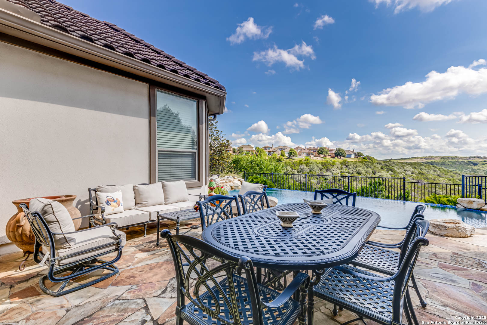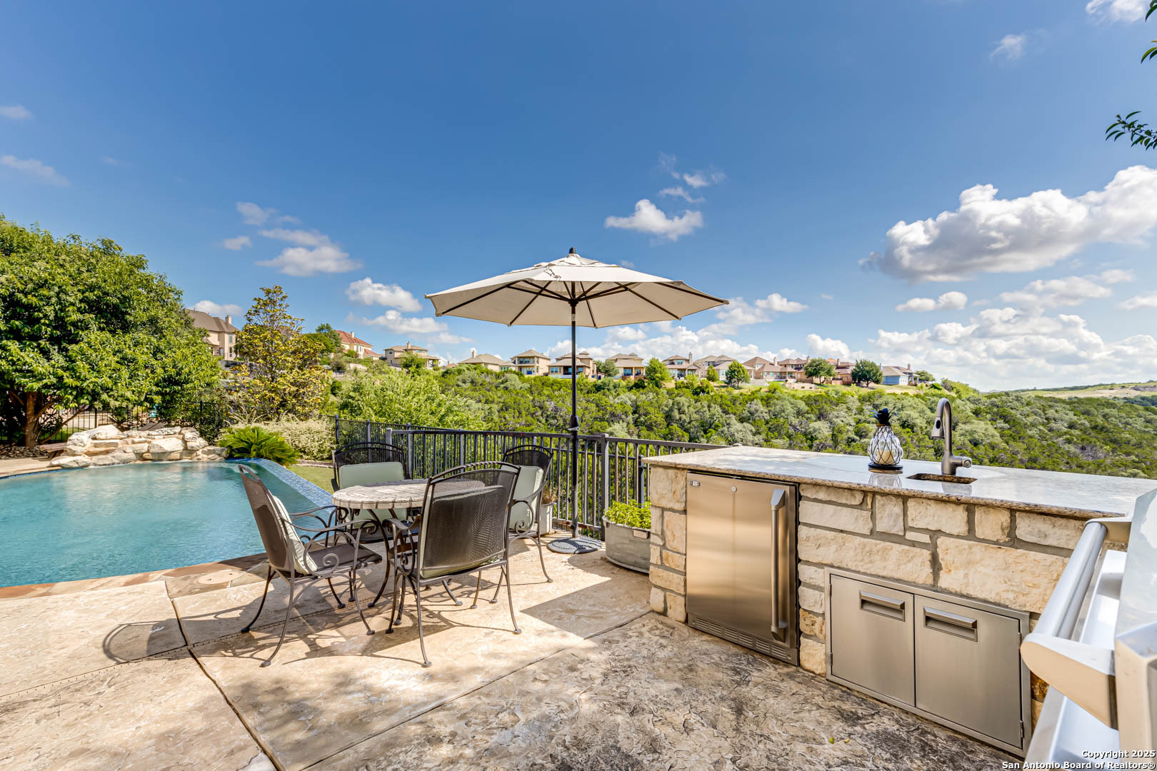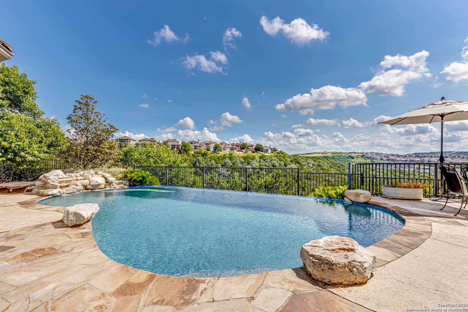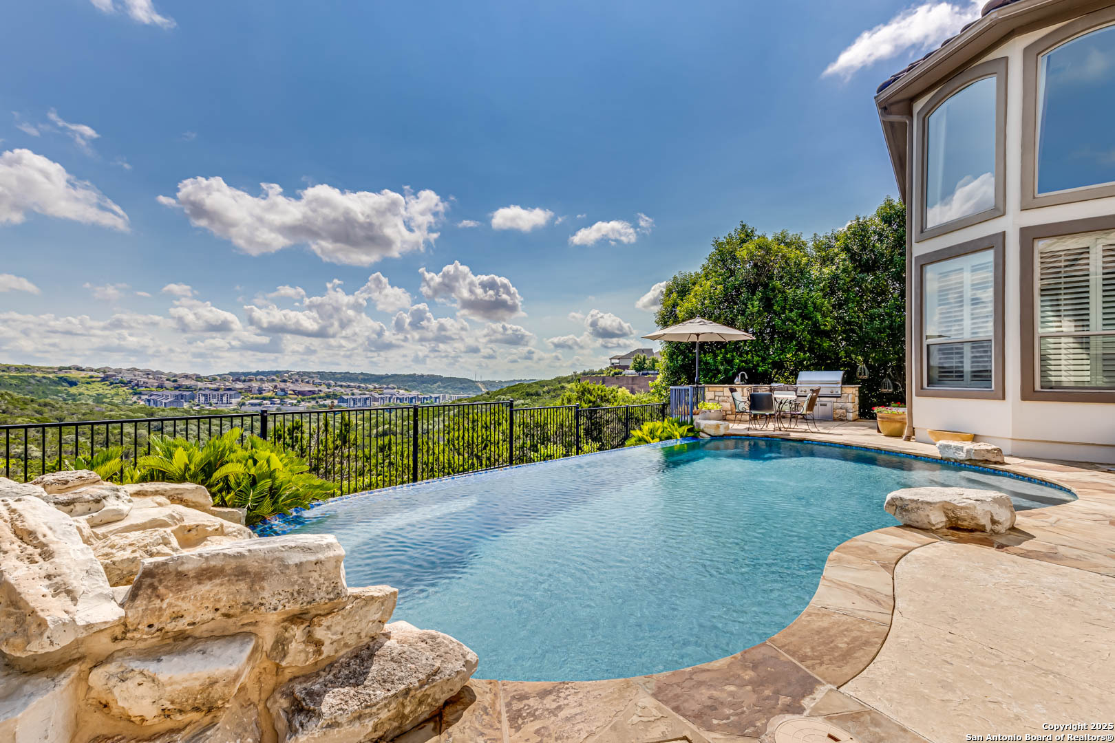 Step into luxury living with this Toll Brothers built estate located in the highly sought after gated community of Sonoma Verde. This is not your average listing. This is a statement home. With over 4500 square feet of elevated design and craftsmanship, 18210 Branson Falls is where elegance, comfort, and jaw dropping views come together in a way that stops buyers in their tracks. From the moment you pull up, the curb appeal sets the tone. Meticulously manicured landscaping, grand stone and stucco exterior, and a clay tile roof built to last decades. It is the kind of presence that commands attention. Walk through the front door and the high ceilings, natural light, custom plantation shutters and blinds, and grand staircase welcome you with serious wow factor. Every inch of this home was built to impress. It features four spacious bedrooms, plus a full sized dedicated office downstairs that offers a true work from home setup without sacrificing a bedroom. The luxurious primary suite is tucked away on the main floor and feels like a private retreat. The primary bath features dual vanities, a jetted tub, separate shower, and a walk in closet that can handle the wardrobe of someone who lives big. Upstairs, the home continues to deliver with a massive game room, oversized media room equipped with projector and screen, and three additional large bedrooms with ample closet space. The kitchen is a showstopper. Forty two inch cabinets, double oven, gas cooktop, expansive island, and open sightlines that make entertaining seamless. Whether it is a holiday dinner or casual breakfast, this kitchen is where everyone will want to gather. The open layout flows effortlessly into the living area, complete with fireplace, custom finishes, and a wall of windows looking out to your private slice of heaven. Now let's talk about the backyard. This is the one. Hands down one of the best views in all of San Antonio. You get bluff top scenery that stretches for miles, and it is all yours. Step outside and it feels like you have been transported to a luxury resort. The backyard features a custom pool with waterfall feature, built in outdoor kitchen, flagstone patio, wrought iron fencing, and lush landscaping that creates the kind of outdoor space that makes you want to entertain every weekend. Sunrise coffees, sunset dinners, late night swims. You can live outside here and never get tired of the view. Additional features include a water softener system, updated water heaters, main floor laundry room with natural light, private study with French doors, and a spacious three car garage. Every detail has been thought through. This home is not just beautiful. It is functional, practical, and built for someone who lives with intention and style. The Ridge at Sonoma Verde is one of the premier gated communities in the city. You are zoned to top tier NISD schools, minutes from La Cantera, The Rim, golf courses, and major employers, yet tucked away enough to enjoy peace and privacy. When people say location is everything, this is what they mean. This home checks every box. Luxury build. Immaculate condition. Elite neighborhood. And that view. This is not a listing that gets overlooked. This is the one they remember. Serious buyers only. This is where elevated living begins.